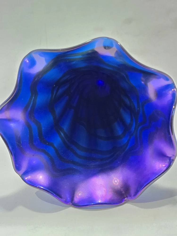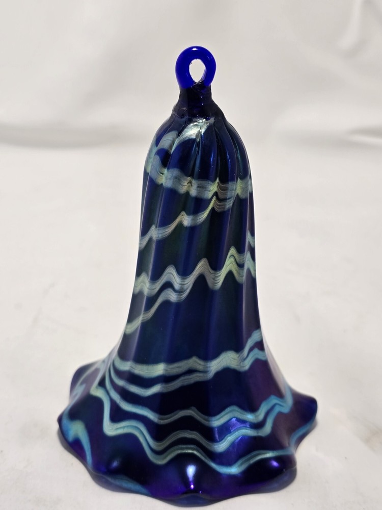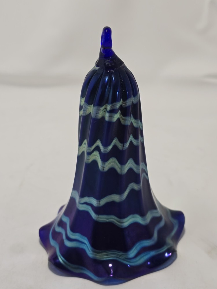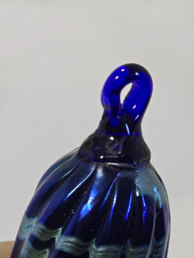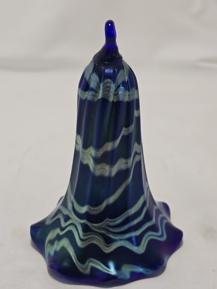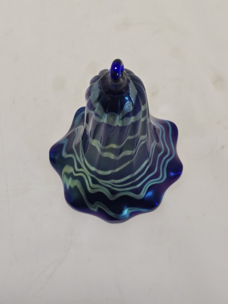 This stunning Lundberg Studios bell is a true work of art! The vibrant blue and green iridescence catches the light beautifully, and the hand-blown glass craftsmanship is exceptional. Made in California in 1994, it’s a unique collector’s piece in perfect condition. The elegant bell shape and signature add to its charm—ideal for display or as a conversation starter. Absolutely love it!