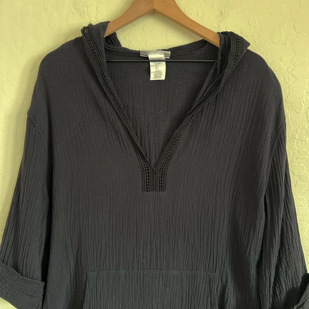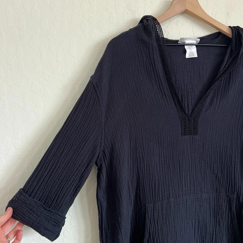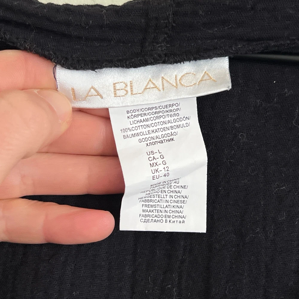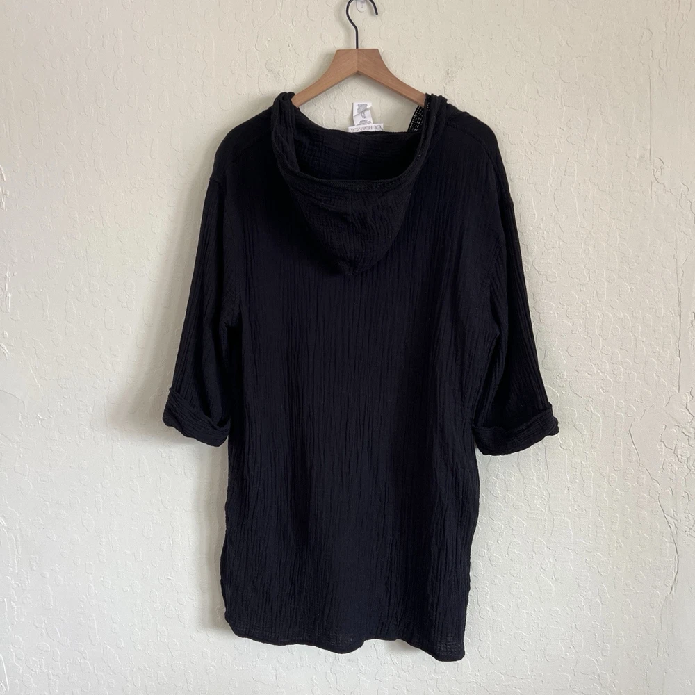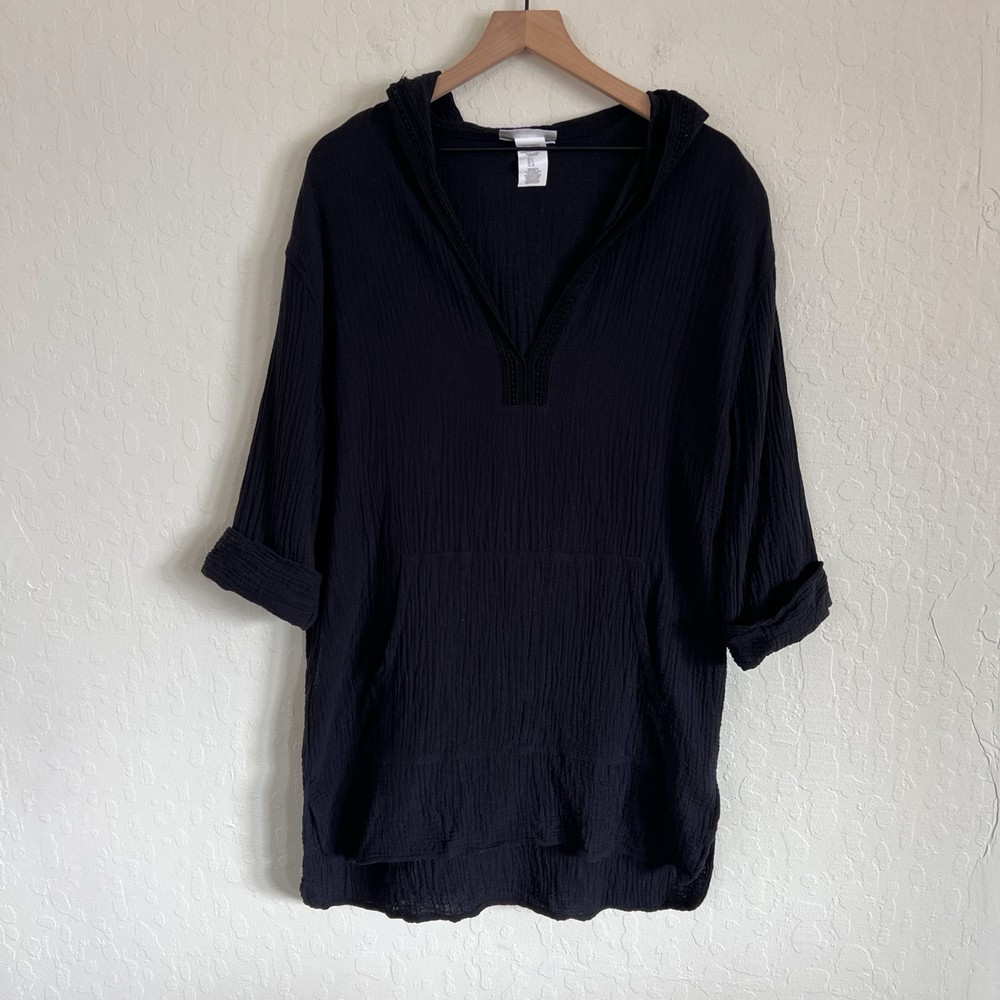 La Blanca Seaside Covers Hoodie Gauzy Hooded Swim Cover Up Tunic Large Black Good pre-owned condition. Size: Large Color: Black Material: 100% Cotton With all the same cozy comfort of your favorite hoodie, this swimsuit cover-up is perfect for throwing on post dip (or after the sun sets). The open neck sans drawstring makes for easy on and offs, with a longer length in back that provides all the coverage you need. Kangaroo pocket keep your hands warm but can also hold small items like keys or sunscreen. Hooded tunic Open neck Kangaroo pocket Longer length in back Tags: Classic, basic, swim, swim coverup, beach, beachy, resort, resortwear, vacation, cruise, pool, spring, summer, lightweight, breathable