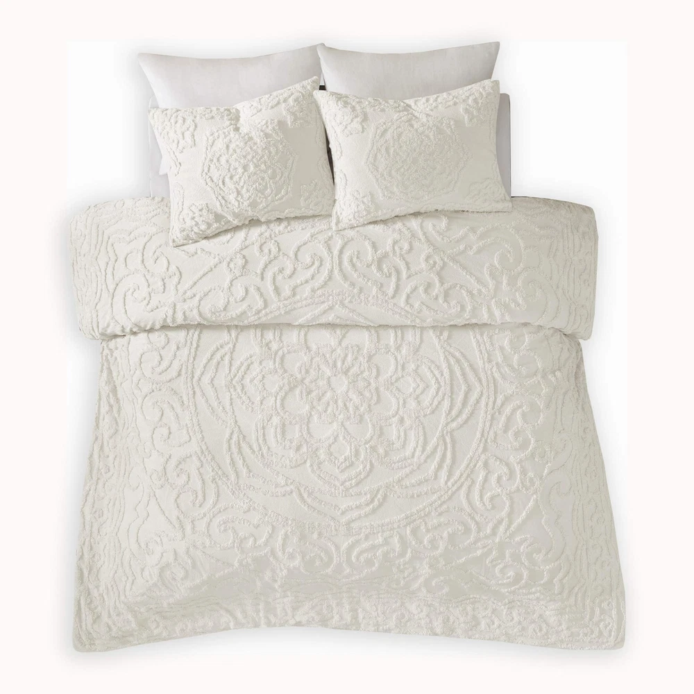 This duvet features a 100% cotton face and reverse with an elegant chenille tufted medallion design centered on top of the bed. Laetitia Tufted Cotton Chenille Medallion duvet cover provides a soft and alluring update to your bedroom décor. Cotton cover is OEKO-TEX certified to be free of any chemicals and harmful substance and equipped with 4 corner ties and button closure to secure the filled insert from shifting. Set includes: 1 Duvet Cover: 90"W x 90"L, 2 Standard Shams: 20"W x 26"L Care instructions: Machine washable; due to the nature of the chenille fabric, some shedding will occur naturally in the first 3-4 washes.
