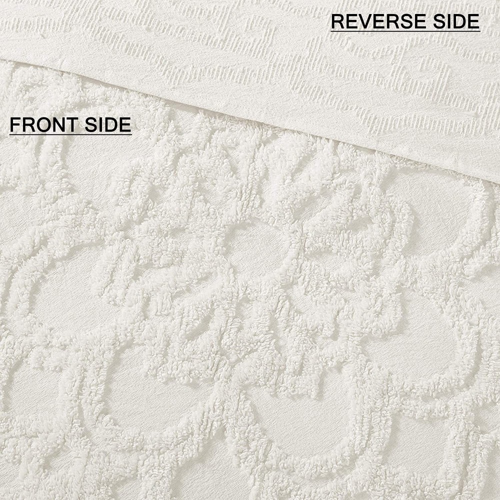 The Laetitia Tufted Cotton Chenille Medallion Fringe Coverlet Set provides an alluring shabby chic update to your bedroom. This globally inspired coverlet features a 100% cotton face and reverse with a tufted chenille medallion centered on top of the bed. A decorative fringe hem adds dimension, while 2 matching shams (1 in Twin/Twin XL) complete the boho look. Perfect for all season use, this bedding set is also OEKO-TEX certified, meaning it does not contain any harmful substances or chemicals to ensure quality comfort and wellness. Due to the nature of the chenille fabric, some shedding will occur naturally in the first 3-4 washes. Made with 100% cotton, this luxurious tufted chenille design, in an all-over geometric pattern, offers a soft texture and dimension to your bed Laetitia tufted cotton chenille medallion quilt set provides a soft and alluring update to your bedroom décor. Naturally breathable and lightweight cotton fabric that is Oeko-Tex certified to be free of any chemicals and harmful substance for a perfect all season bedding. Set Includes: 1 Coverlet: 90"W x 90"L, 2 Standard Shams: 20"W x 26"L Care instructions: machine washable