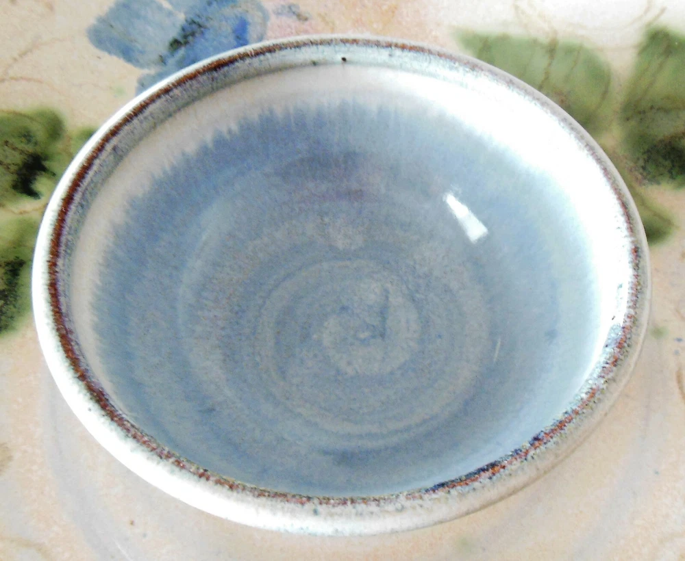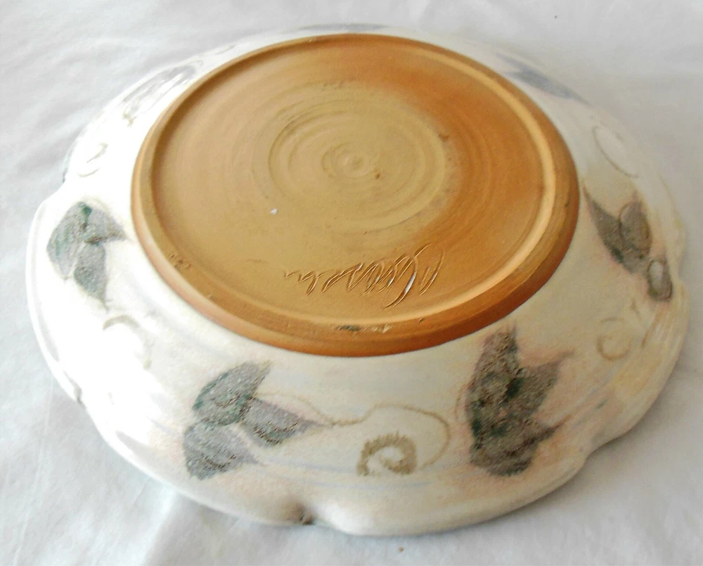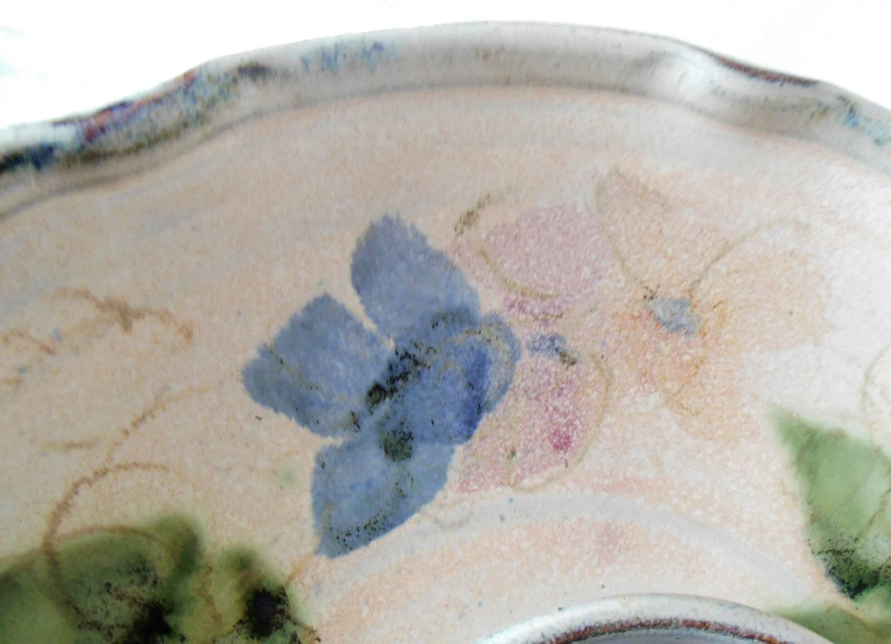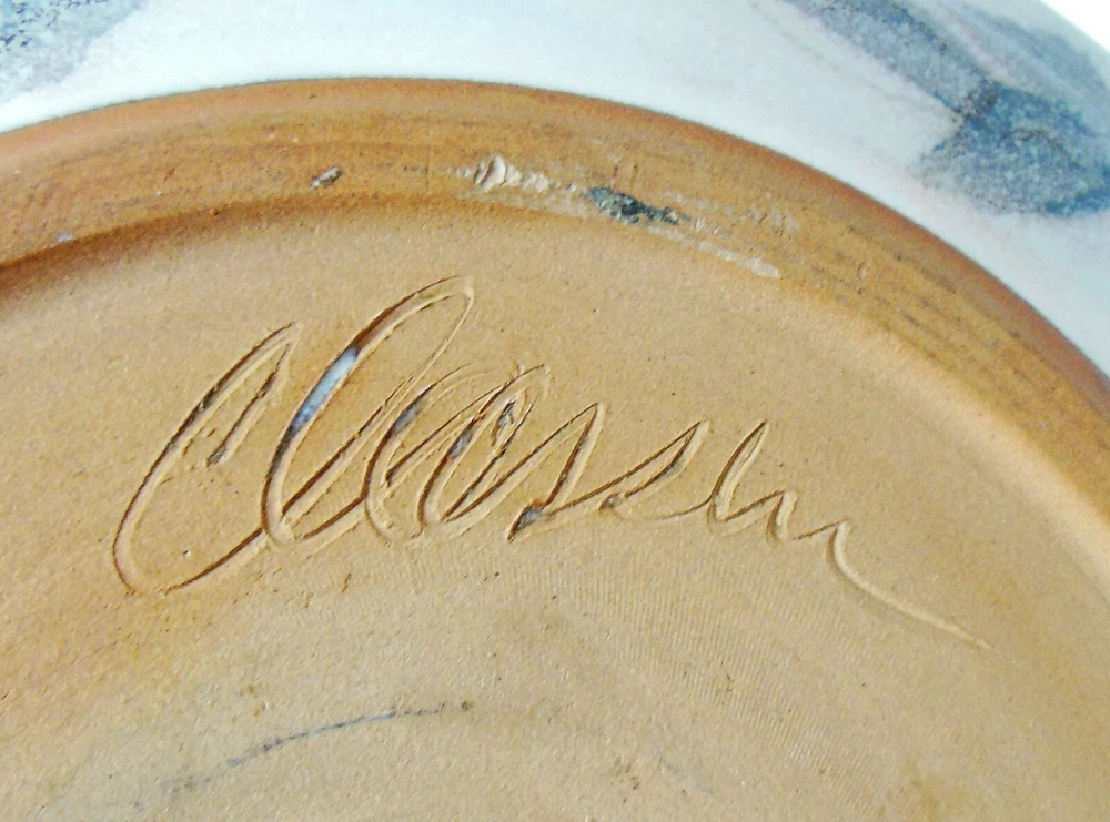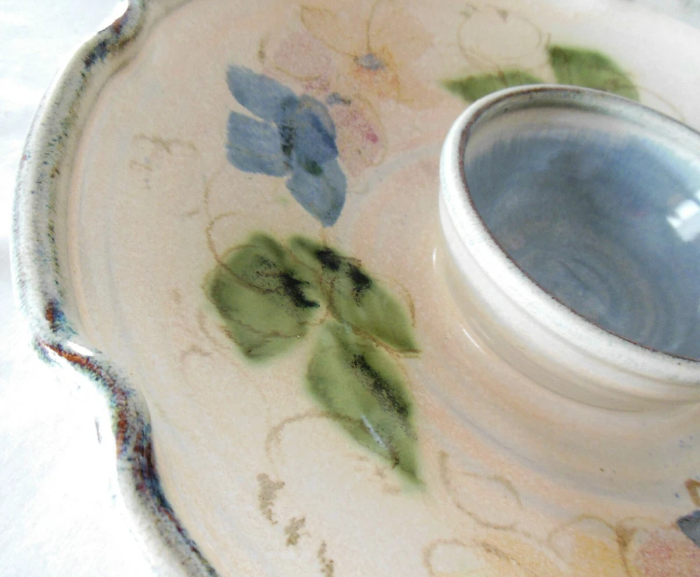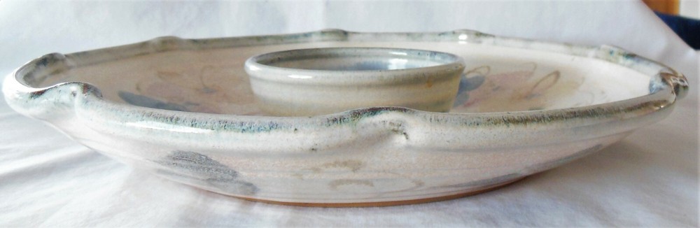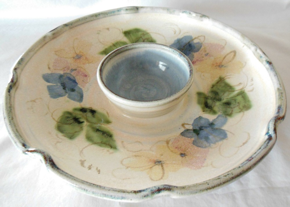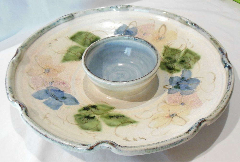 Large 1-Piece Art Pottery Chip N Dip Tray Blue & Green Signed Mary Classen For consideration is this large one piece art pottery chip and dip tray. It measures 13 inches in diameter, features a ruffled edge with a smoky gray rim, blue flowers with hints of soft pink flowers and green leaves on the inside and flowers and leaves on the outside of the bowl are in smoky gray. The dip bowl is solid blue and measures 4¾ inches in diameter The back is signed “Classen”. There are no nicks, chips, cracks, repairs, scratches, discoloration or crazing noted. Buyer will pay shipping on a large 5 pound box. Thank you for looking! NOTE: Mary Classen is a native of Sacramento, California. She has been a full time potter for 38 years. Collectors of her functional ware are attracted by her designs that incorporate floral and fruit motifs that reflect her own love of gardening and flower arranging. Mary’s work is cone 5 electric fired although she does a limited amount of cone 10 gas for her own enjoyment.
