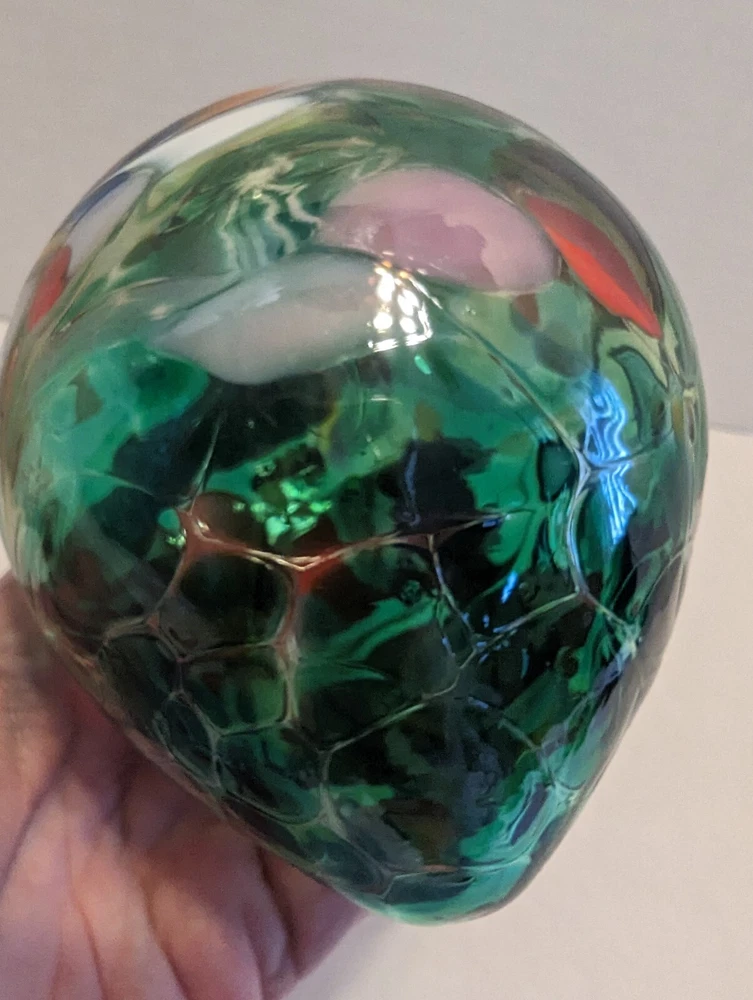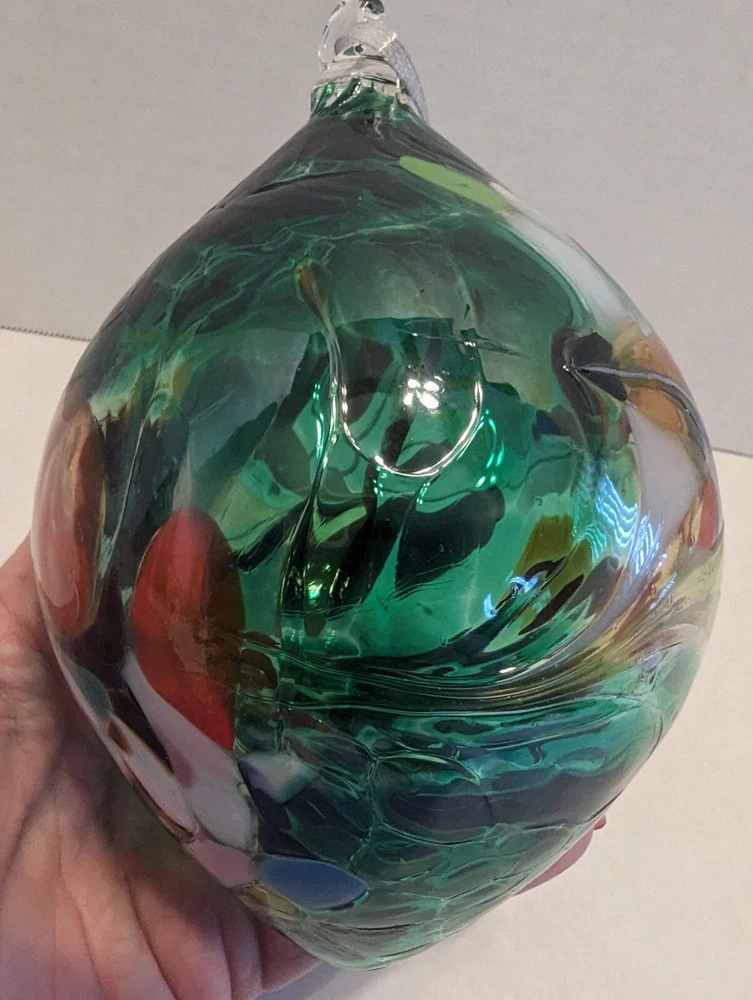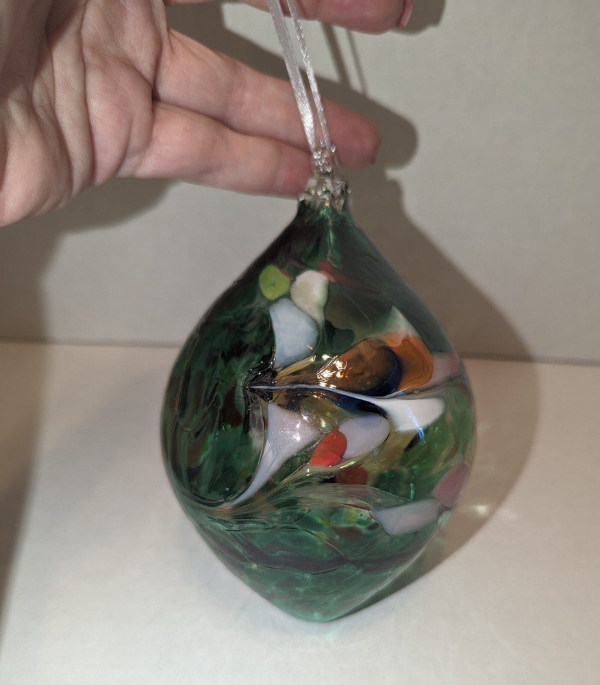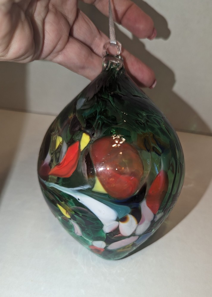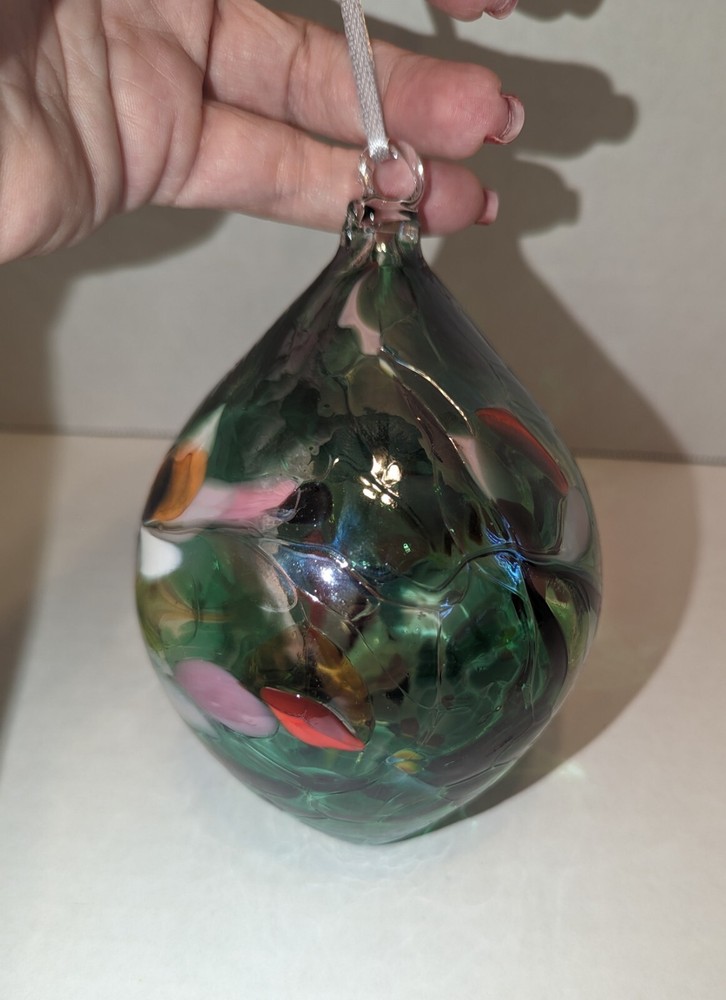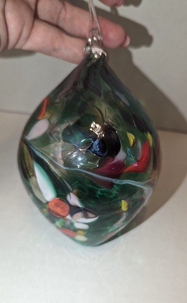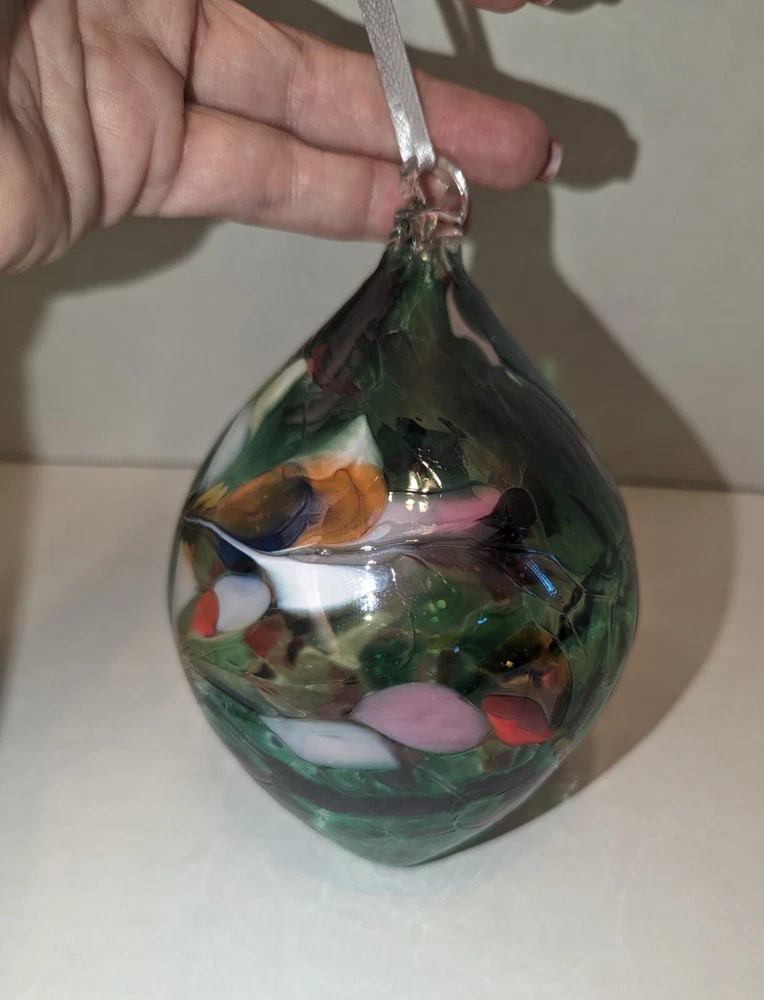 Add a touch of elegance to your festive decor with this exquisite hand-blown glass ornament. Boasting a stunning floral pattern in a vibrant mix of colors, this teardrop-shaped piece is a true testament to the beauty of art glass. The unmarked ornament stands at a proud 6 inches in height, making it a striking addition to any home decor. Crafted using traditional techniques, each ornament is a unique creation, reflecting the artist's touch and the warmth of the glassblowing process. Its delicate yet robust construction is a testament to the skill of the artisan, and the multifaceted colors ensure that it catches the eye from every angle. This piece is not only a decorative item but also a small work of art that can be cherished for years to come.