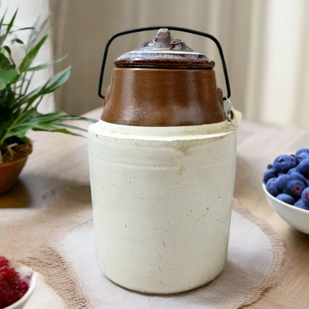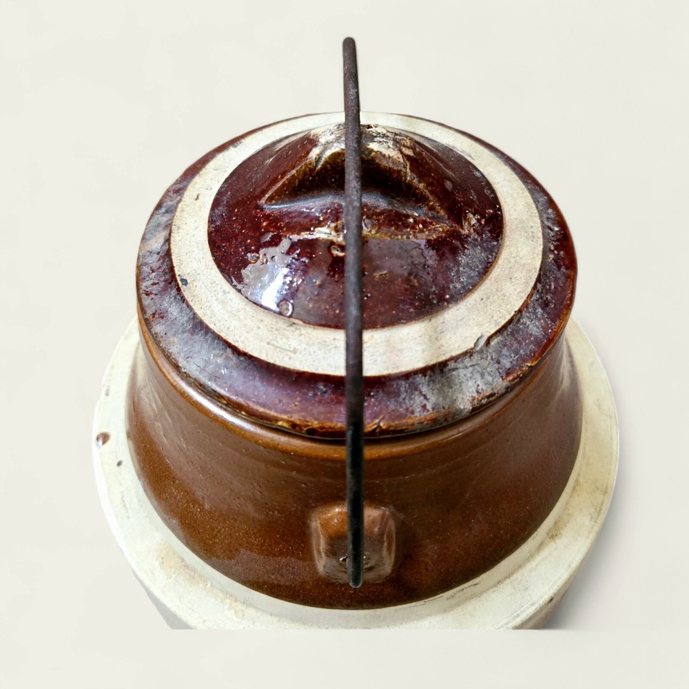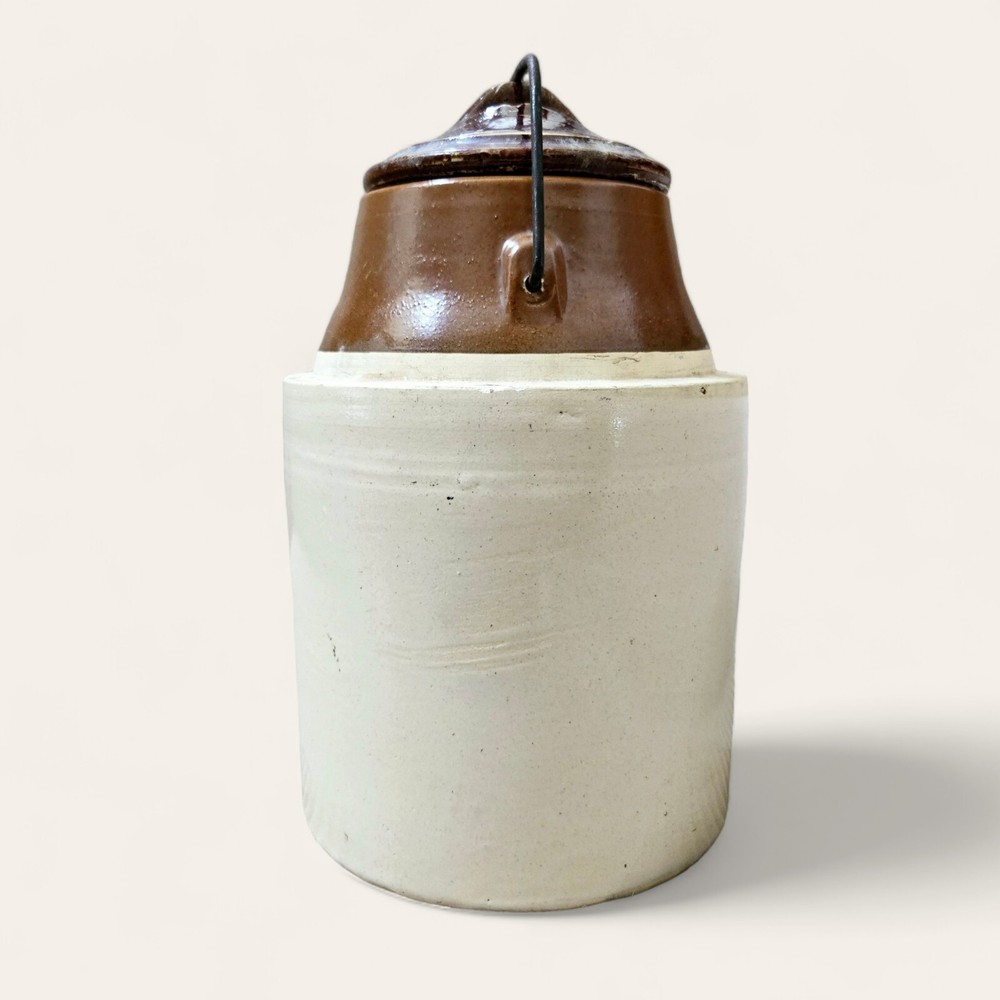 Pickling or Canning stoneware crock jar with lid. Dark brown dip glaze. Strong lid clamp holds tightly. 11.5 in tall 7 in diameter Great vintage condition. Rustic Country Farmhouse Primitive Neutral kitchen.