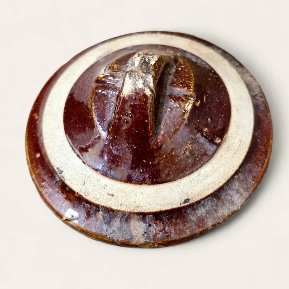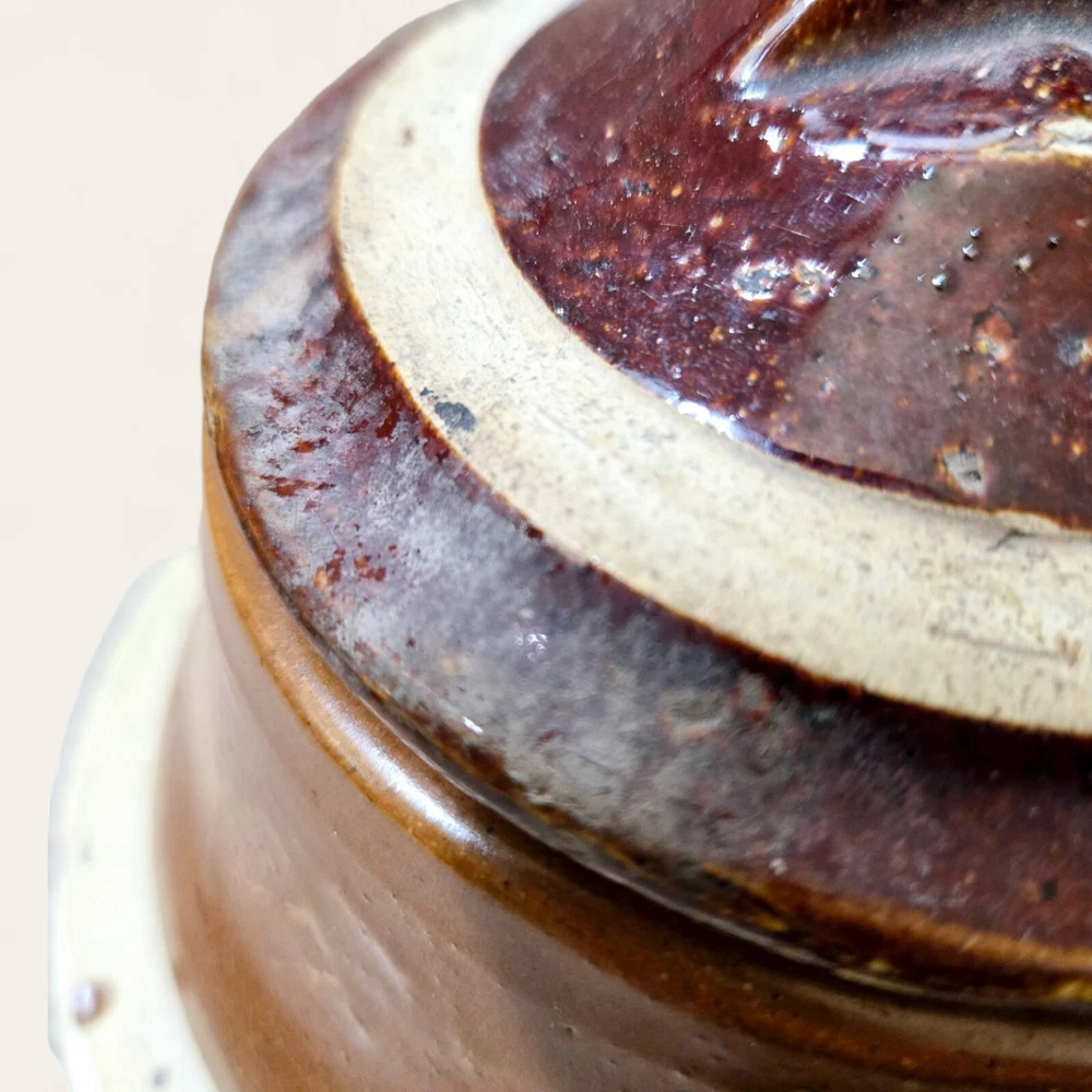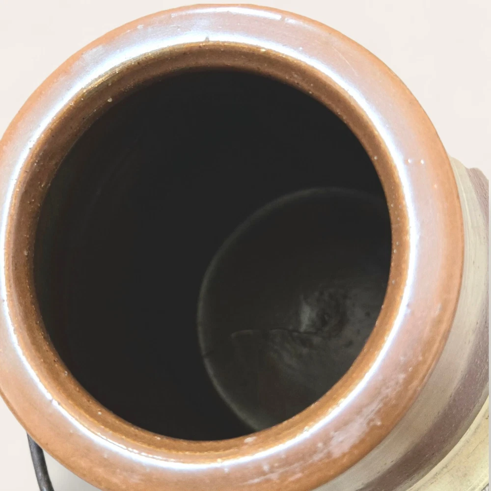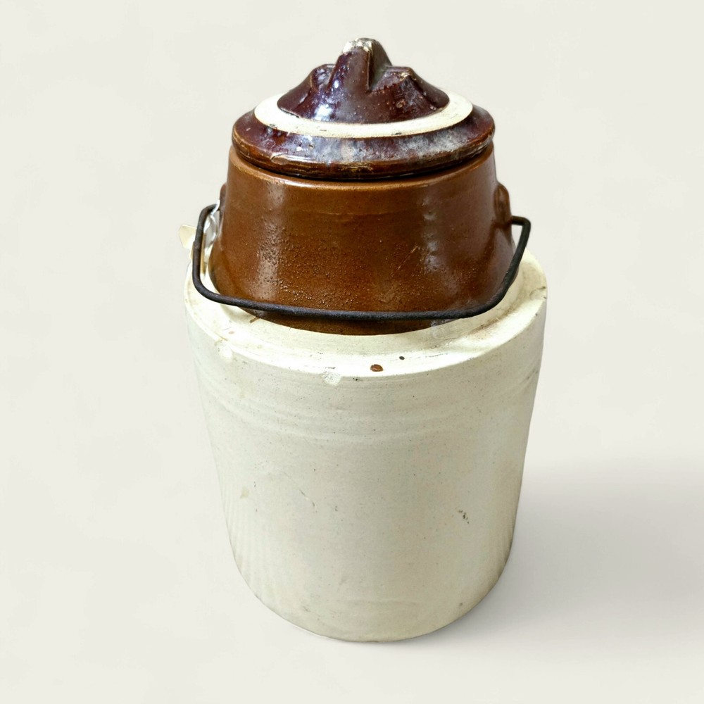 Pickling or Canning stoneware crock jar with lid. Dark brown dip glaze. Strong lid clamp holds tightly. 11.5 in tall 7 in diameter Great vintage condition. Rustic Country Farmhouse Primitive Neutral kitchen.