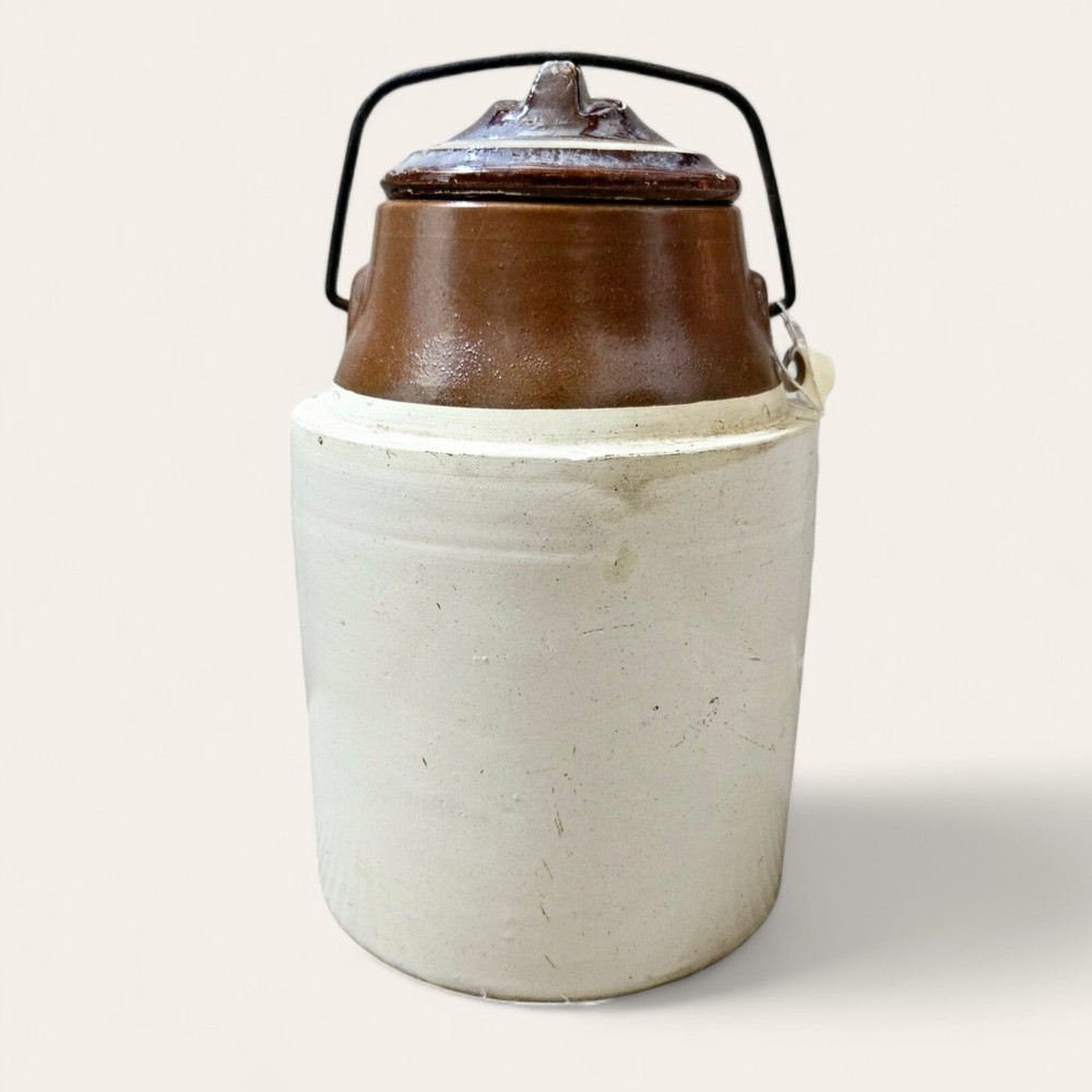 Pickling or Canning stoneware crock jar with lid. Dark brown dip glaze. Strong lid clamp holds tightly. 11.5 in tall 7 in diameter Great vintage condition. Rustic Country Farmhouse Primitive Neutral k...