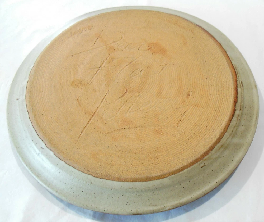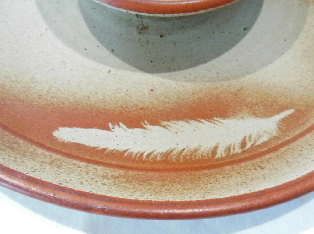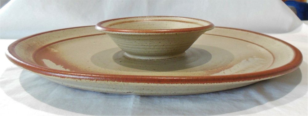 Large Art Pottery 1-Piece Chip N Dip Tray Brown with Feathers Signed 15” For consideration is this vintage art pottery one-piece chip and dip tray made in California, in the 1980s. My 85 year old mother purchased this on a family visit to Twain Harte or Sonora, California, and the potter’s place was out in the country. She recalls that he had his own pottery shop and kiln, and he probably sold his pottery from a booth for the holidays. My family visited this place whenever they got together. This chip and dip tray features the outlines of 2 feathers around the rim and it is tan with brown accent lines. The back is signed “Deer Hat Pottery” of which there is no information available online. It measures 15¼ inches in diameter and 1½ inches tall. The bowl height measured from the inside of the tray measures 2 inches tall and 6½ inches in diameter. It is in excellent vintage condition with no problems noted. Buyer will pay shipping on a large 8 pound box. Thank you for looking!