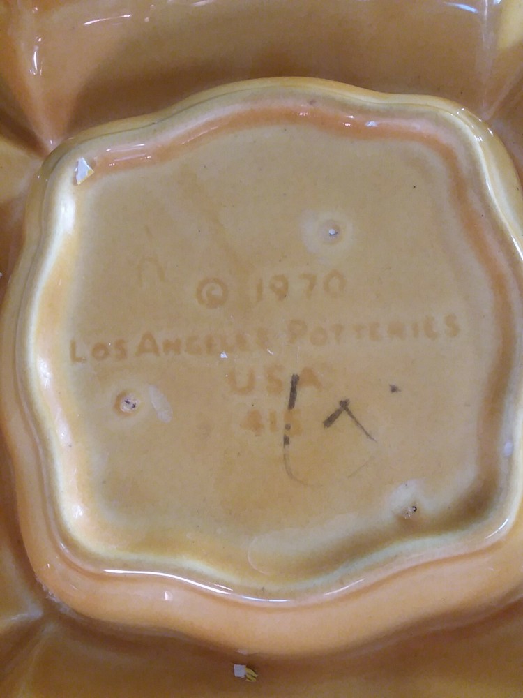 This is a large, beautiful vegetable dip tray, Vintage 1970 Los Angeles Potteries # 415. Measures 14 " Across and 1 3/4" Deep. Very good condition considering its age. Shipped with USPS Priority Mail.