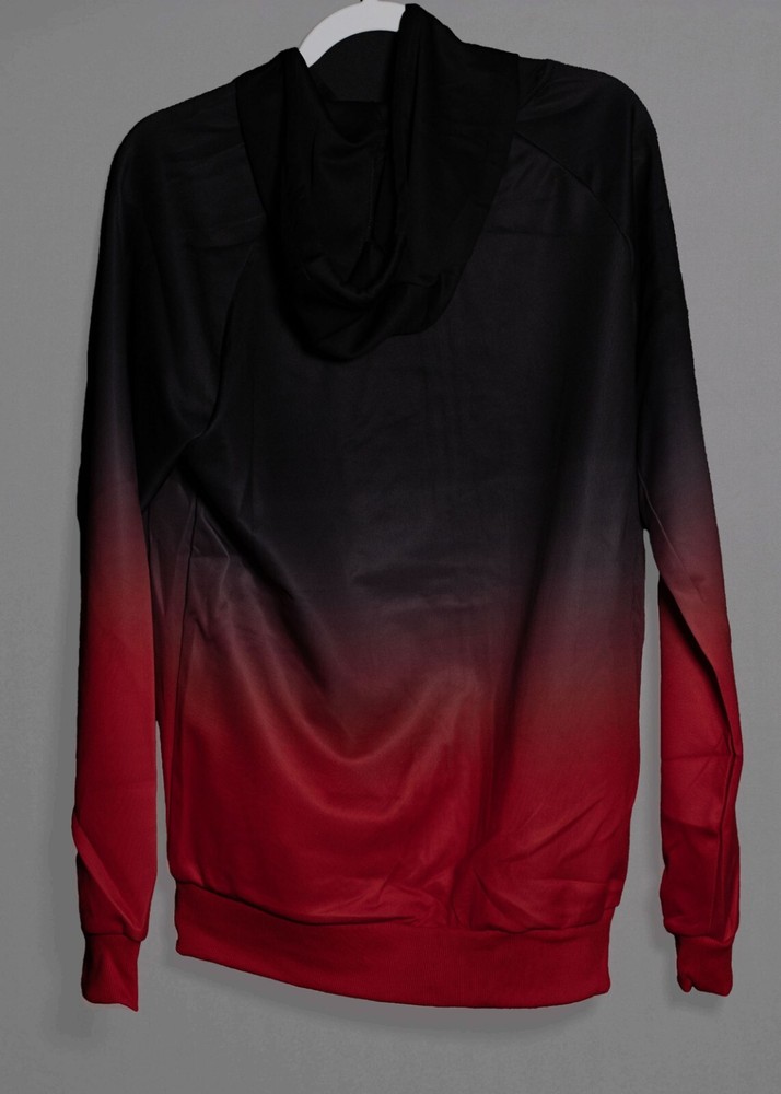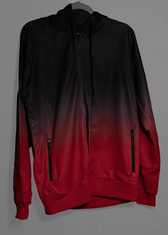This is a men's full zip hoodie from XS Apparel, new in package, never worn, and with tags. The hoodie is dip-dyed in black and red, giving it a colorful theme. It is available in size L and is a regular fit. The style of the hoodie is casual and comfortable, perfect for activewear.