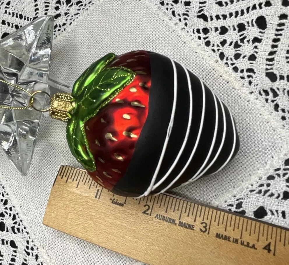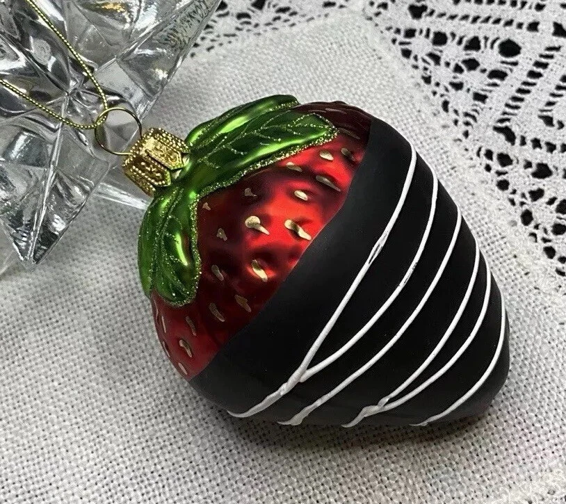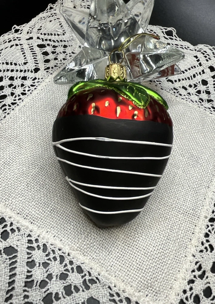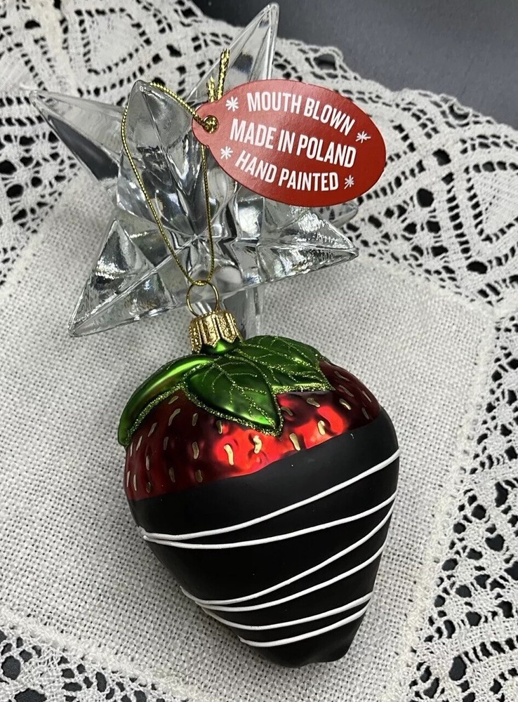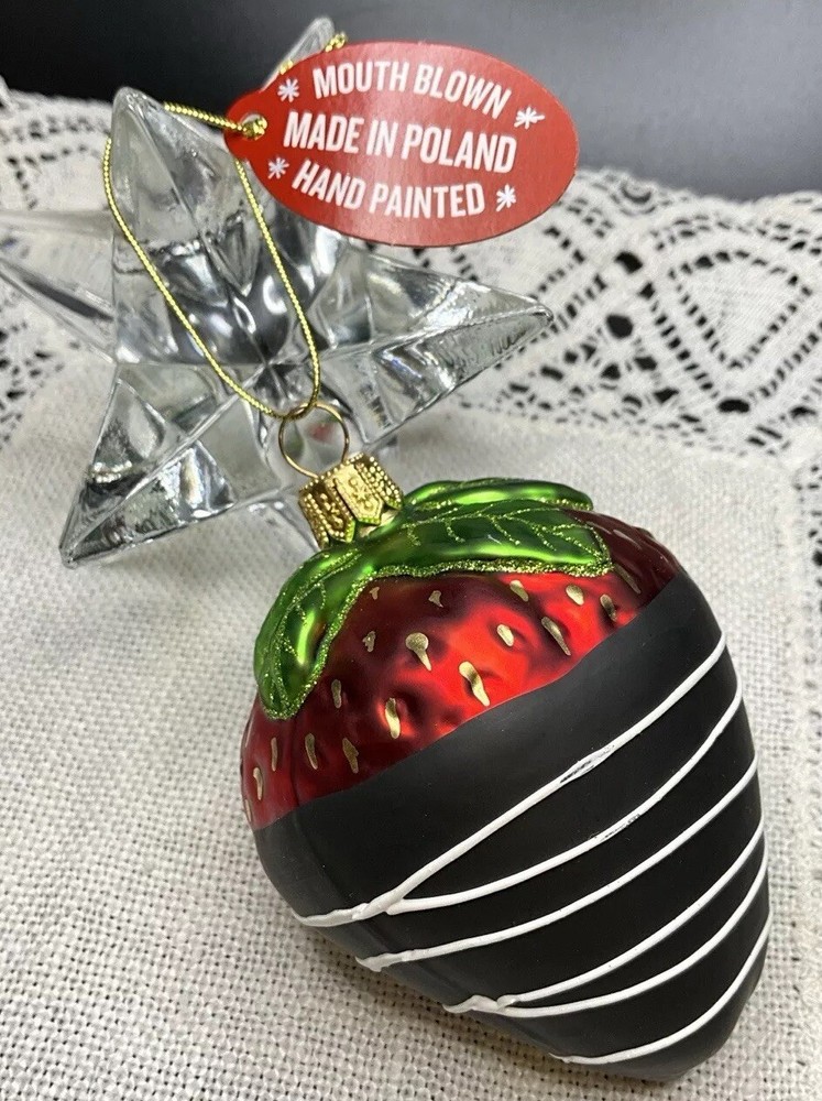 Offered here is a beautiful Made in Poland, mouth blown, hand painted, mercury glass Strawberry Ornament. It is very neatly and authentically painted. It is in brand new condition with its tag and has no cracks, chips, finish or paint loss or imperfections. Measures 3.5 inches tall including hanger cap. Please feel free to contact me with any questions. Thank you for your interest!