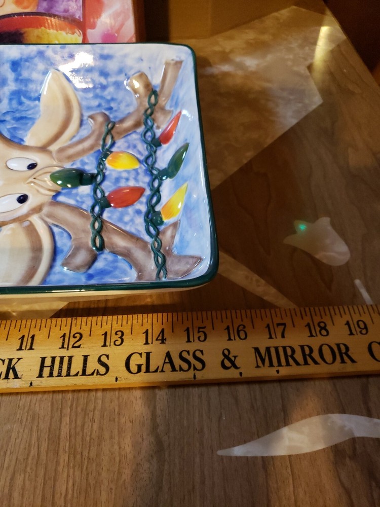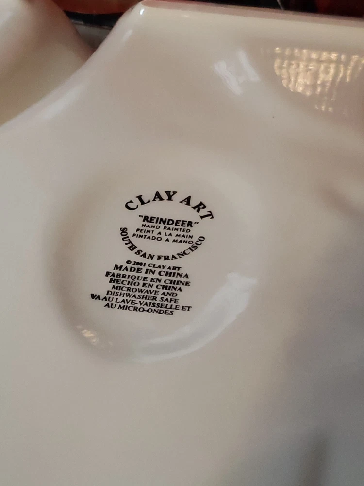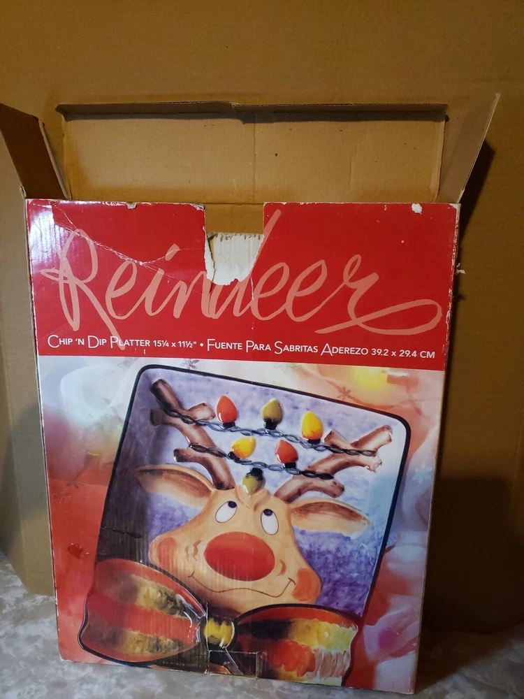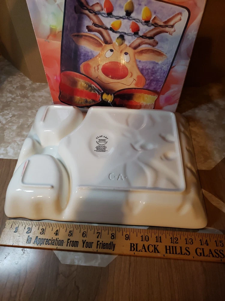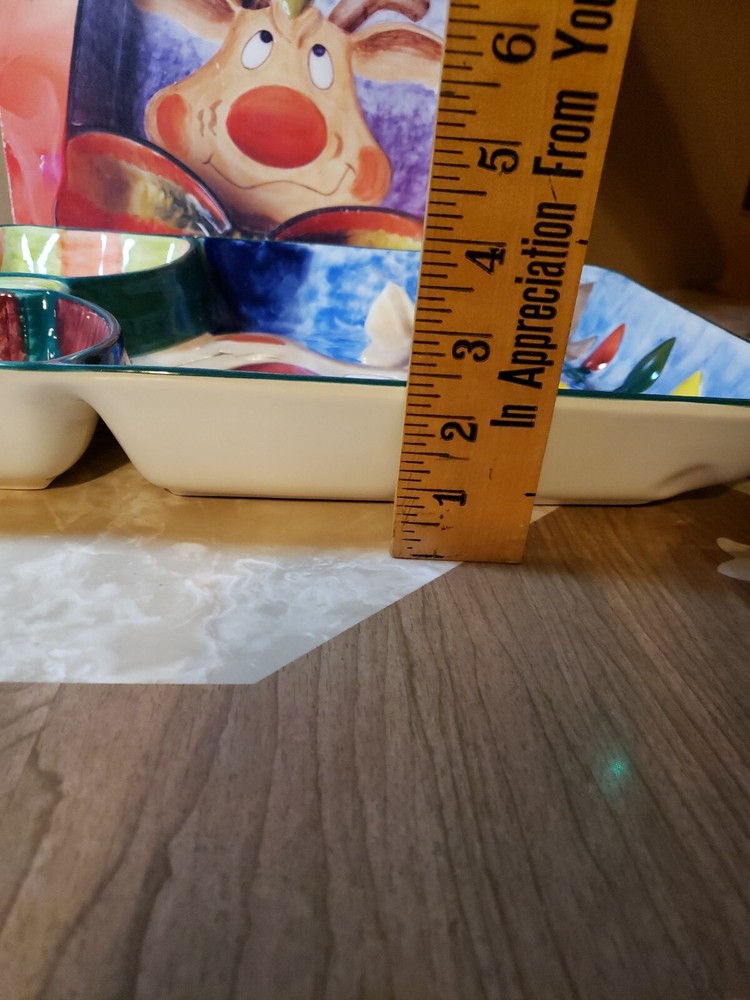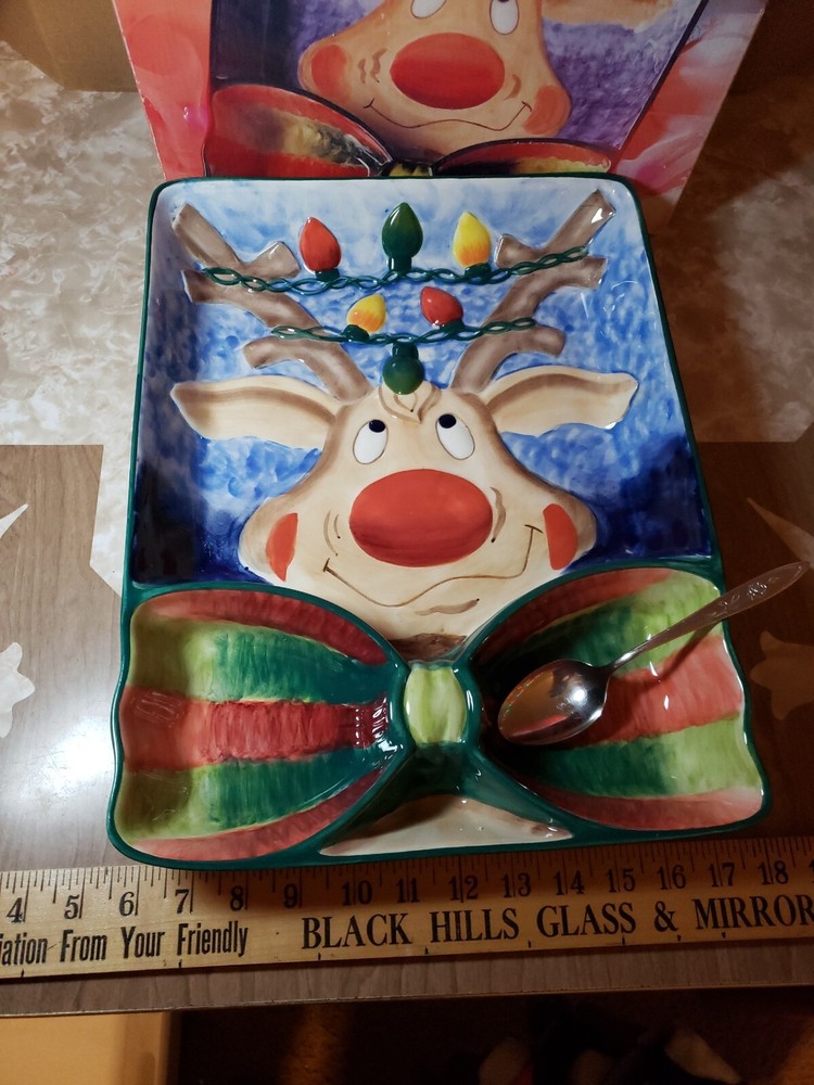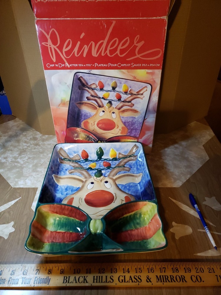 Nice Large Christmas Clay Art Reindeer Chip N Dip Divided Platter - 15 1/4" x 11 1/2". Great size for a party. Nice big portions. Really cute expression on reindeer. I do combine shipping so check out my other Christmas & vintage items. I choose the cheapest shipping method so if you want it faster, let me know BEFORE you pay & I will get you an invoice with adjusted shipping costs.