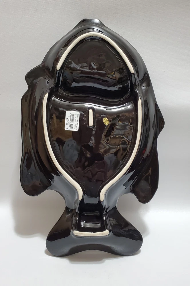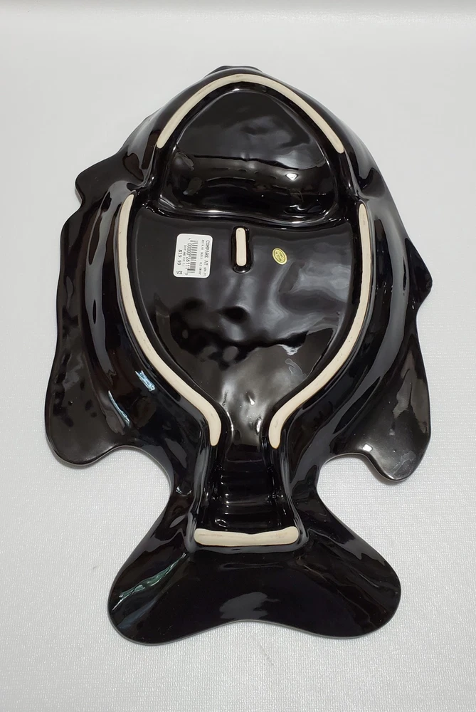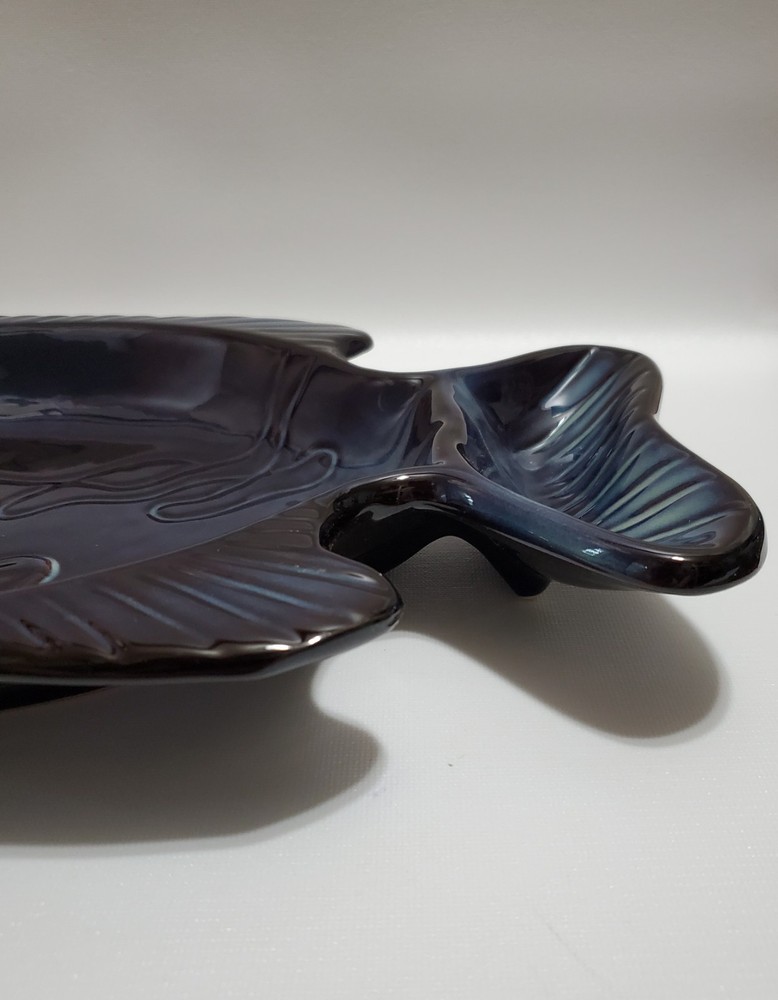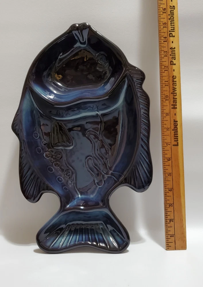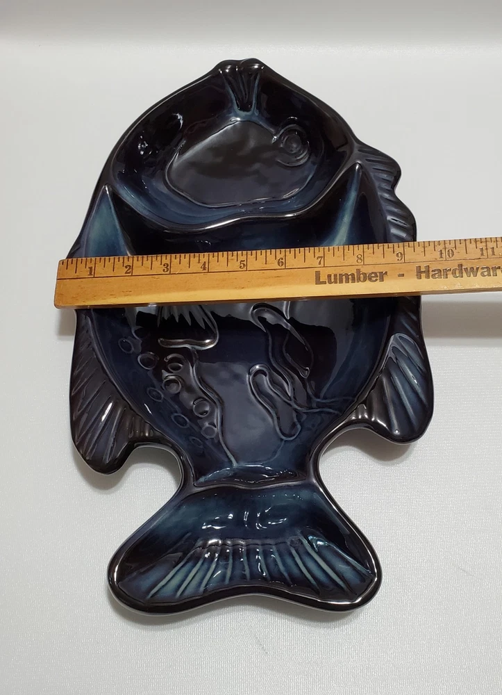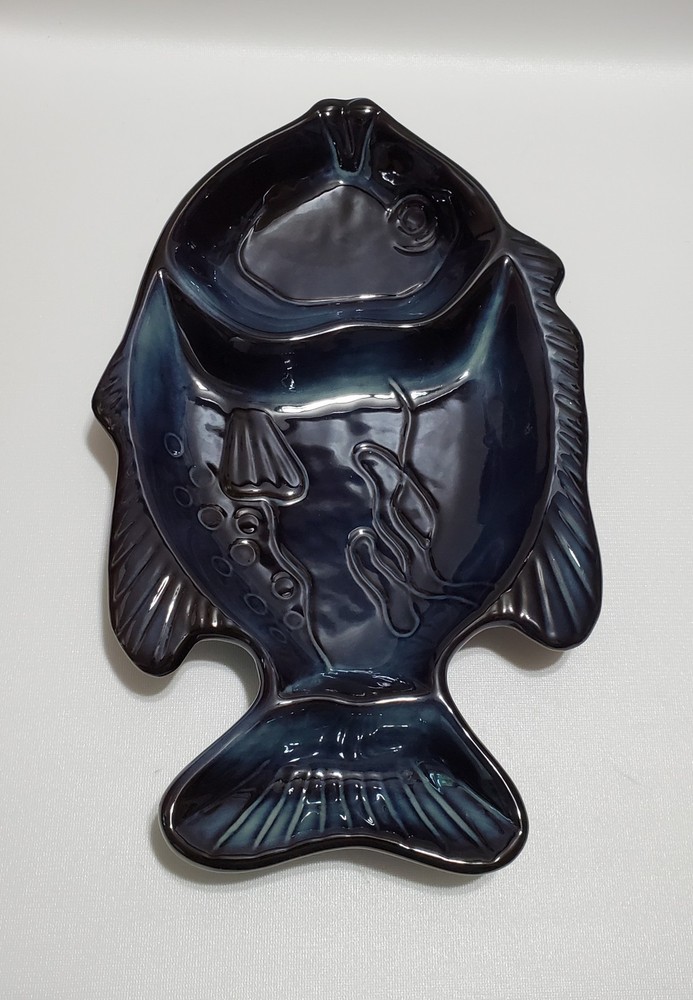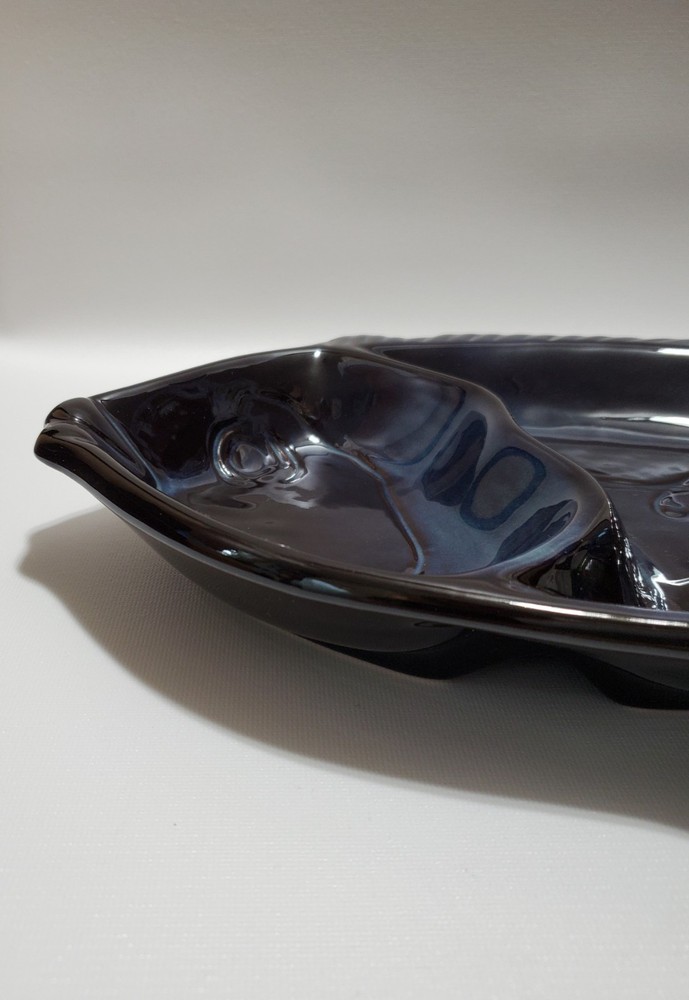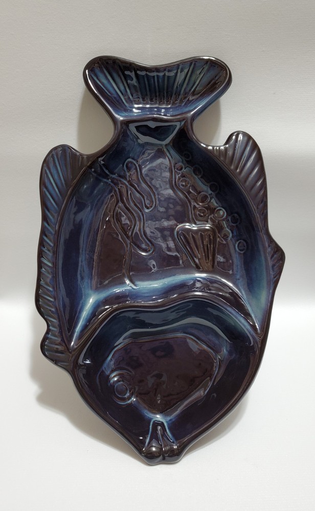 This is a fun, fish-shaped divided dish that's perfect for serving a variety of foods, and dips at any party! Made in China, this stylish, dark blue glazed ceramic dish is a quality piece that features 3 sections, and is in excellent condition. Measures 16" long x 9.5" wide x 2" tall. This delightful dish is sure to look stunning on your table!