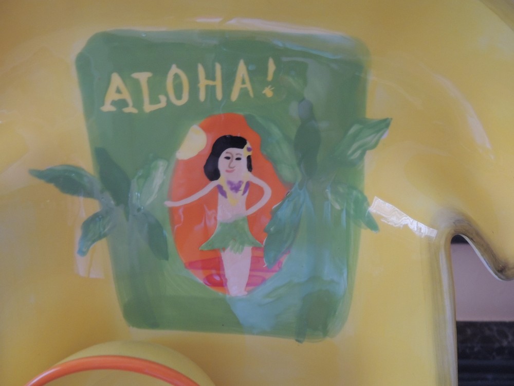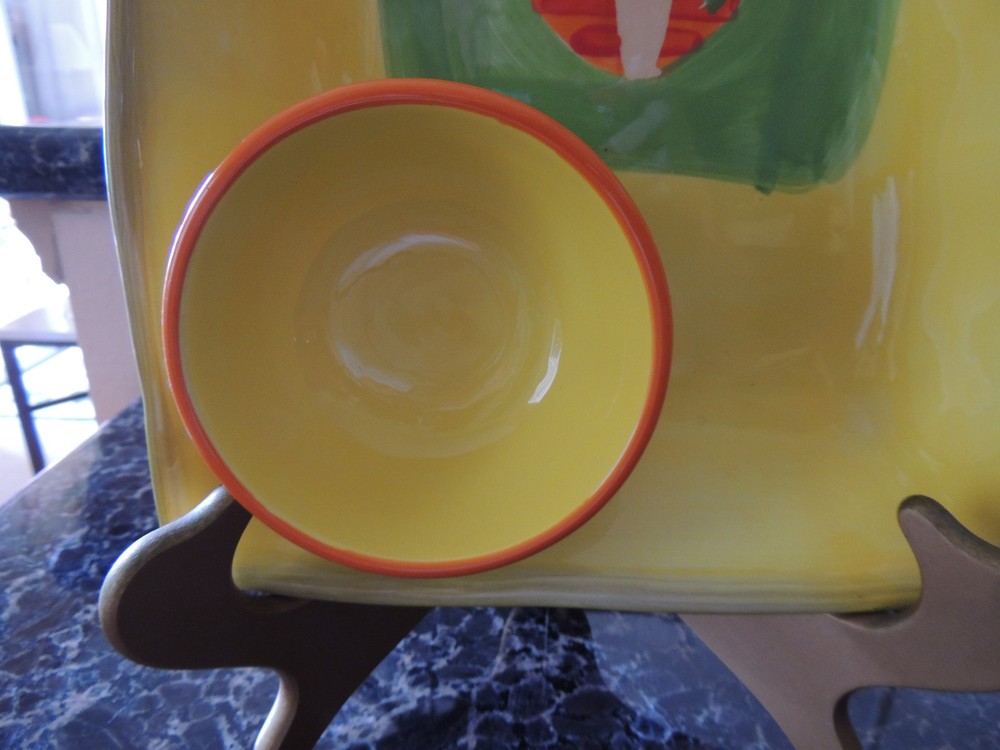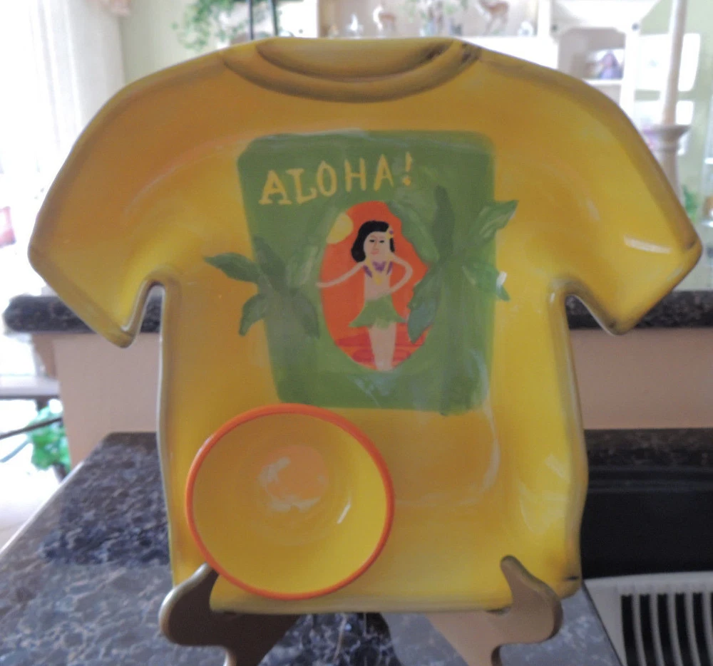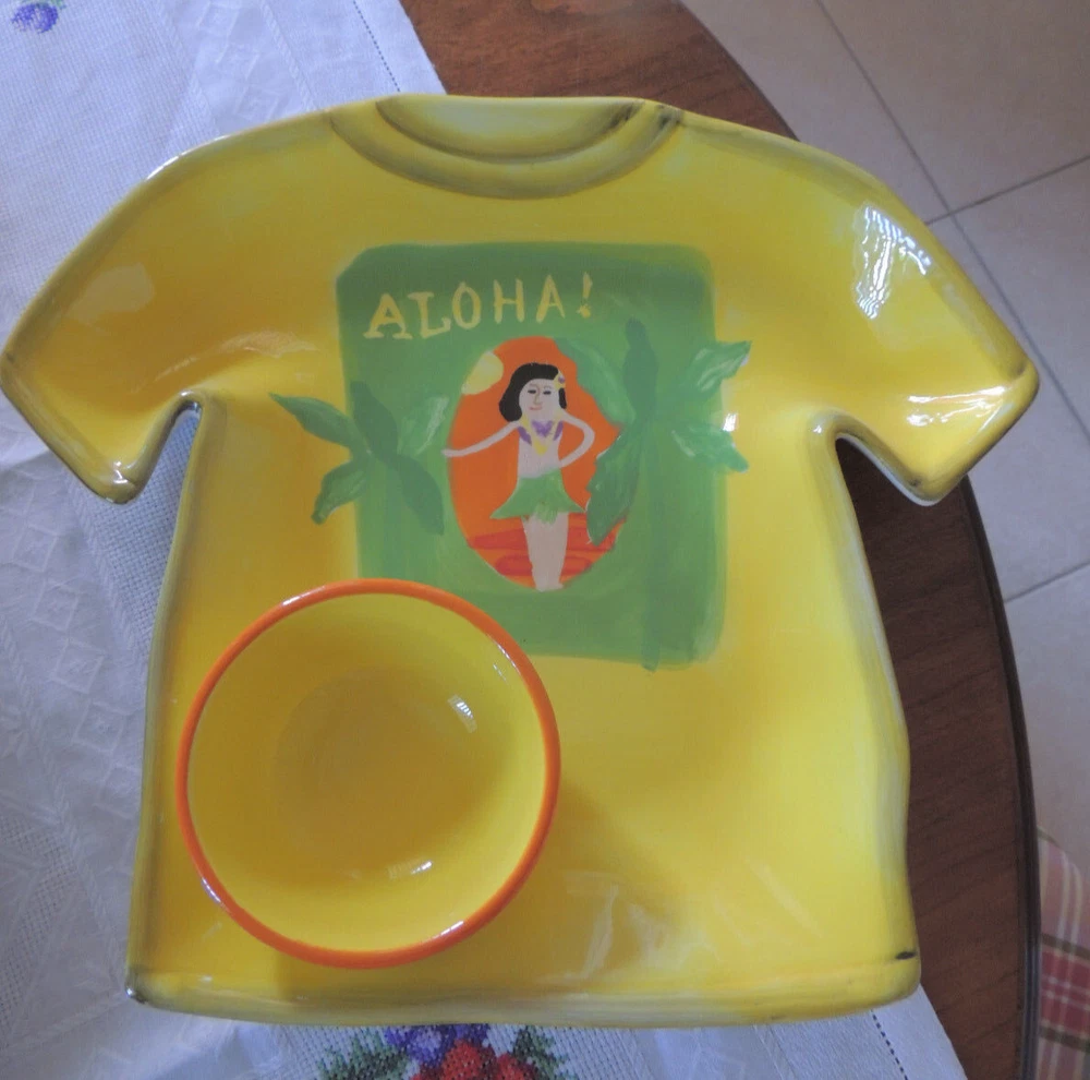 This large Dennis East Aloha t-shirt serving tray is perfect for all occasions. With a colorful design of yellow, green, and orange, it will add a touch of contemporary style to your dining table. The glossy finish and ceramic material give it a polished look, while the 14-inch diameter and 16-inch width provide ample space for serving finger food and dips. Ideal for dinner parties and gatherings, this serving tray is a must-have for any kitchen, dining, and bar setup. Its unique design and high-quality construction make it a great addition to your collection of dinnerware and serveware. Whether you're serving a variety of foods or just a few snacks, this Dennis East Aloha t-shirt serving tray is sure to impress.
