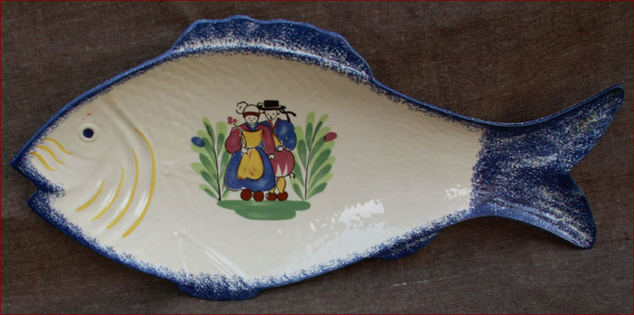 french- antic Gallery on eBay Large French Faience Couple of Bretons Fish Shaped Dish Platter Brittany Quimper 1950 Large fish shaped platter dish with hand painted decor showing a couple of little bretons surrounded by a blue sponging border made by Pornic studio near Quimper during the 1950"s. Perfect condition, signed on the back. 22" length 10 7/8" width. The shipping cost for US and Canada is $35 with 6/10 days for delivery in priority with official delivery service "La Poste" Good luck and successful bidding! For our French-speaking friends: Grand plat à poisson en faience de la manufacture Pornic, décor peint à la main montrant un couple de bretons, vers 1950. Parfait état signée sur son fond. Longueur 55.6cm, largeur 27.5cm. All french-antic items come from France to you. Please don't hesitate to email us your questions and I will revert quickly Please make payment by Visa card Mastercard with our Securized SSL Payment transaction or with PayPal. Payment to be received within 10 days of the close of auction. Shipping and insurance costs to be paid by the buyer. All items are described as there are and are sold with a 15 days full refund GUARANTEE. All goods will be shipped the next working day after payment at our bank. See our other auctions on Our on line gallery click here
