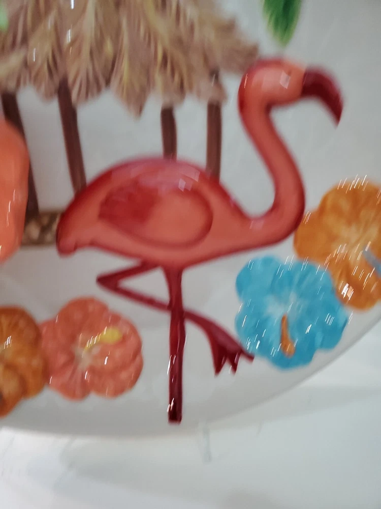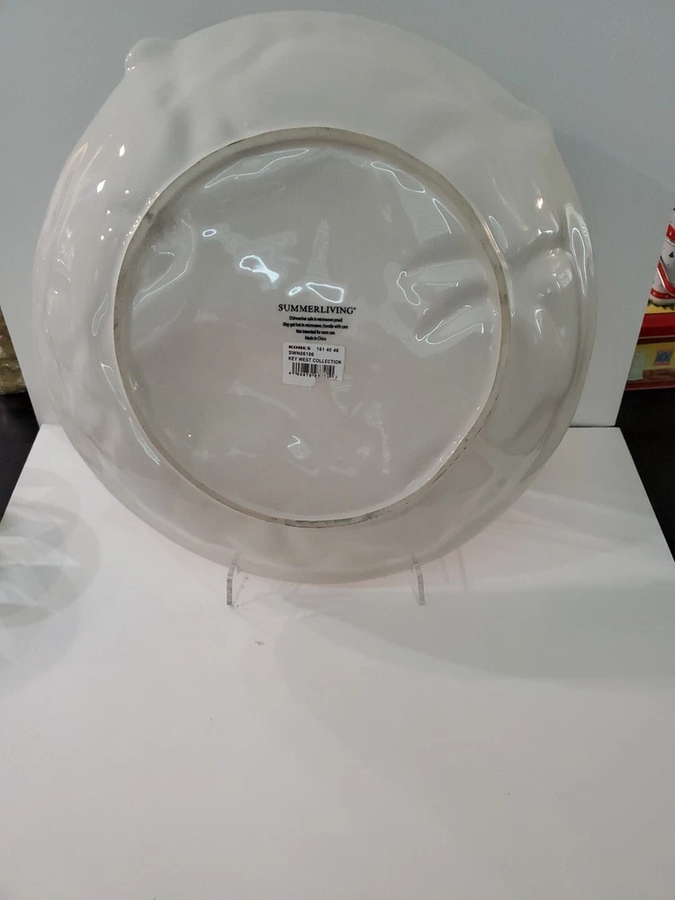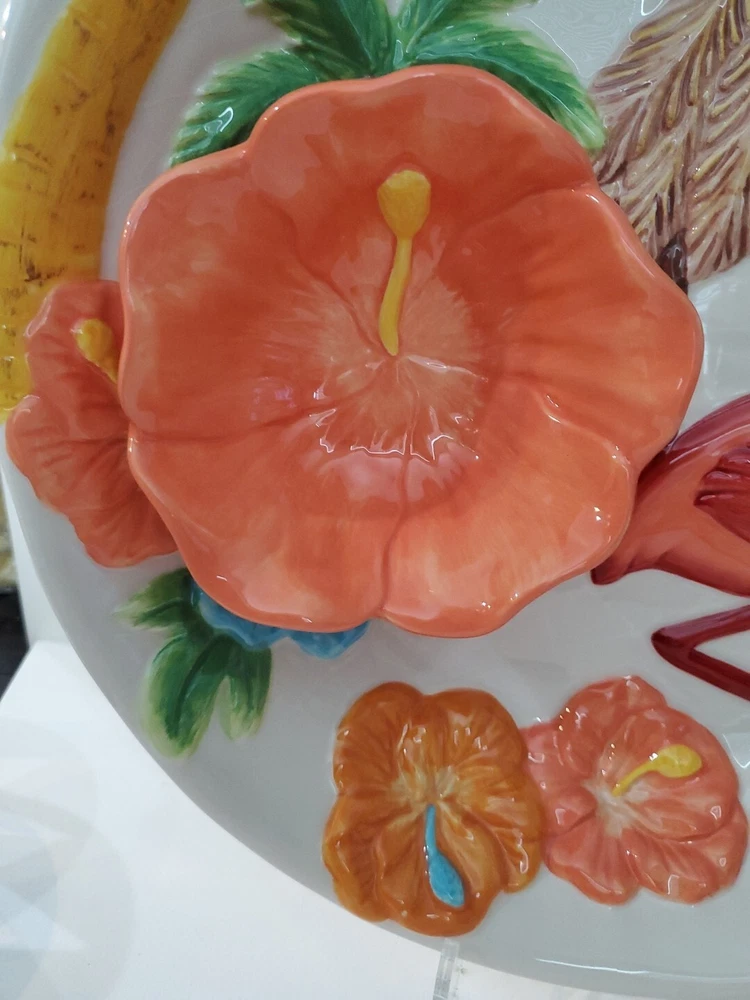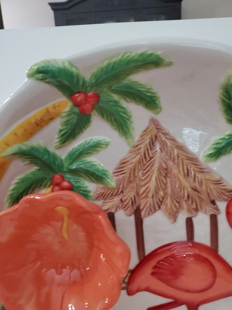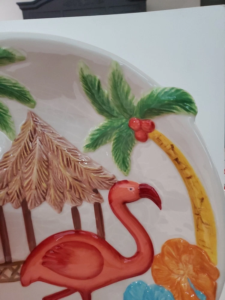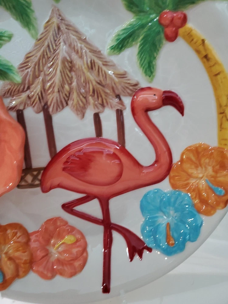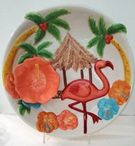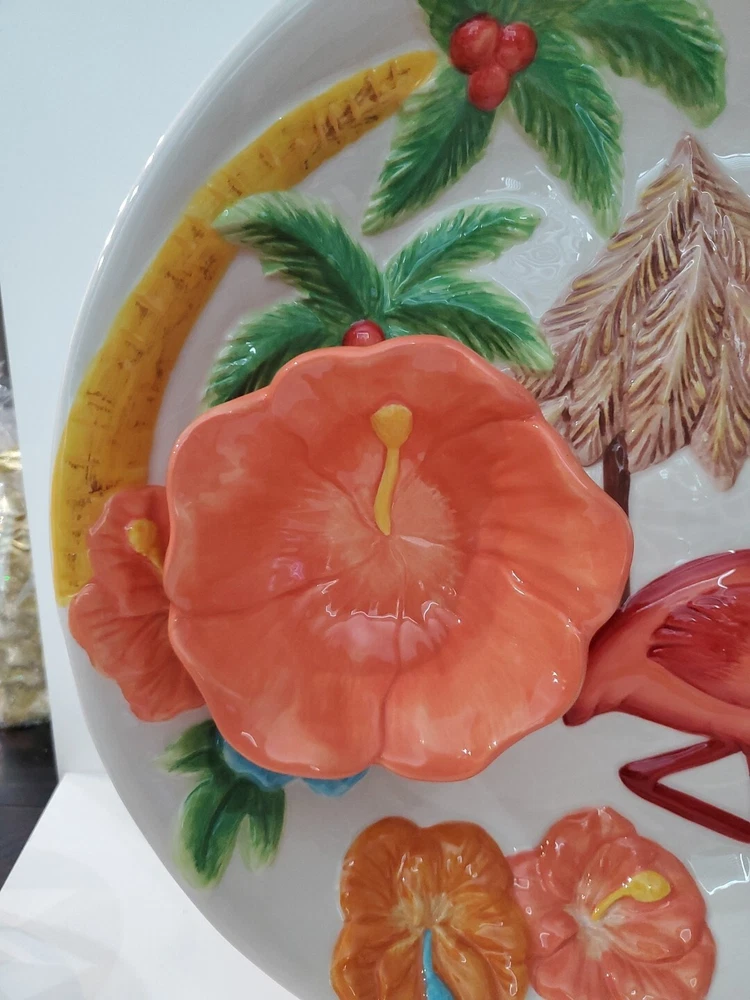 Kohl's Summer Living Key West Ceramic Pink Flamingo Serving Plate Chip & Dip. Pre-owned in good condition. The dish has no chips or stains. There is crazing all over the entire dish. The dish has an attached hibiscus flower dip dish. The dish is approximately 14" in diameter with a height of 2 3/8" and weighs 4 lbs 4 oz. Original Kohl's sticker is on the bottom, but a piece is ripped off. Please see photos for details. Please message me if you have any questions or would like to make an offer.