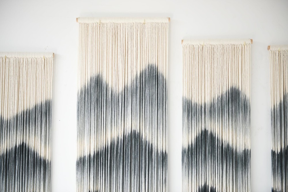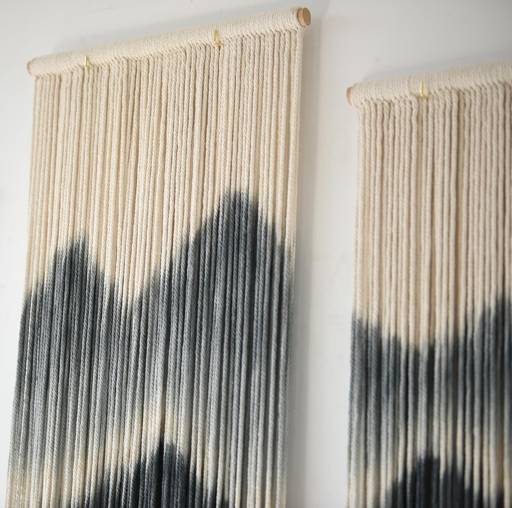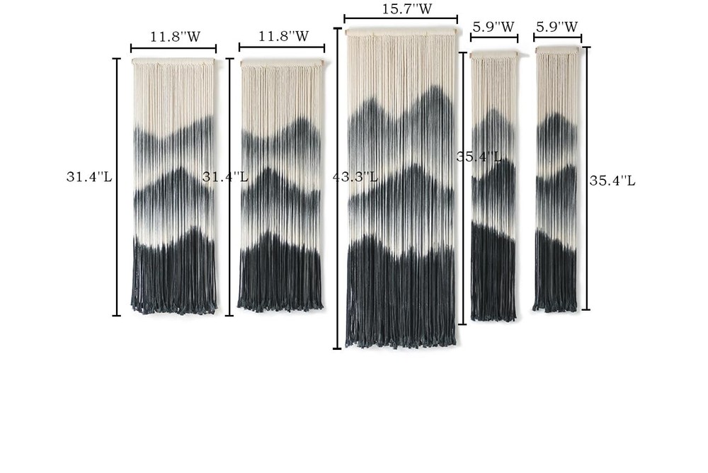 Artistic and Creative: The combination of mountain dyeing has high artistic and creative qualities. Artists can design various patterns with different styles and themes based on their imagination and creativity, showcasing unique artistic charm and personal style. Design inspiration for natural themes: The combination of mountain dyeing also draws inspiration from the natural mountain landscape, so the patterns often present a natural, fresh, and primitive style, attracting people's longing and love for nature, bringing a wonderful feeling of integration with nature. Handmade, each piece is unique: The combination of mountain dyeing is usually handmade, using techniques such as tying, tying, and dyeing to give each piece a unique texture and effect that cannot be replicated, increasing its artistic taste and collection value. Diversified application scenarios: With a wide range of applications, it can meet people's decorative needs in different occasions, adding more beauty and artistic atmosphere to life. Easy to update and replace: Wall decorations are generally easy to replace and update, and can be adjusted according to seasons, holidays, or personal preferences. This flexibility allows people to change the decor of the room according to their mood and needs. Design: inspiration for natural themes: Handmade Dip-Dyed Macrame wall hanging wall decor living room mountain design inspiration for the mountain comes from the natural mountain landscape, so the patterns often present a natural, fresh, and primitive style, attracting people's longing and love for nature. Occasion: above bed headboard, living room wall, bedroom wall, gallery wall, nursery decor wall art bedroom entrance hall wall, etc. The macrame craftsmanship art like this will suit perfectly a minimalist living room, bohemian bedroom, and warm mid-century office. Suspension Method: 1.Large macrame wall decor suspension arrangement can be divided into types Hanging separately usually means that artworks or decorations are displayed on the wall in a relatively dispersed manner, maintaining a certain distance from each other. This layout is suitable for displaying artworks of different styles or sizes, which can increase the dynamic feel of the space.2,Closed hanging is a hanging method that tightly arranges all artworks together to form a visual focus. This layout is suitable for art collections with similar styles or unified themes, and can create a strong visual impact. Size: We have 5 pieces combined composition, one piece is 43" long and 18" wide, two pieces are 33 " long and 12" wide, and two pieces are 37" long and 6"wide. Packaging: the macrame wall hangings include 8 hooks 1. All the large macrame wall hangings are handmade paintings. Each piece is unique and different. 2.Due to the macrame wall decor being packed in a box during shipping, the macrame is bent when it is hung up. You can iron it with a steam iron which will help it straighten. You can also comb macrame with the comb, the macrame will straighten itself after one or two weeks.