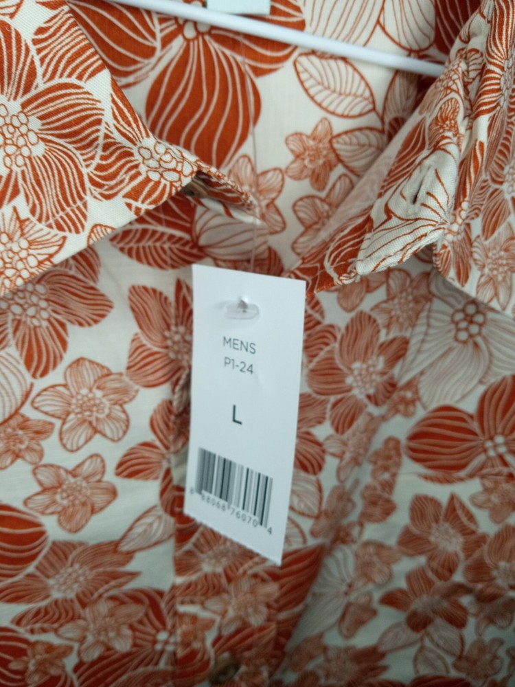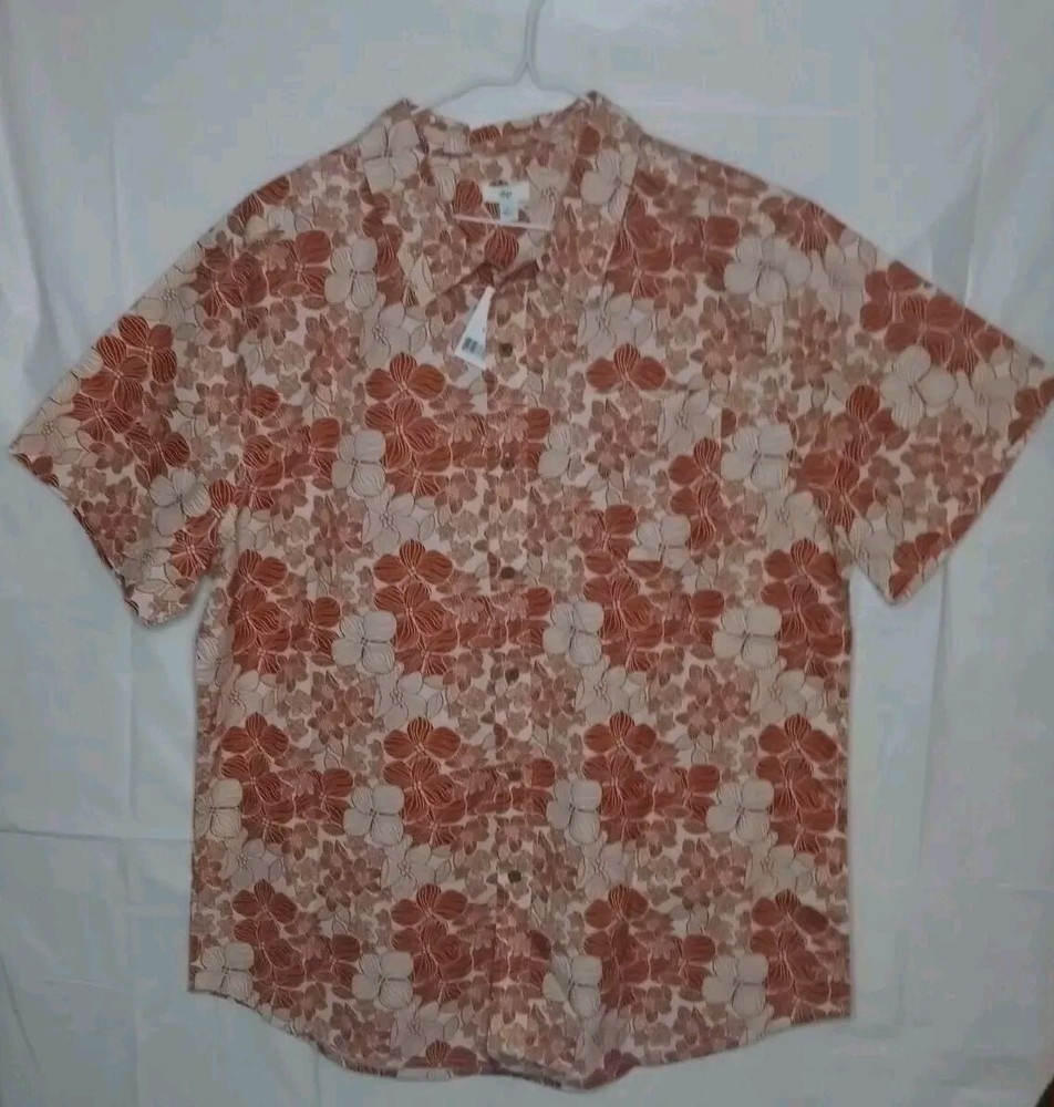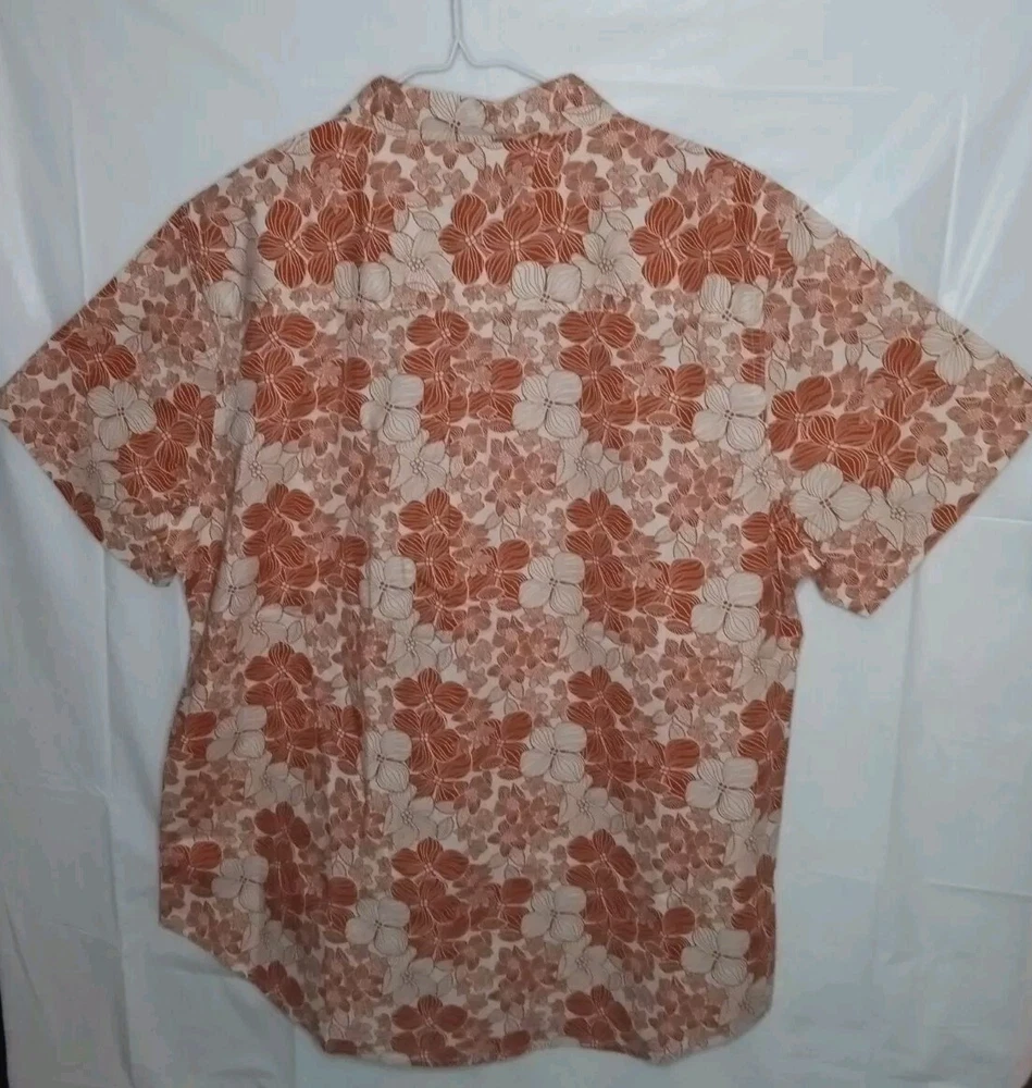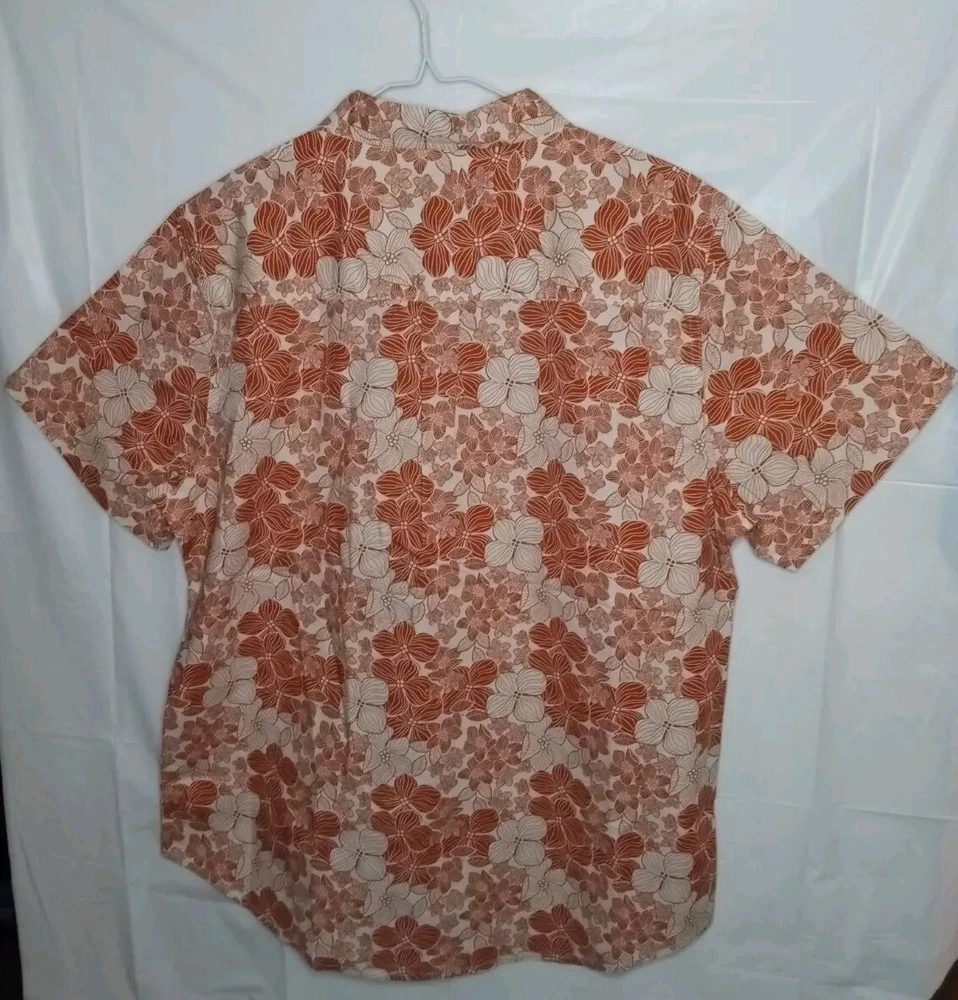 Brand New Size Large Sun burnt orange floral Hawaiian shirt. Includes an extra button as well. The light doesn't give it justice it's much more vibrant than it looks. The close up photos really show off the color and beautiful flowers. One handkerchief pocket on the front left chest. Please ask any question prior to purchasing.
