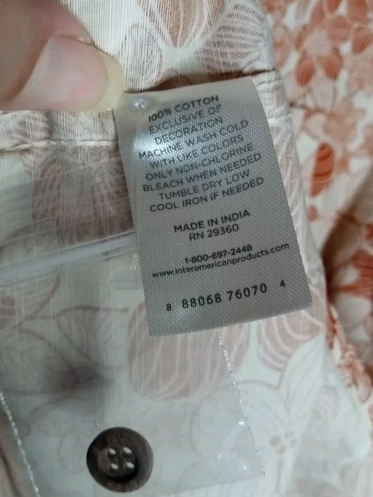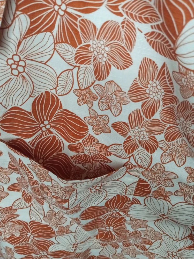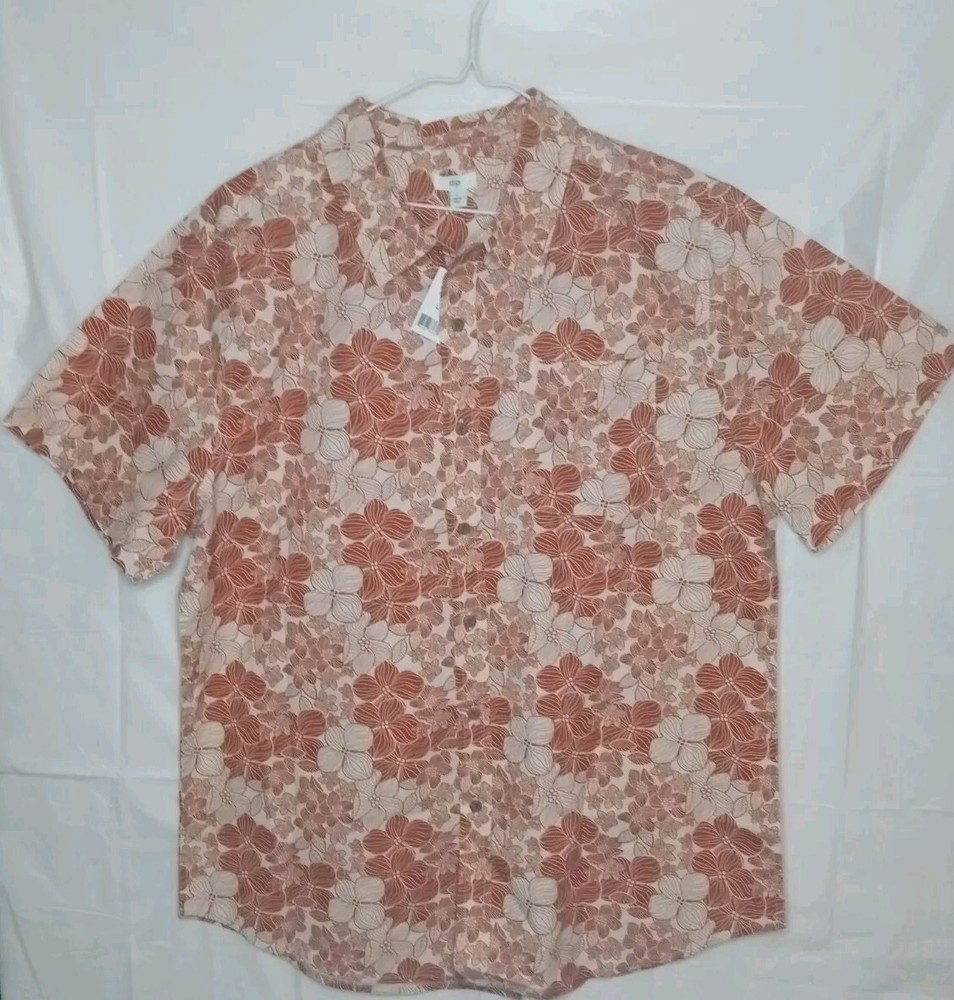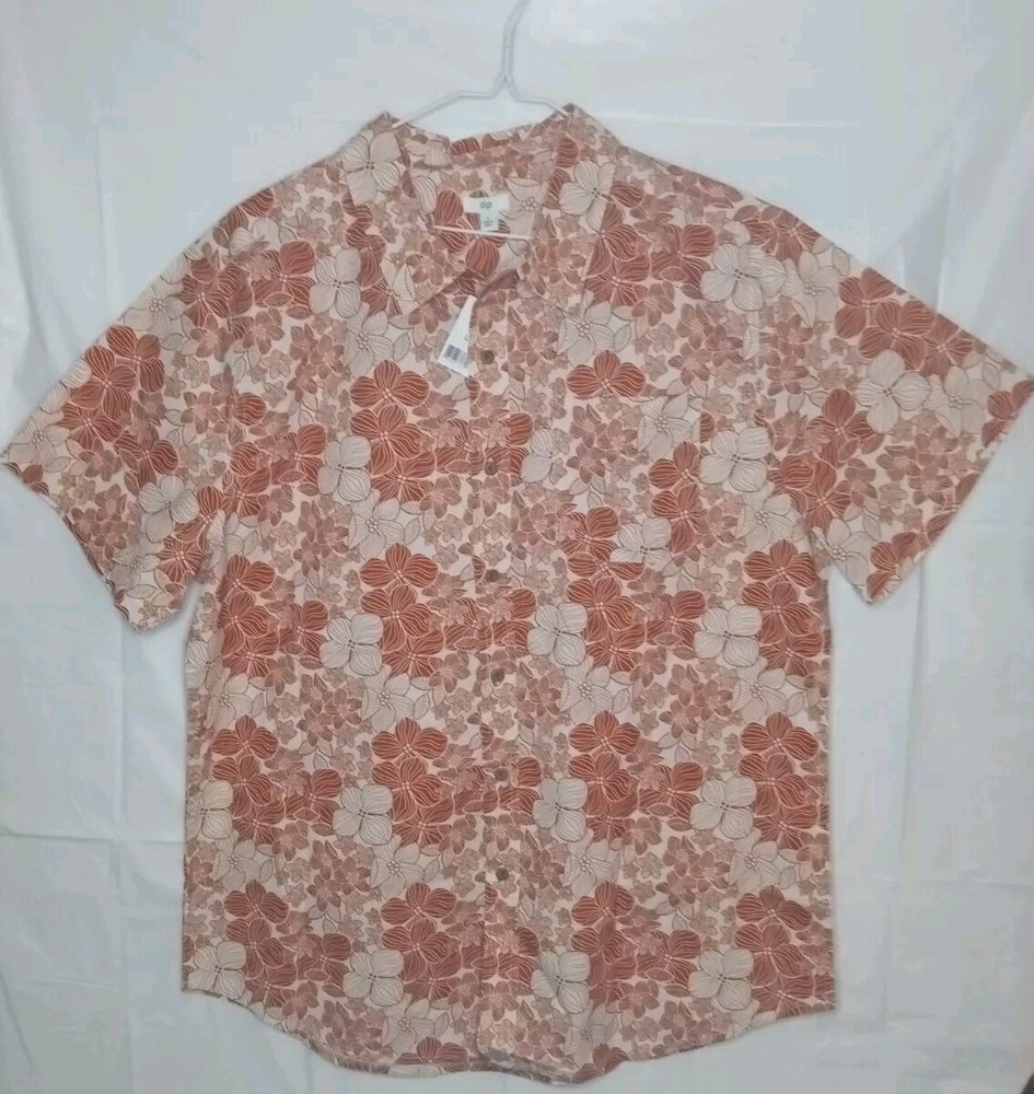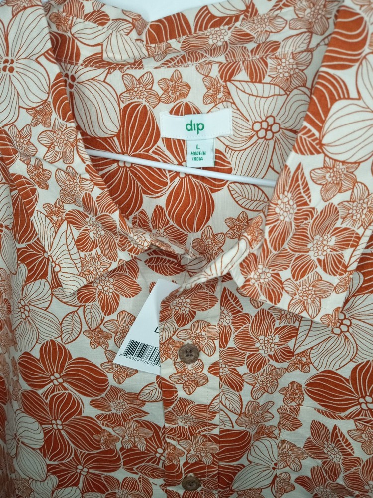 Brand New Size Large Sun burnt orange floral Hawaiian shirt. Includes an extra button as well. The light doesn't give it justice it's much more vibrant than it looks. The close up photos really show off the color and beautiful flowers. One handkerchief pocket on the front left chest. Please ask any question prior to purchasing.