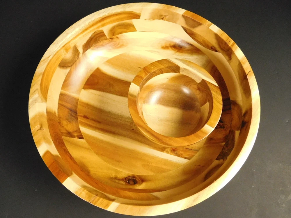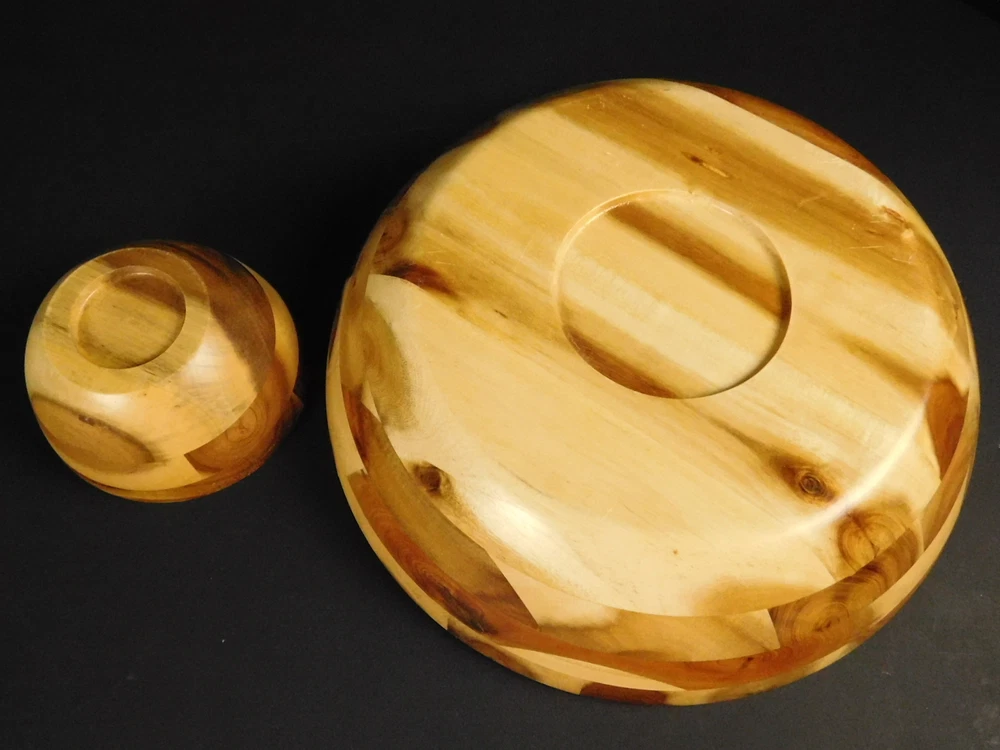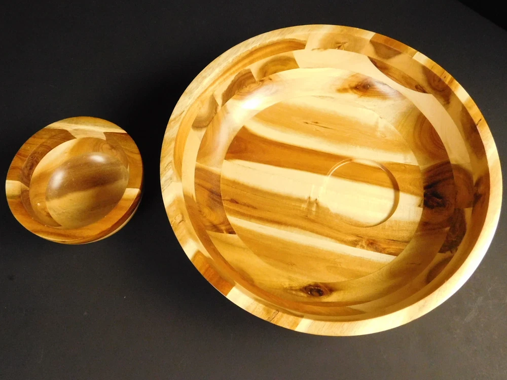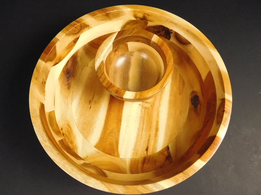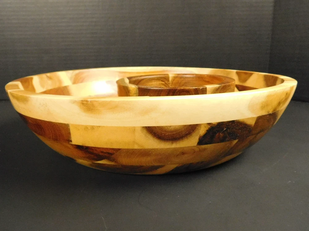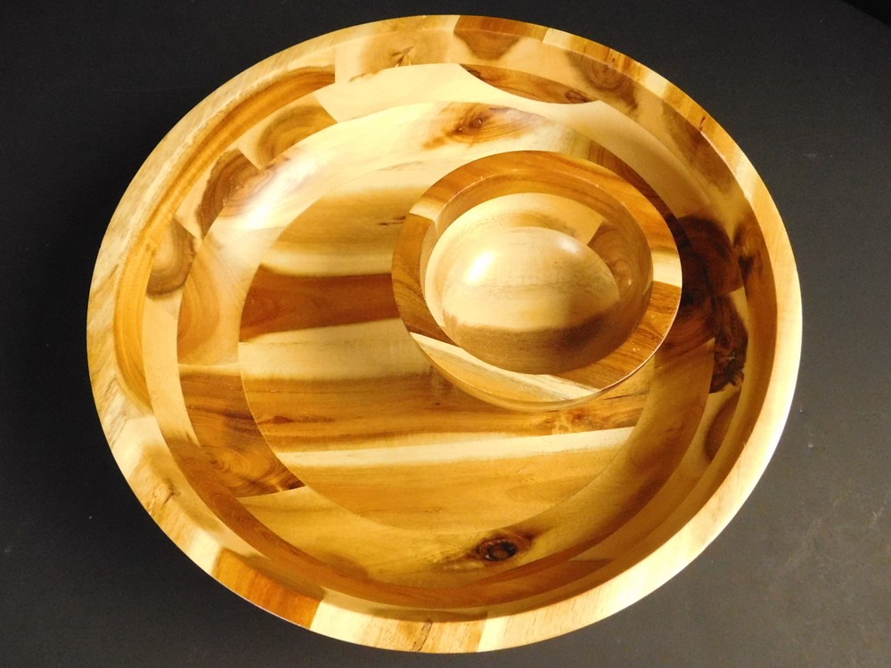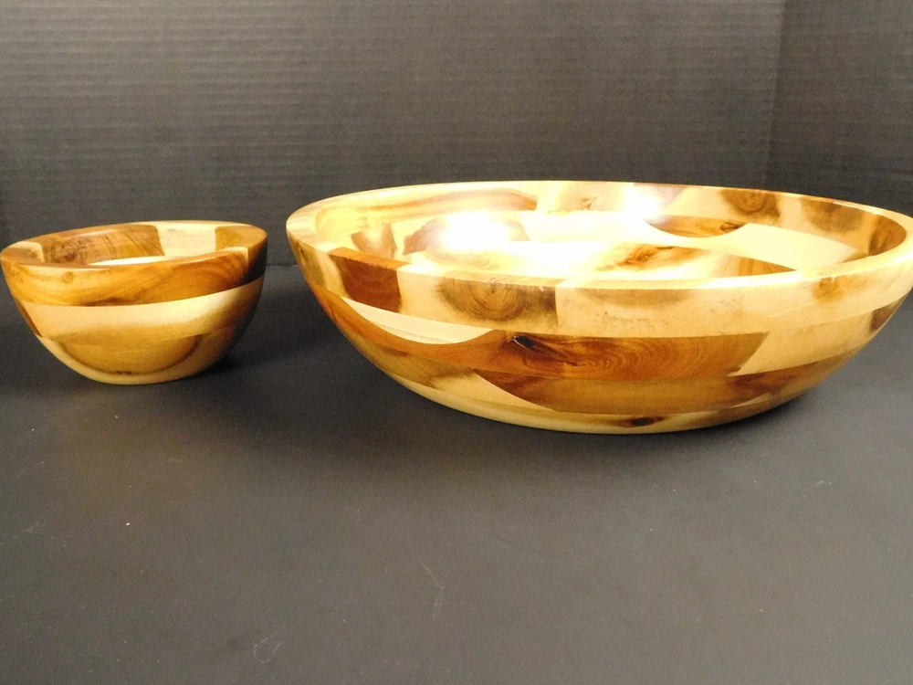 Acacia Wood Chip & Dip Serving Bowls Hors d'oeuvres Set Multi Color Browns Handsome, multi-color wood chip and dip bowl set One large and one small bowl Perfect for chips/dips, veggies/dip, and condiments Large bowl is 12.5" wide and 4" deep Small bowl is 4.5" wide and 3" deep Lovely adornment for your next party table GOOD, PRE-OWNED CONDITION. IT DOES HAVE A CRACK OF ABOUT 1.5 INCHES ON THE INSIDE RIM BUT DOESN'T DETER FROM THE LOOK. NO STAINS, SMELLS, OR ODORS. Please email with any questions. Reasonable offers accepted. Payment is expected at time of purchase unless we agree on other arrangements. I will ship next day after receiving Paypal notification of payment received. I appreciate you viewing and considering my item. Items may be returned in original condition within 30 days with buyer paying return shipping. Thank you and God bless, OLIVE TREE TREASURES