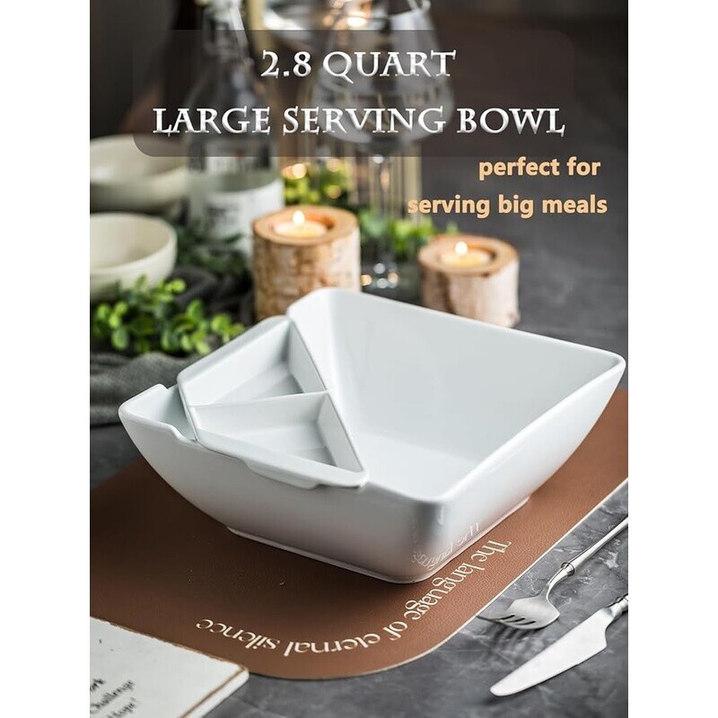 You may also like A Frame Trailer Jack 2000 Lb Capacity 15" Vertical Travel Heavy Duty Alloy Steel 54.33 USD 57.19 USD Free shipping 5% off Plastic Food Storage Containers Stackable Reusable Nestable Set 14 Count W/ Lid 8.79 USD 9.25 USD Free shipping 5% off 6-Bottle Wine Cooler Mini Fridge Adjustable Racks Digital Controls LED Display 77.84 USD 81.94 USD Free shipping 5% off Stretchy Anchor Line Bungee Cord Boat Retrieval Grapple Hook 14' To 50' Extend 36.38 USD 38.29 USD Free shipping 5% off Honey Powder Sweetener Emergency Food Storage 30 Year Shelf Life Gluten Free New 19.59 USD 20.62 USD Free shipping 5% off Collapsible Fly Fishing Rod Reel Combo Kit W/ Carry Case Durable Lightweight New 71.96 USD 75.75 USD Free shipping 5% off Whisper Internal Filter Aquarium 10-30 Gallon Air Pump Quiet Filtration System 29.6 USD 31.16 USD Free shipping 5% off Expandable Checked Luggage Softside Spinner Telescopic Handle Organized Pockets 49.81 USD 52.43 USD Free shipping 5% off Rv Roof Vent Cover Removable Louvers Uv Stabily Resin Easy Clean Water Resistant 46.22 USD 48.65 USD Free shipping 5% off Poultry Scratch Grains High-Energy Protein Supplement 40lb Bag Chickens Turkeys 24.45 USD 25.74 USD Free shipping 5% off 24 In 2 Tier Dumbbell Rack Home Gym Support 200 lbs Durable Steel Frame Black Us 45.74 USD 48.15 USD Free shipping 5% off 6-Drawer Plastic Storage Cart W/ Organizer Top & Wheels Mobile Organizer Rolling 41.05 USD 43.21 USD Free shipping 5% off About this item INNOVATIVE BUILT-IN DIPPING TRAY DESIGN: Host a party night with our magic layered bowl. The chips stay crunchy while queso stays gooey. Hot spinach dip & chilled salsa coexist peacefully! LARGE CAPACITY & SIZE: With a wide mouth of 9. 33" diameter and a capacity of 2. 8 Quart, this salad bowl is large enough to provide ample portions for your party guests. It is ideal for serving large salads, fruits, soups, appetizers, noodles, snacks, popcorn, etc. This ceramic mixing bowl is also deep enough that you can stir salads or pasta at will without spilling. CLEVER DIPPINGT BOWL DESIGN: The dipping bowl is securely nested over the serving bowl, allowing you to easily separate different foods without messing up or interfering with the staple food area, adding a convenient touch to your dining experience. It can also be taken apart and used alone. There are 2 compartments for different types of food. You can serve salsa, tomato sauce, mashed potatoes, icing dips, guacamole, spicy sauce, nuts, fruits, and various appetizers. PRO-GRADE PORCELAIN: This multi-purpose serving dish is made of high-quality porcelain material, lead-free, scratch-resistant and more sturdy than plastic. The smooth glaze makes it easy to clean in hand-wash or dishwasher. It is also microwave, oven and freezer safe. WIDELY USE: With its classic white color and clean minimalist lines, this chip and dip bowl is the perfect gift for any food enthusiast or home chef. Whether it's for a Housewarming party, Wedding, Birthday party, Thanksgiving, Christmas dinner, buffet or other special occasion, this large salad bowl will be greatly appreciated. Bowl Material: Porcelain Number of Pieces: 1 Brand: Color: White Style: Square You may also like Wet Cat Food Variety Pack Seafood Pate Favorites 100%Complete Balanced Nutrition 29.59 USD 31.15 USD Free shipping 5% off 1/2 Drive Click Torque Wrench 20-250ft lb Adjustable Dual Range Tool Set Heated 49.27 USD 51.86 USD Free shipping 5% off Ergonomic Rocking Kneeling Chair Posture Support Stress Relief Home Office Stool 98.79 USD 103.99 USD Free shipping 5% off Tufted Velvet Ottoman Footstool Bench Home Indoor Adjustable Legs Storage New 155.61 USD 163.8 USD Free shipping 5% off 14 Inch Push Lawn Mower Hand Reel Lightweight Alloy Steel W/ Scissor-action Cut 111.14 USD 116.99 USD Free shipping 5% off 42-Piece Kitchen Plates Bowls Wheat Straw Dinnerware Set Lightweight Unbreakable 30.55 USD 32.16 USD Free shipping 5% off Angle Broom Dustpan Combo Set Heavy Duty Cleaning Tools 2 Brooms 2 Pans Indoor 26.52 USD 27.92 USD Free shipping 5% off Extra Chunky Gravy Wet Cat Food Variety Pack 24 Cans Chicken Turkey Salmon Beef 27.07 USD 28.49 USD Free shipping 5% off Queen Mattress Topper Extra Thick Pillow Top Cooling Protector Back Pain Relief 82.84 USD 87.2 USD Free shipping 5% off 3-in-1 Hall Tree Coat Rack Shoe Bench W/9 Hook Storage Shelf Industrial Entryway 70.39 USD 74.09 USD Free shipping 5% off 13.2 Gallon Motion Sensor Trash Can Soft Close Touchless Kitchen Black Resin Bin 41.52 USD 43.71 USD Free shipping 5% off 3-in-1 Lightweight Corded Handheld Vacuum Cleaner Multi-Surface HEPA Filter New 25.81 USD 27.17 USD Free shipping 5% off
