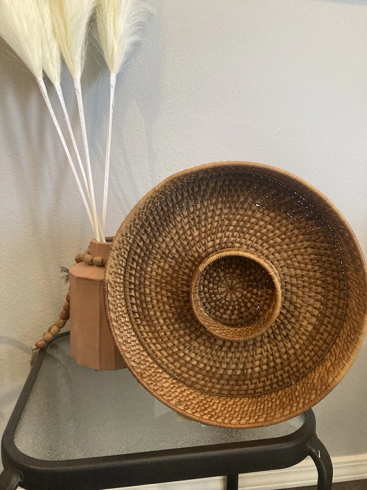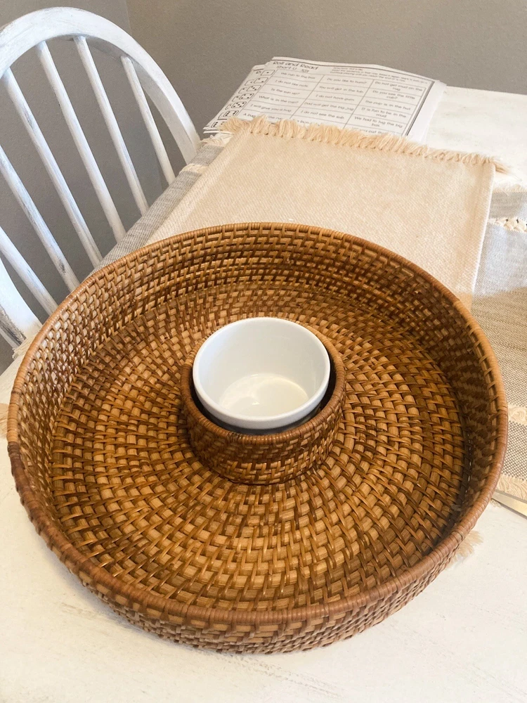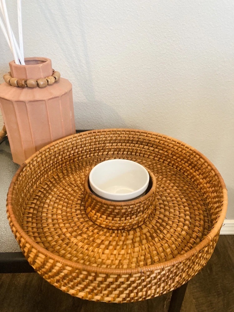 Large Rattan Chip and Dip Basket-Round- Hand Woven Server Tray-Vintage Retro....