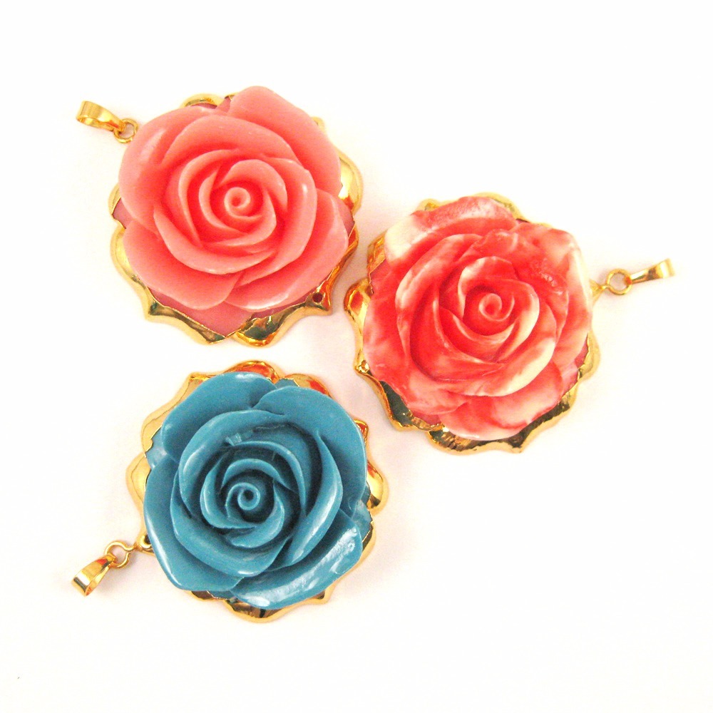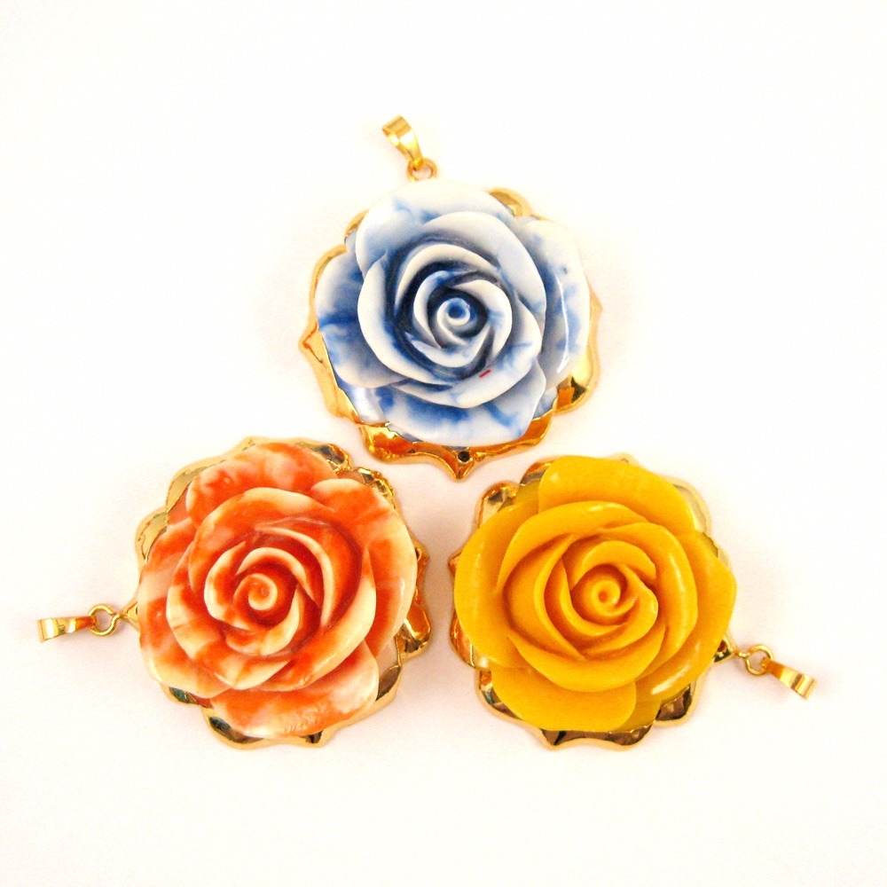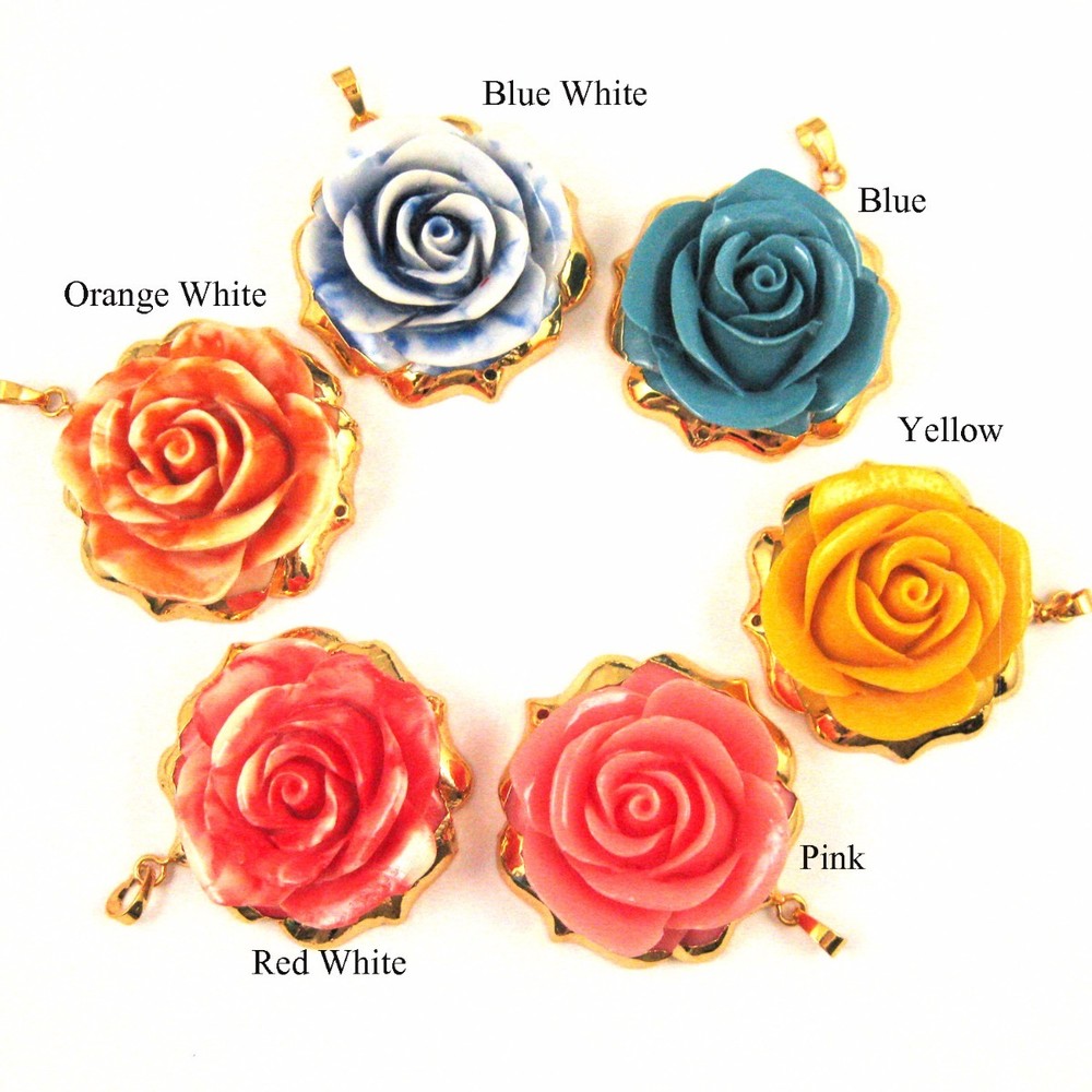 Large Rose Pendant, Natural Carved Resin Lovely Roses, Huge Gold Dipped Pendant Stone: Carved Natural Resin Type: Pendant Bail: 8.5 mm 24K Gold plated over brass Pendant Material: Natural resin Shape: Large Rose pendant Measurement: 52mm long (including top ring), 47 mm wide, 19-20mm thick Connector: Pendant has 1mm holes on top and bottom, can be used as a connector or a pendant * Holes are not easily visible, if used as a pendant. Weight: about 25 grams per piece. SKU#: 292030 Quantity: 1 pendant The last picture shows a small selection of our variety of chains showcasing the pendants. For our entire selection of finished chains to complement these beautiful pendant, click here! If you have a Business License or Tax Id, we have up to 50% wholesale discount for all of our products. Please send us a message to inquiry and open a wholesale account. Pictures only show the shape of the product, for actual size please read the measurement. Thank you for visiting Bead Union EBay store. Click on categories below to see other products...