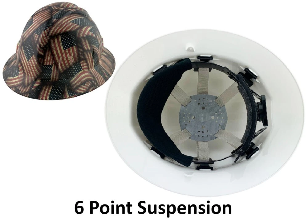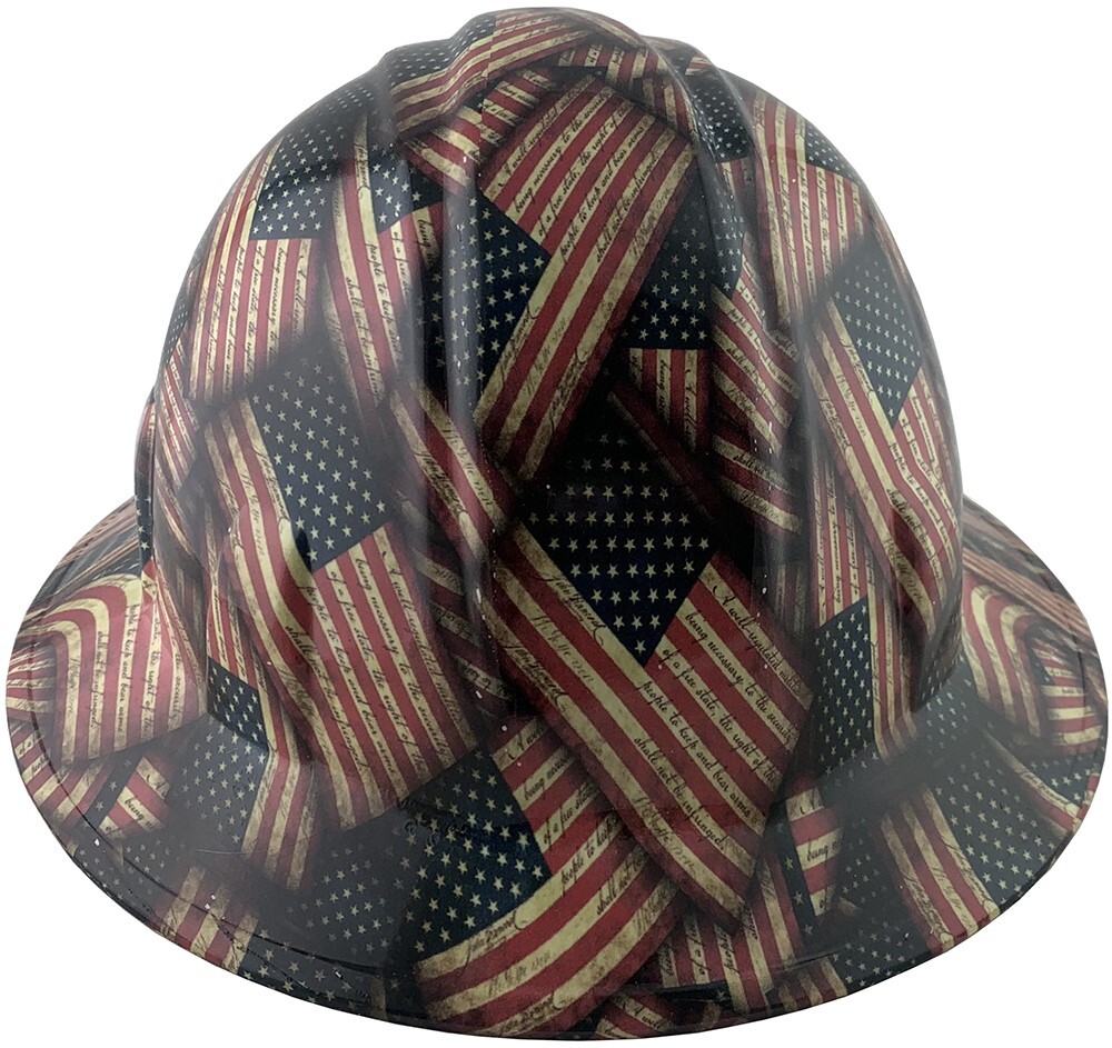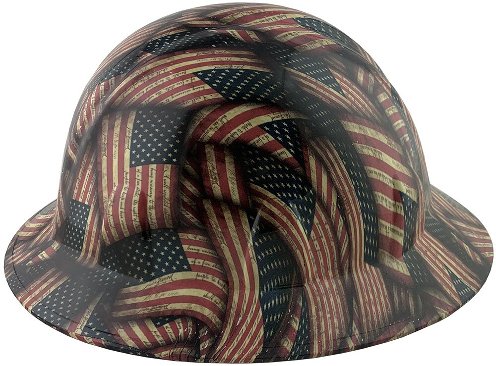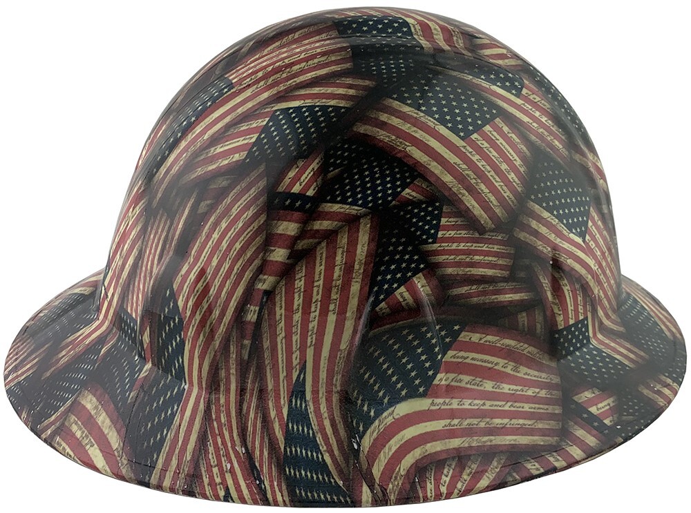 Amendment Flag Full Brim Style Hydro Dipped Hard Hats Show a little of your personality with the Large Second Amendment Flag Hydro Dipped Hard Hats. Texas America Safety Company is offering a full line of these unique and stylish hard hats. Each design offers a bright and vivid image with a high gloss finish. Why not work in style? Each Hydro dipped hat comes with an adjustable ratchet suspension that fits most adults. We take a new Class 1 Class C, E and G hard hat and each hat is prepared and dipped one a a time. Therefore, each hard hat is unique and has slight differences in the placement of the pattern. Currently we are using an ERB Omega II hard hat for the hats. We have found these hard hats have the best features to work with. The design covers the entire outside of the hard hat and will not fade or easily scratch. We are carrying all patterns in stock and can generally produce the hats in 1-2 days; however, there may be an additional 2-4 day lead time in case of back orders or larger orders. Take a look and have a little fun. Features Include: Great for general applications Polyethylene shell is durable, comfortable and sleek 4-point suspension disburses impact energy through four different points Can be worn backwards and retain safety certification Note: Since the hard hats have been modified from the factory, we can not say they are ANSI class 1 hard hats; however, we are taking a NEW ANSI approved hard hat and adding several layers of paint, ink, and glossy coating which can actually strengthen the hard hat shell. Powered by SixBit's eCommerce Solution