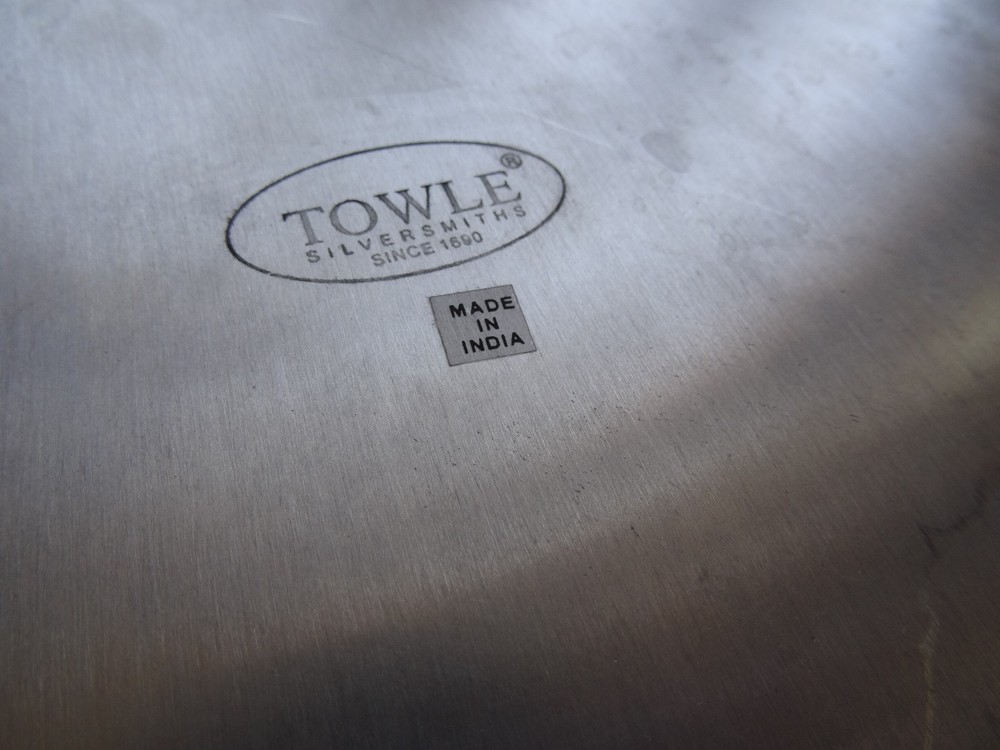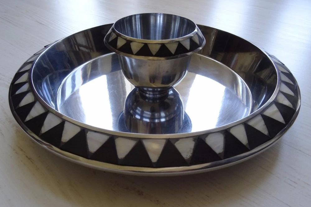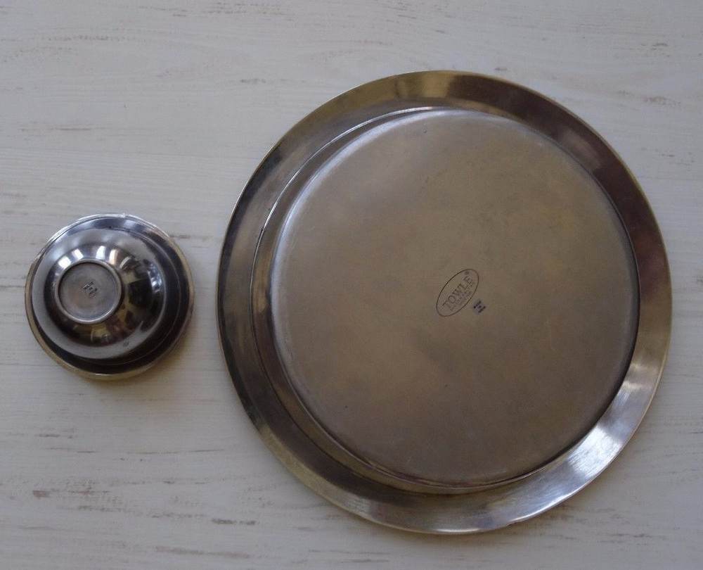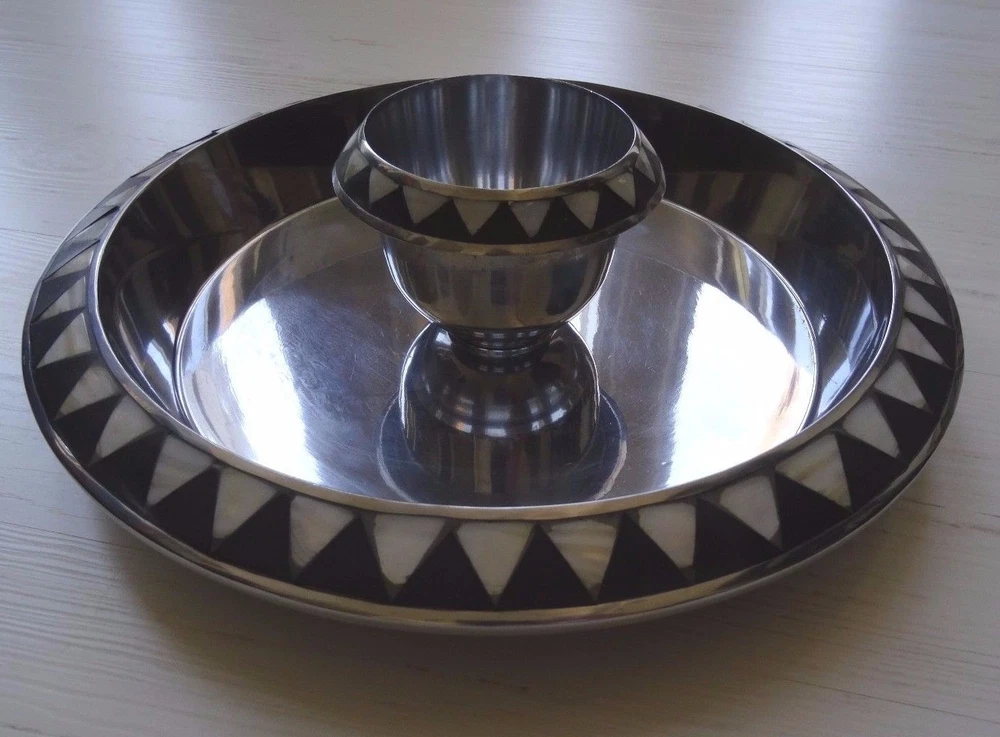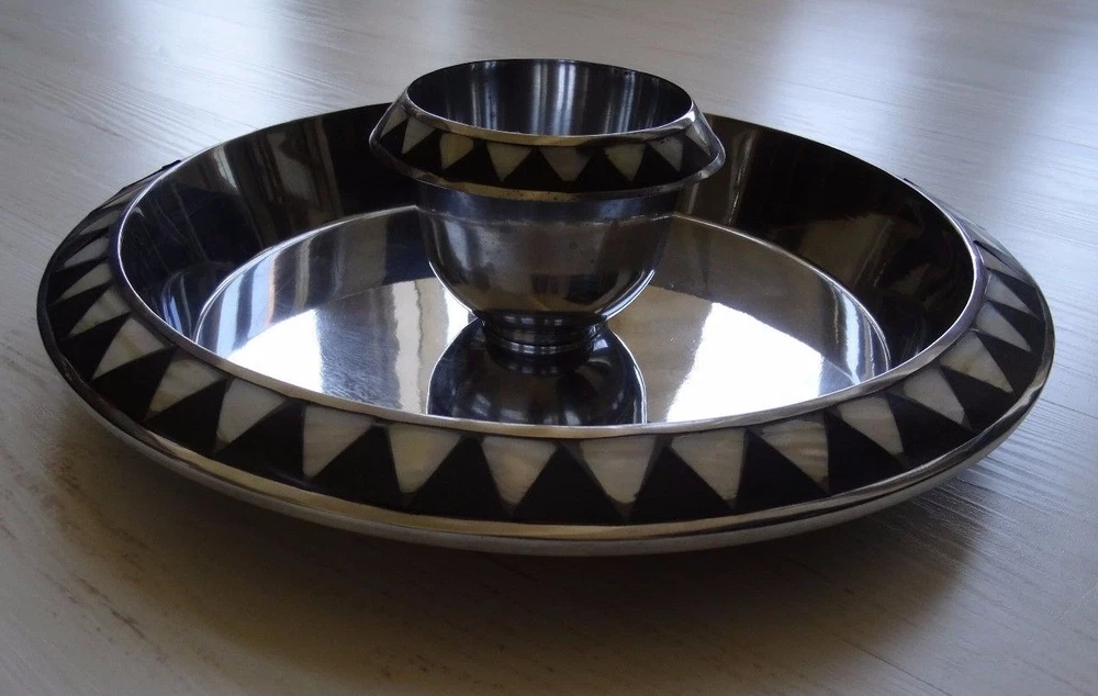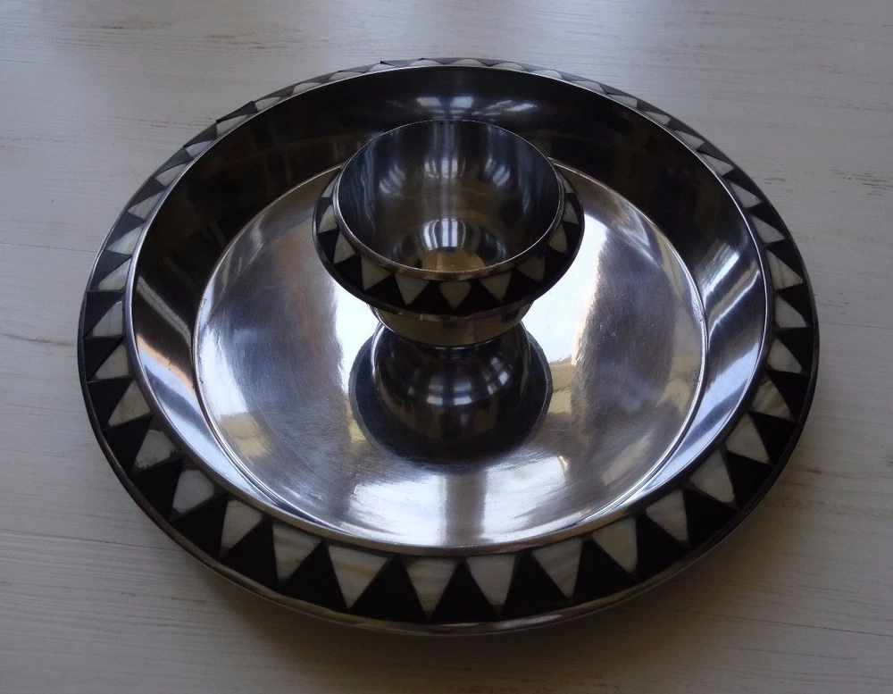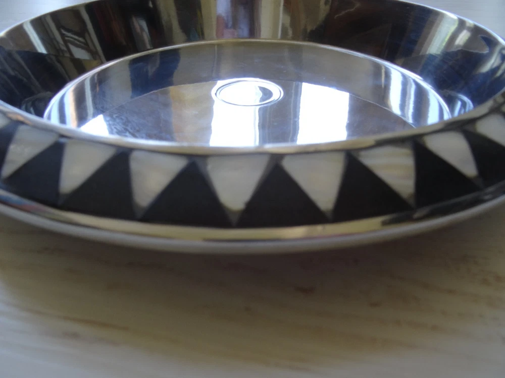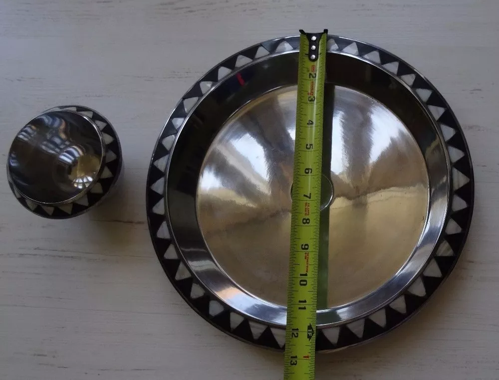 Towle Serving Platter with dip bowl Silversmith Made in India Mother of Pearl style inlay Approximately 13" diameter