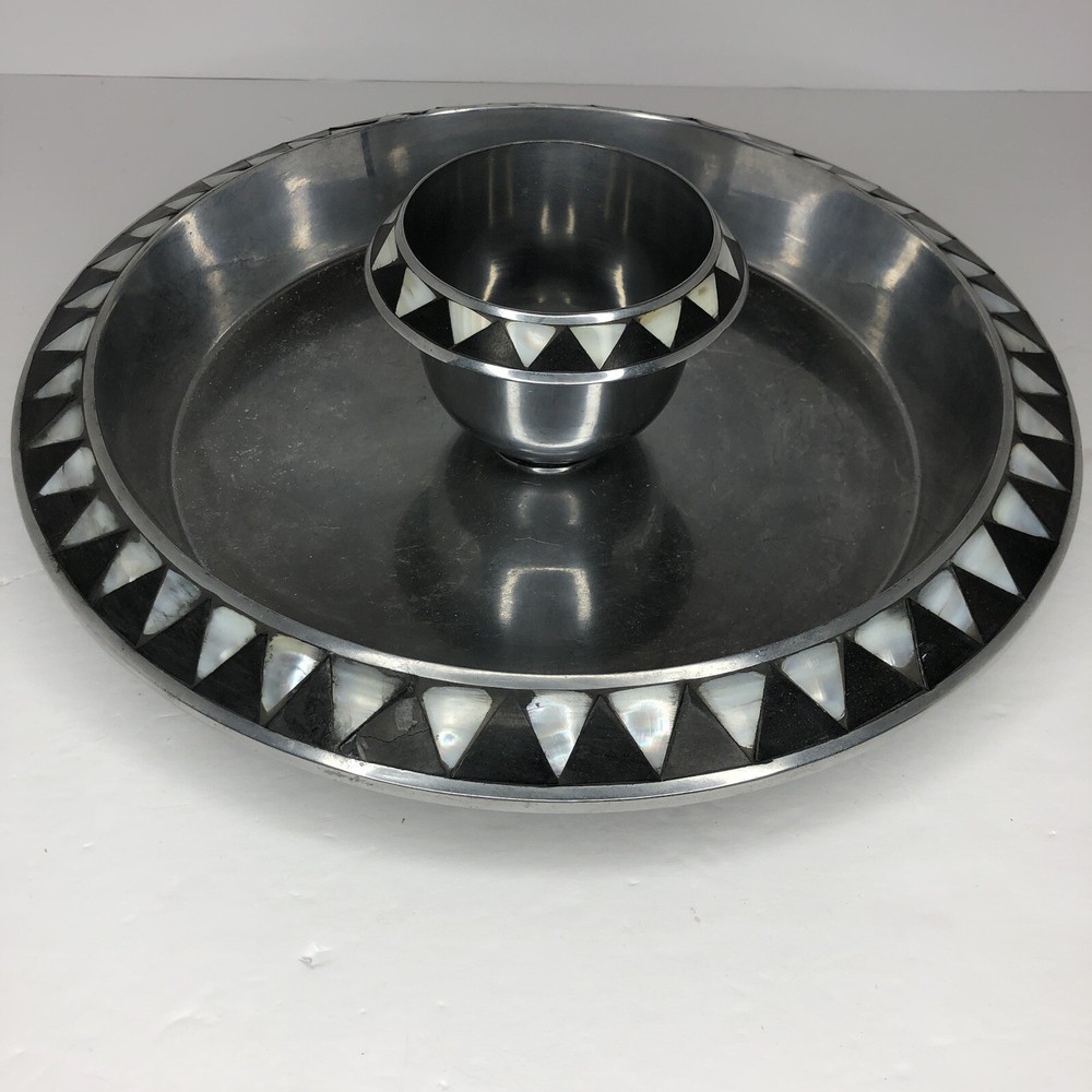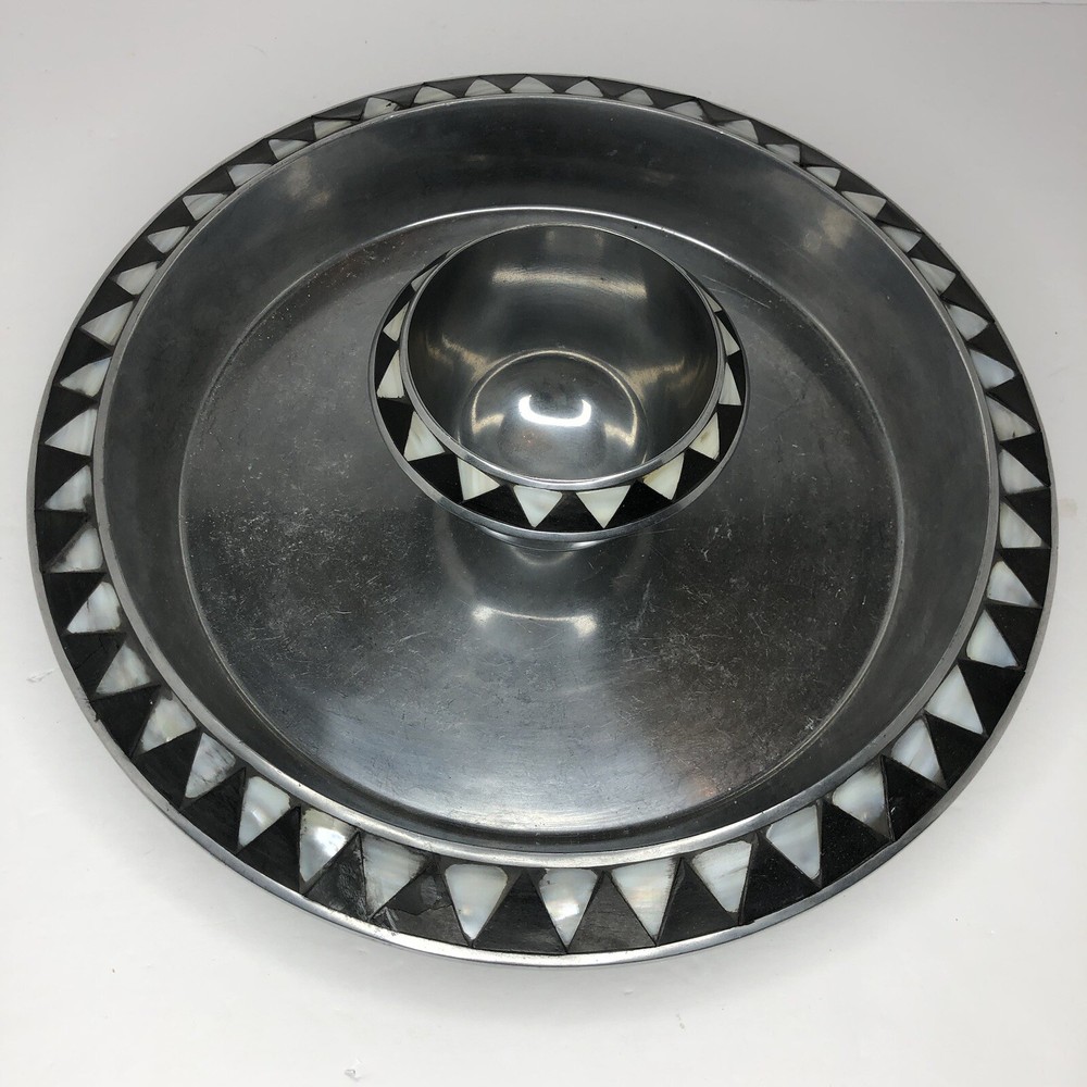 Large Towle Silver Metal Platter Dip Tray Mother of Pearl Inlay 13". Great shape! Perfect for the Holidays