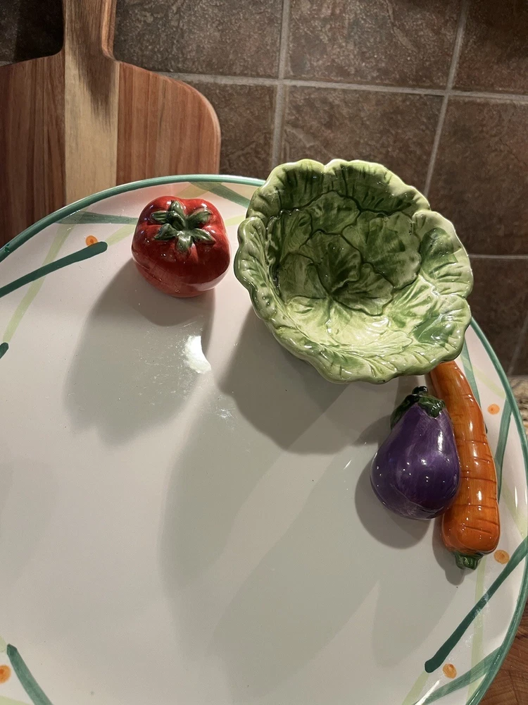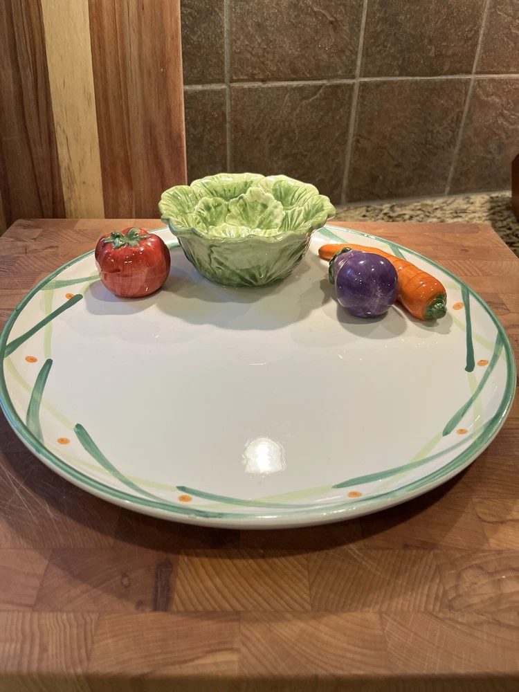 This large vegetable platter is the perfect addition to your dinnerware collection. The platter features an attached cabbage bowl for dips and an assortment of vegetable accents that add a touch of elegance to your table setting. Crafted with high-quality materials, this platter is durable and perfect for everyday use. Ideal for serving vegetables and side dishes, this platter is a must-have for any kitchen or party. The platter's unique design and attached accents make it a great conversation starter at your dinner parties.