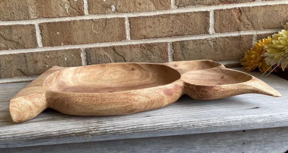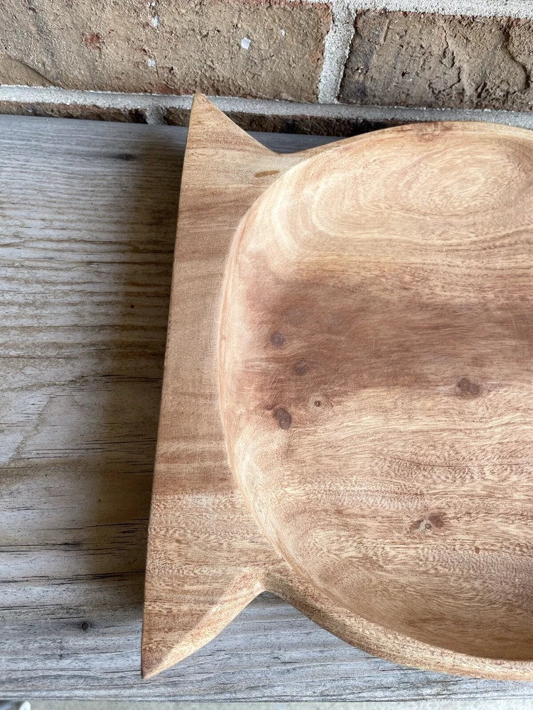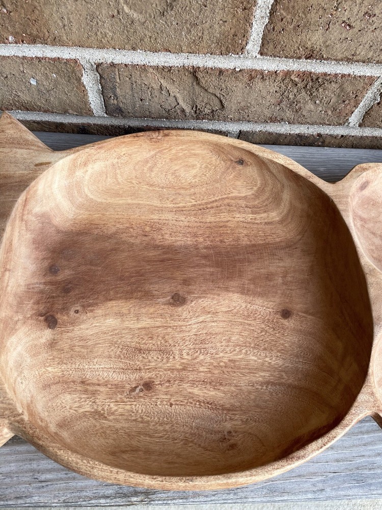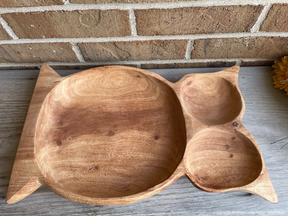 Large wooden owl shaped serving tray, or chip and dip dish. Natural wood color. It can probably be kept as is, or sealed with food-safe cutting board oil or mineral oil, or painted, or wood-burned to decorate. Looks unused. Please look at the pictures carefully. Approximately 15.5 in long, 9.5 in wide, 1.5 in tall.
