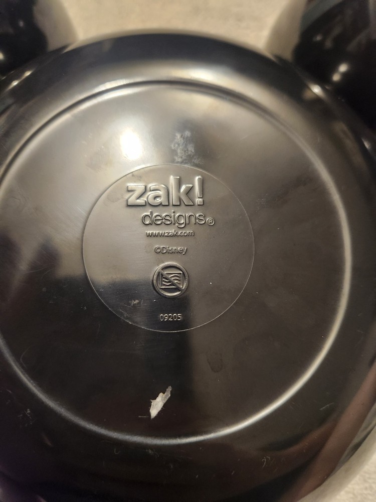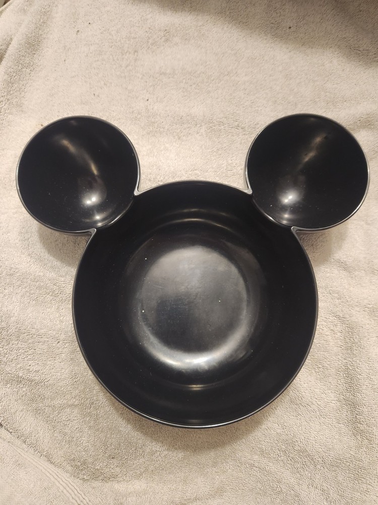 This is a large Zak! Designs bowl featuring Mickey Mouse's head and ears, perfect for serving chips and dip. The bowl is branded with the Disney franchise and is a contemporary collectible from 1968 to now. It falls under the dinnerware category and would make a great addition to any Disney or Mickey Mouse fan's collection.