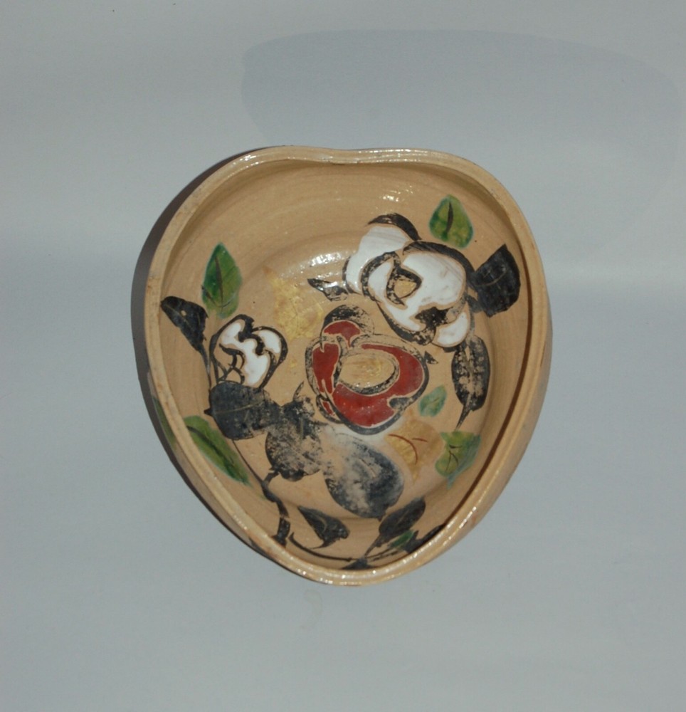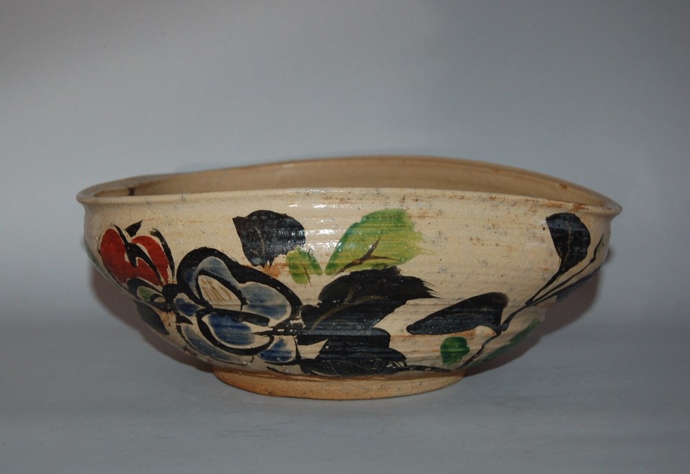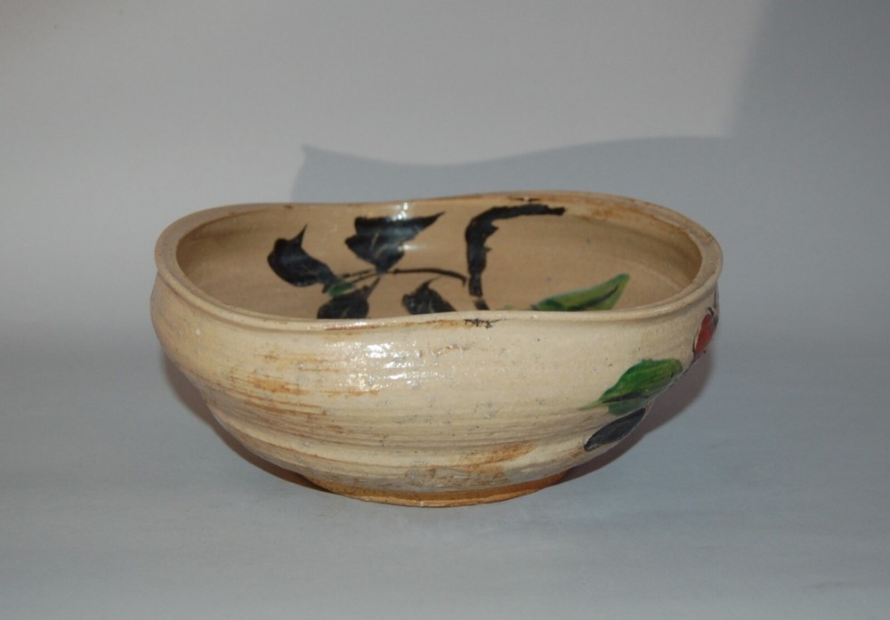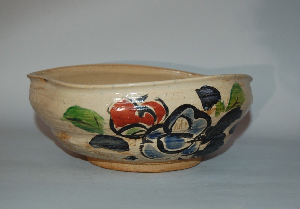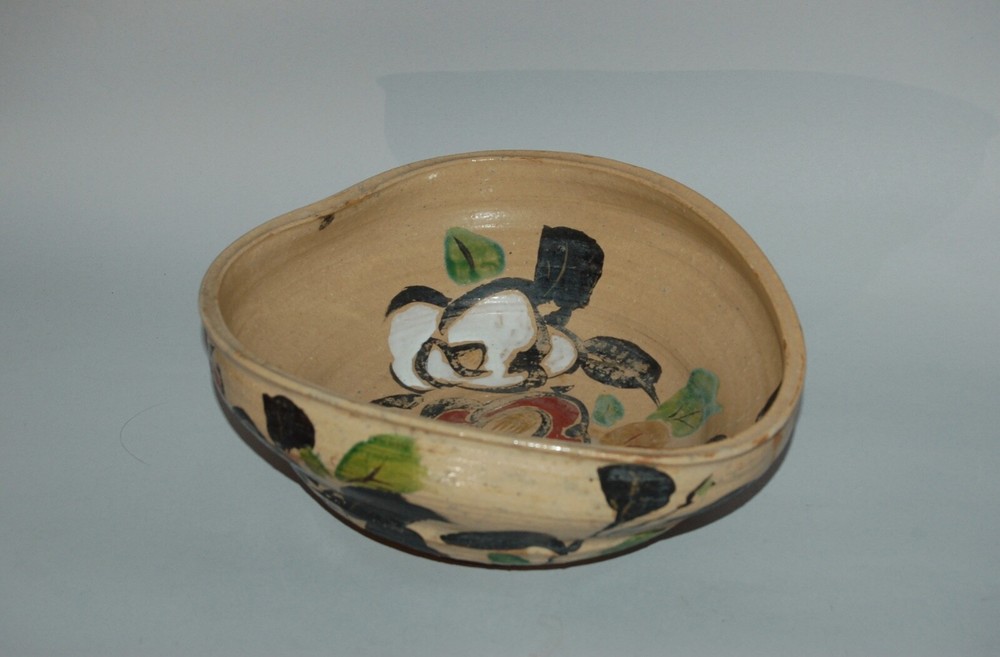 Large peach-shaped bowl decorated on in- and outside with a bold Rinpa design of flowering red, white and blue camellias and leaves. Over a cream colored coarse stoneware a thin layer of cream colored slip has been applied, on of which overglaze blue, black, green, red, white enamels and gold. On the outside in a white rectangular reserve with black outlines the signature Kenzan. In the style of Ogata Kenzan or Ogata Kenzan studio. Japan, 1950s. H 4; W 12 inches. Tiny chip on inner rim, otherwise excellent condition