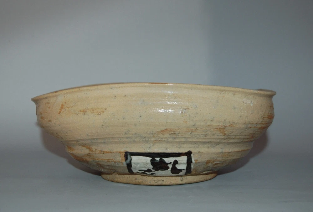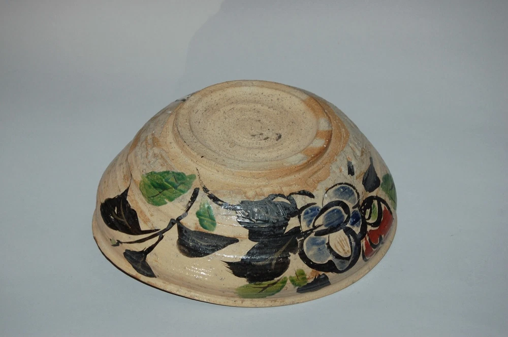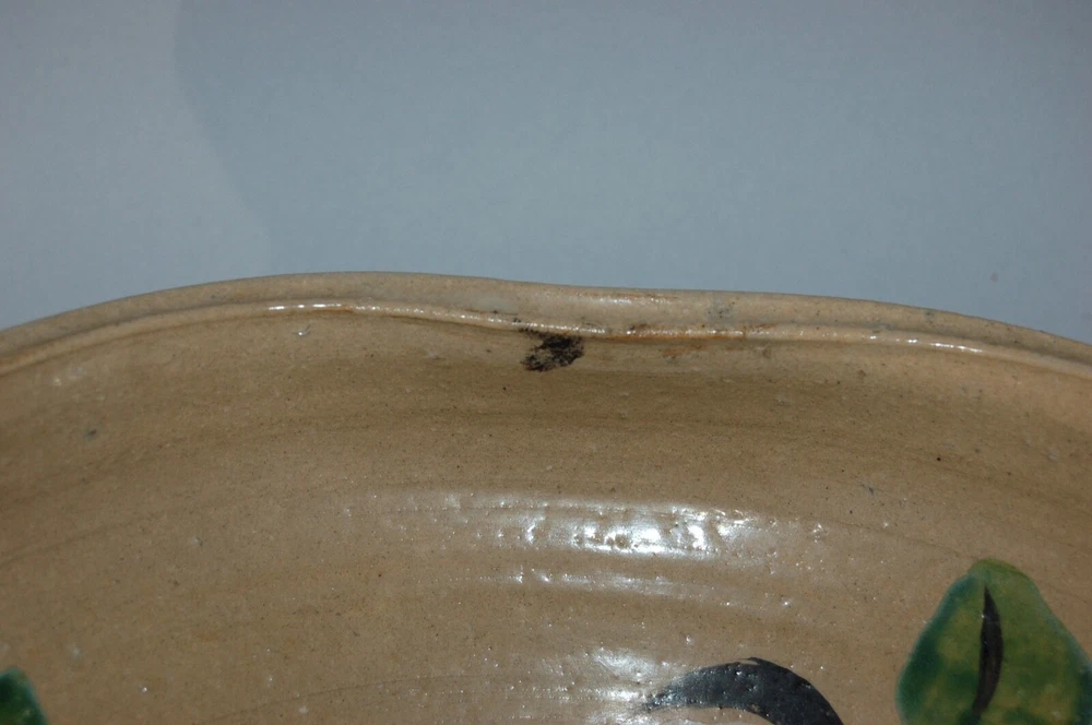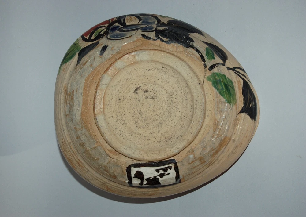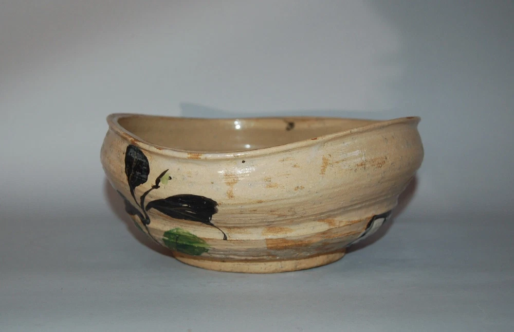 Large peach-shaped bowl decorated on in- and outside with a bold Rinpa design of flowering red, white and blue camellias and leaves. Over a cream colored coarse stoneware a thin layer of cream colored slip has been applied, on of which overglaze blue, black, green, red, white enamels and gold. On the outside in a white rectangular reserve with black outlines the signature Kenzan. In the style of Ogata Kenzan or Ogata Kenzan studio. Japan, 1950s. H 4; W 12 inches. Tiny chip on inner rim, otherwise excellent condition