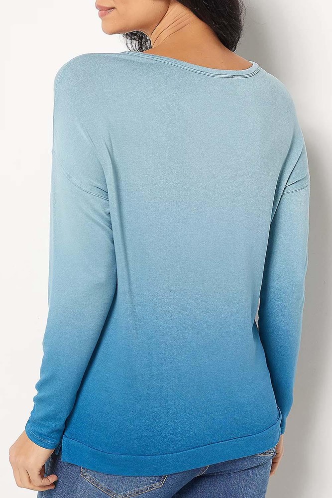 Fabrication: knit Features: scoop neckline, drop shoulders, dip dye, bottom band, side slits, long sleeves Fit: relaxed fit; generously cut with maximum wearing ease Length: missy length 25" to 27-1/2"; plus length 27-1/2" to 28-1/2" Content: 95% viscose/5% spandex Care: machine wash, tumble dry Imported