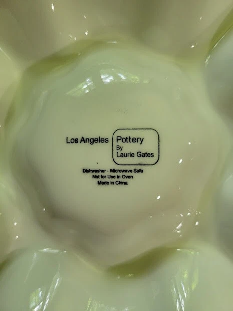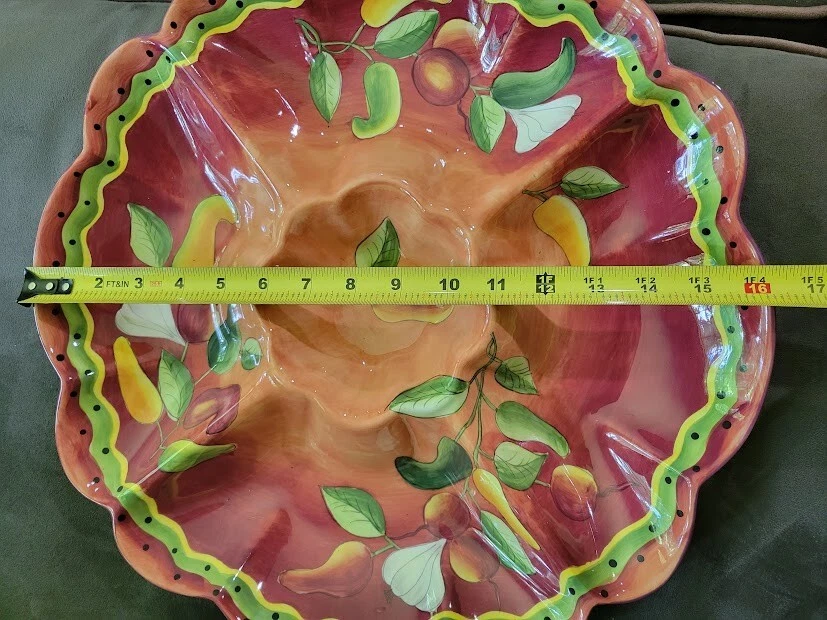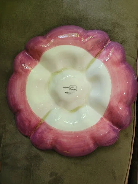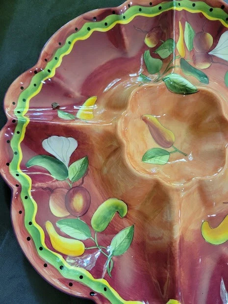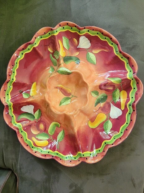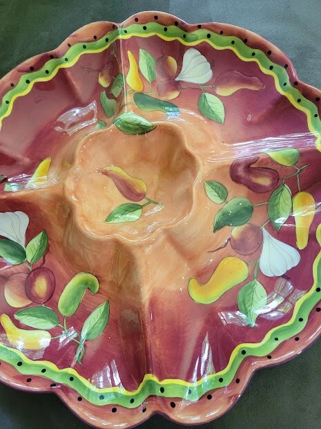 Put some fun in your next fiesta with this gorgeous chip and dip platter from Laurie Gates. Large ruffled edge platter measures approx 16" Across and has 4 chip compartment and one center one for dips/salsa. Beautiful design of garlic and peppers. No chips, cracks or crazing. Perfect! Dishwasher and microwave safe.