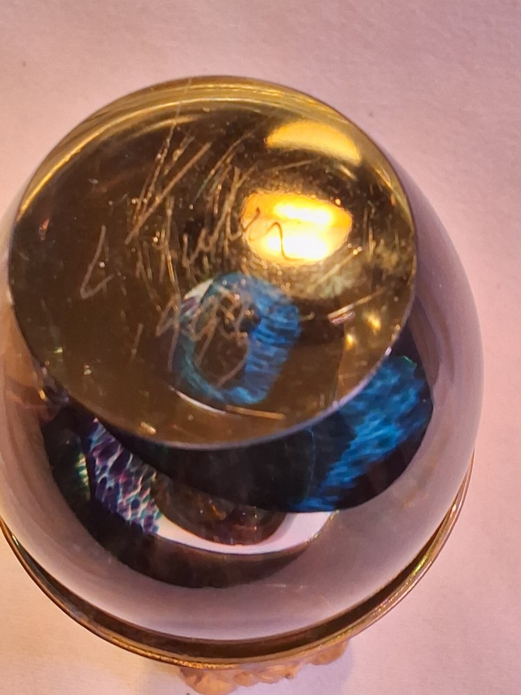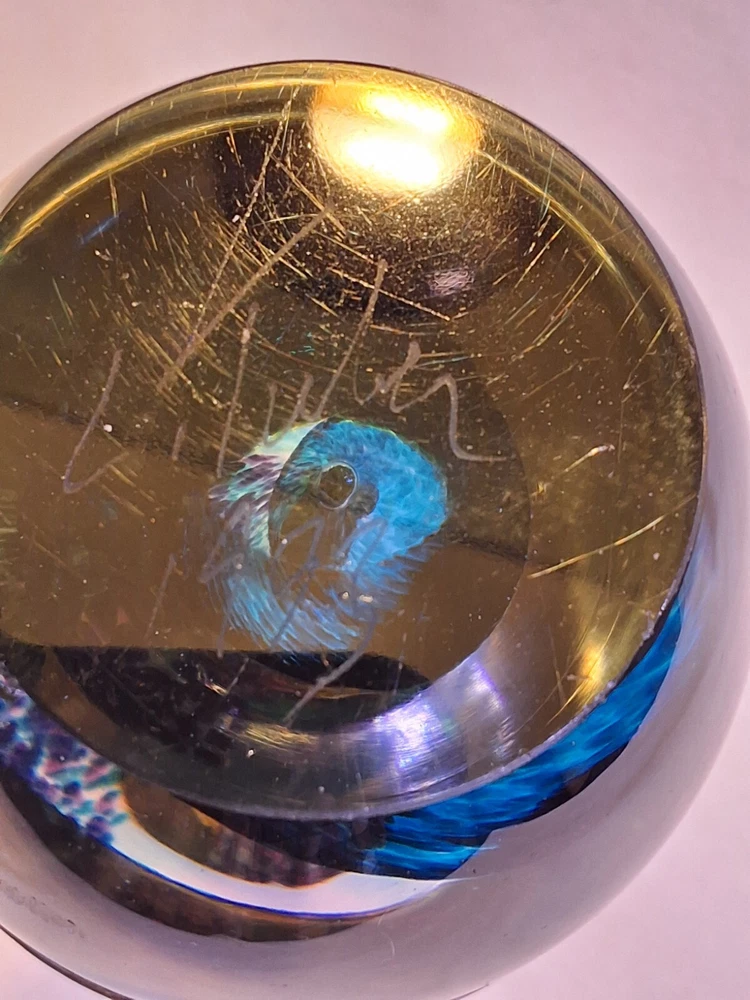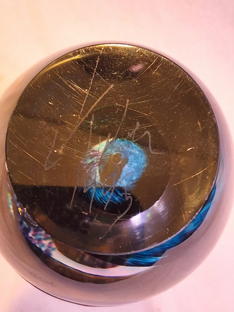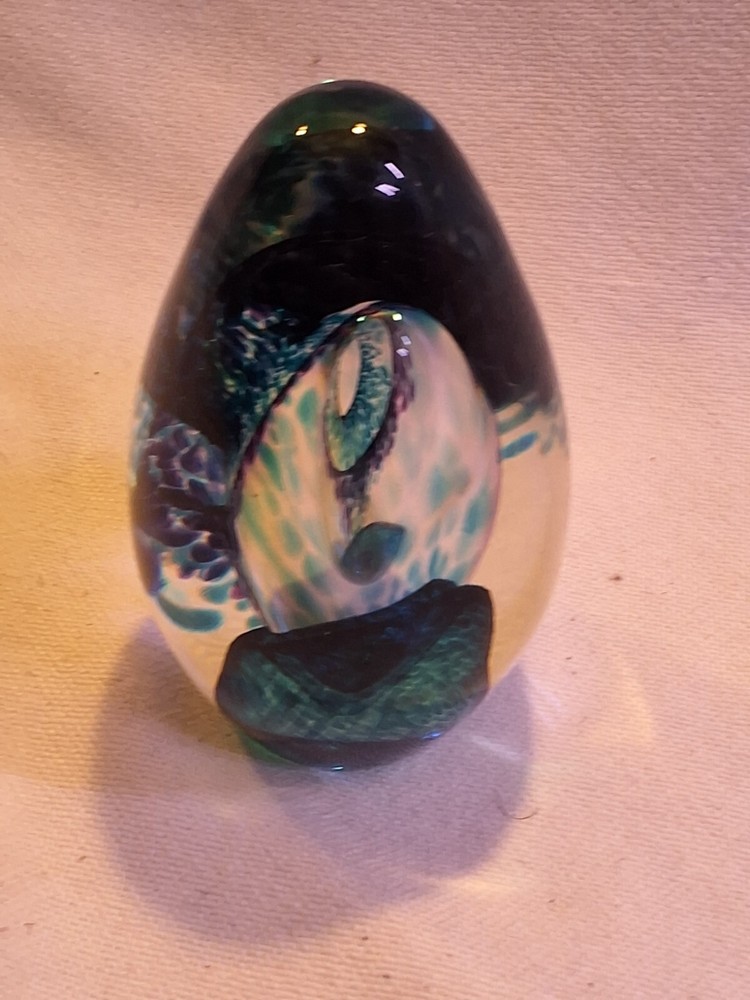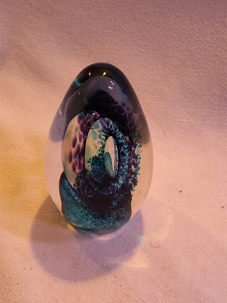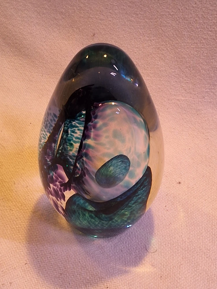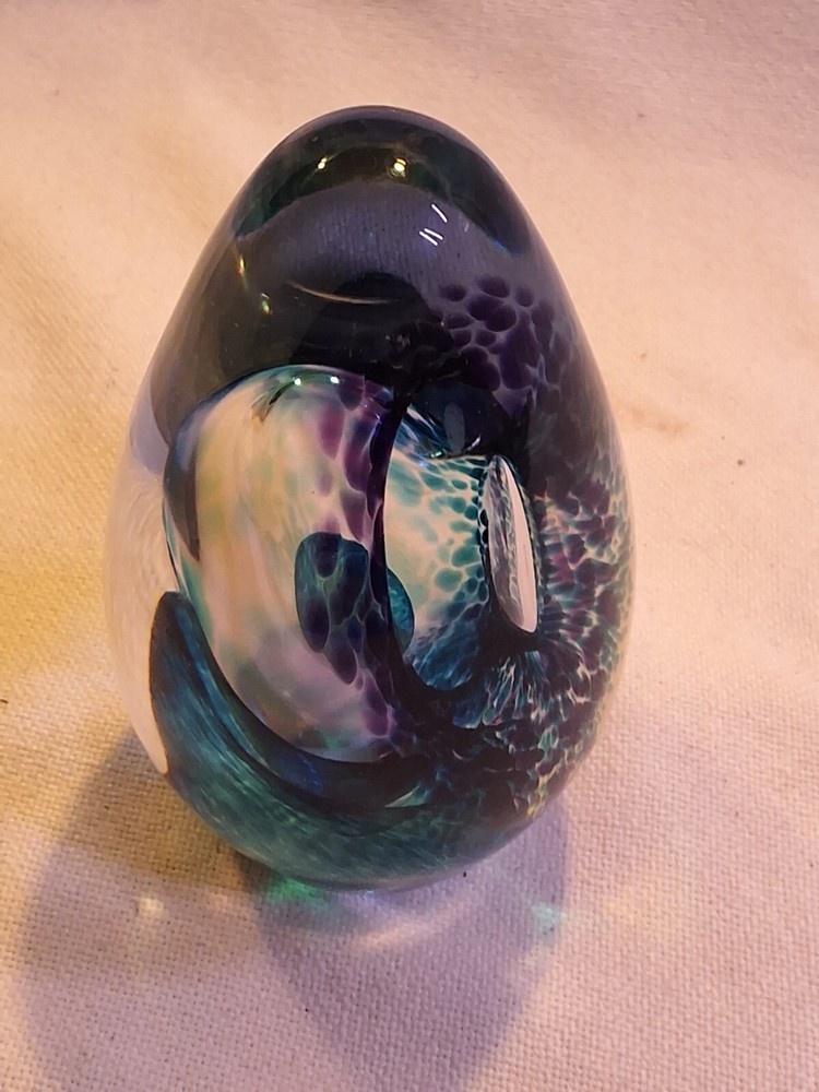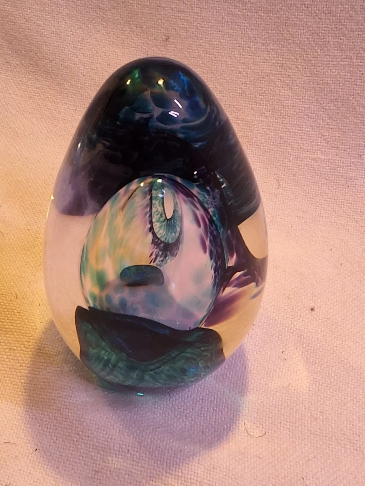 This stunning Lawrence Tuber Art Glass paperweight is a vibrant, eye-catching piece with rich swirls and bold colors. The egg-shaped design feels elegant yet playful, and the artist's signature adds collectible charm. At 4.5 inches, it’s substantial without being bulky—a perfect accent for shelves or desks. The glass has a lovely weight and smooth finish, showcasing expert craftsmanship. A true standout from 1993 that still feels fresh and modern today. Highly recommended for art glass lovers!