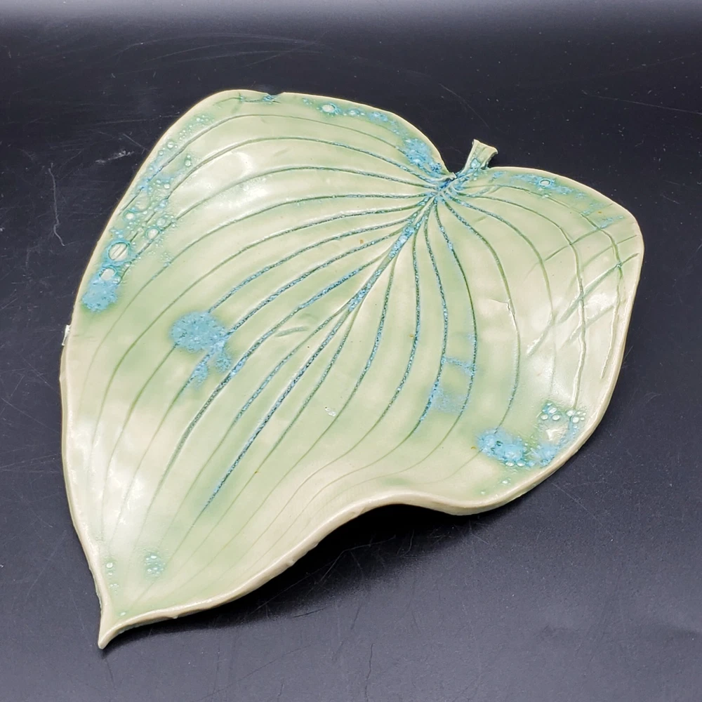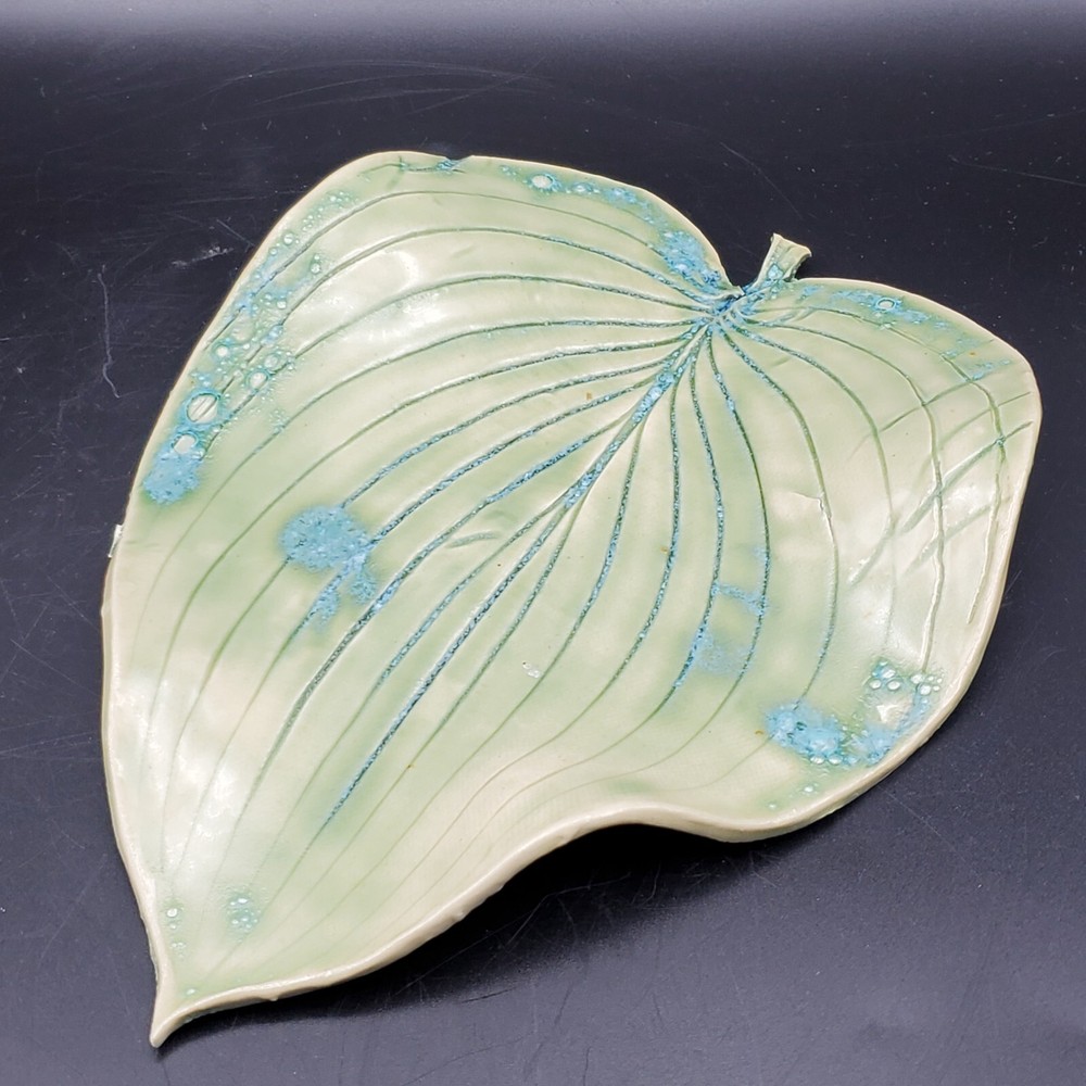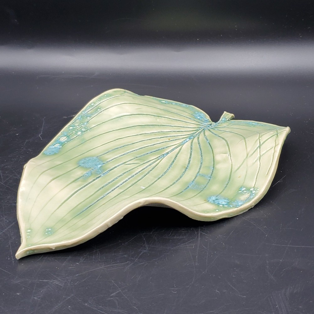This unique blue-green leaf-shaped decorative dish is a handmade studio art pottery piece, signed by the artist. Measuring 9 inches in length and 7 inches in width, it is a vintage item that will add charm to any decor. Crafted in the United States with an ash glaze finish, this Arts & Crafts/Mission Style dish is perfect for all occasions. It is a one-of-a-kind item with an impressed backstamp, featuring hand-painted decorative features. Care instructions include hand wash only. This item is perfect for collectors and lovers of handmade pottery.