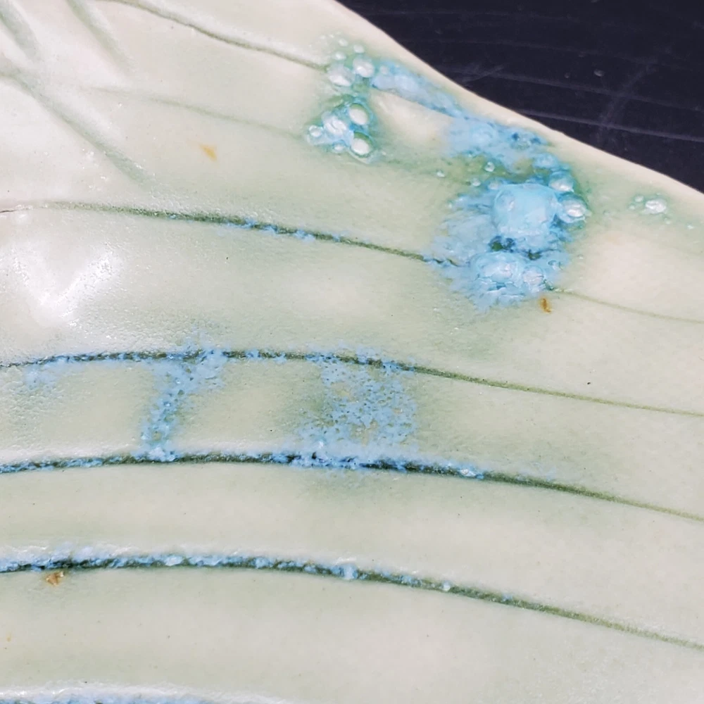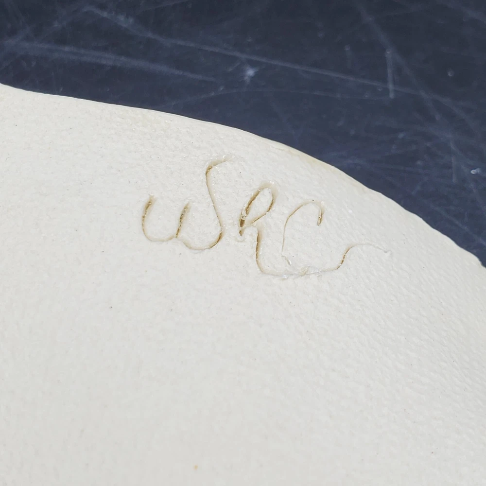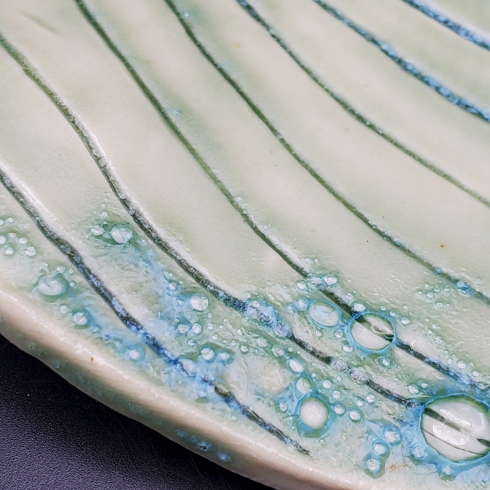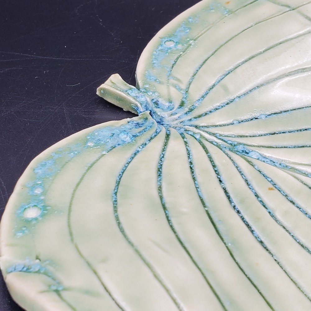 This unique blue-green leaf-shaped decorative dish is a handmade studio art pottery piece, signed by the artist. Measuring 9 inches in length and 7 inches in width, it is a vintage item that will add charm to any decor. Crafted in the United States with an ash glaze finish, this Arts & Crafts/Mission Style dish is perfect for all occasions. It is a one-of-a-kind item with an impressed backstamp, featuring hand-painted decorative features. Care instructions include hand wash only. This item is perfect for collectors and lovers of handmade pottery.