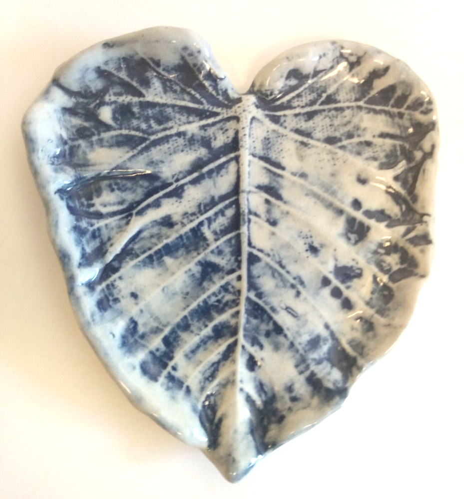 A fun and unusual art pottery handmade blue leaf dish, signed on back. It measures 6" by 6" and 1/2" at the tallest. Good handmade condition - no chips or cracks Please see pictures as that is a part of my description.