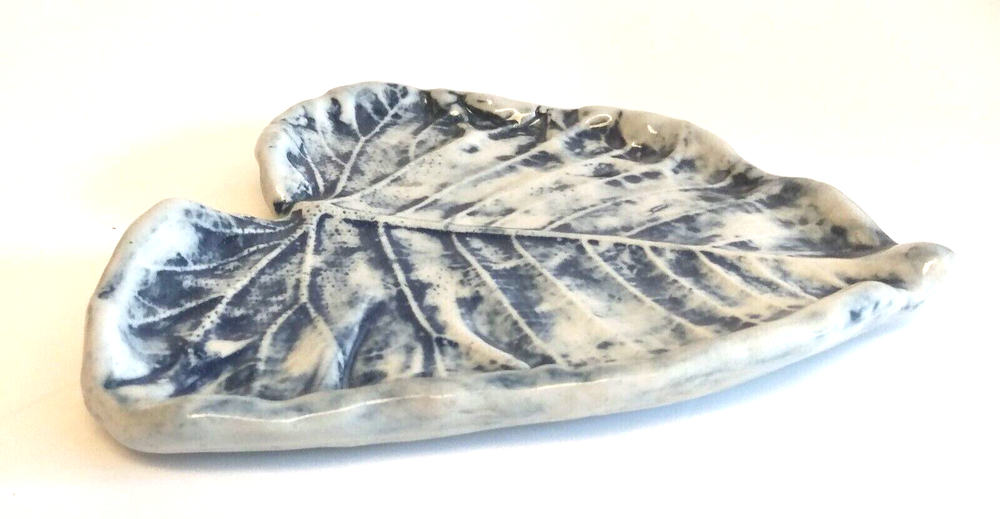A fun and unusual art pottery handmade blue leaf dish, signed on back. It measures 6" by 6" and 1/2" at the tallest. Good handmade condition - no chips or cracks Please see pictures as that is a part ...