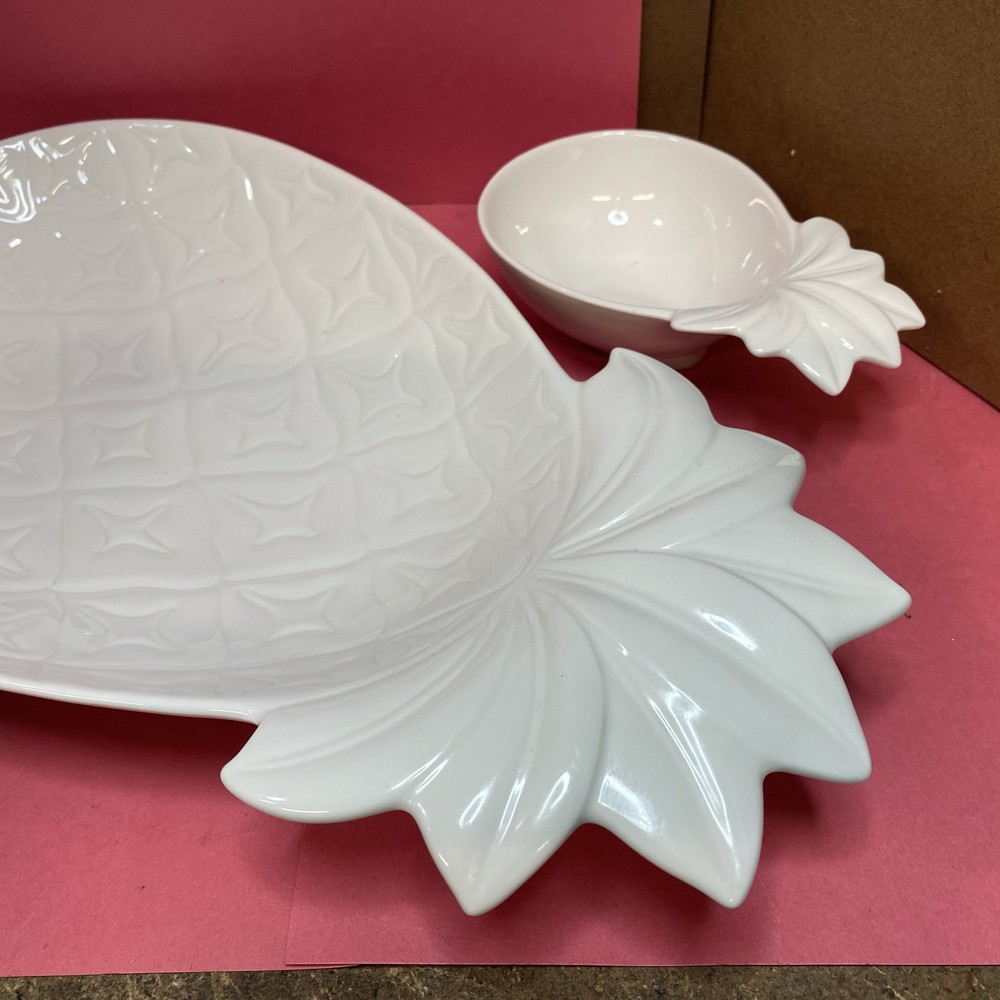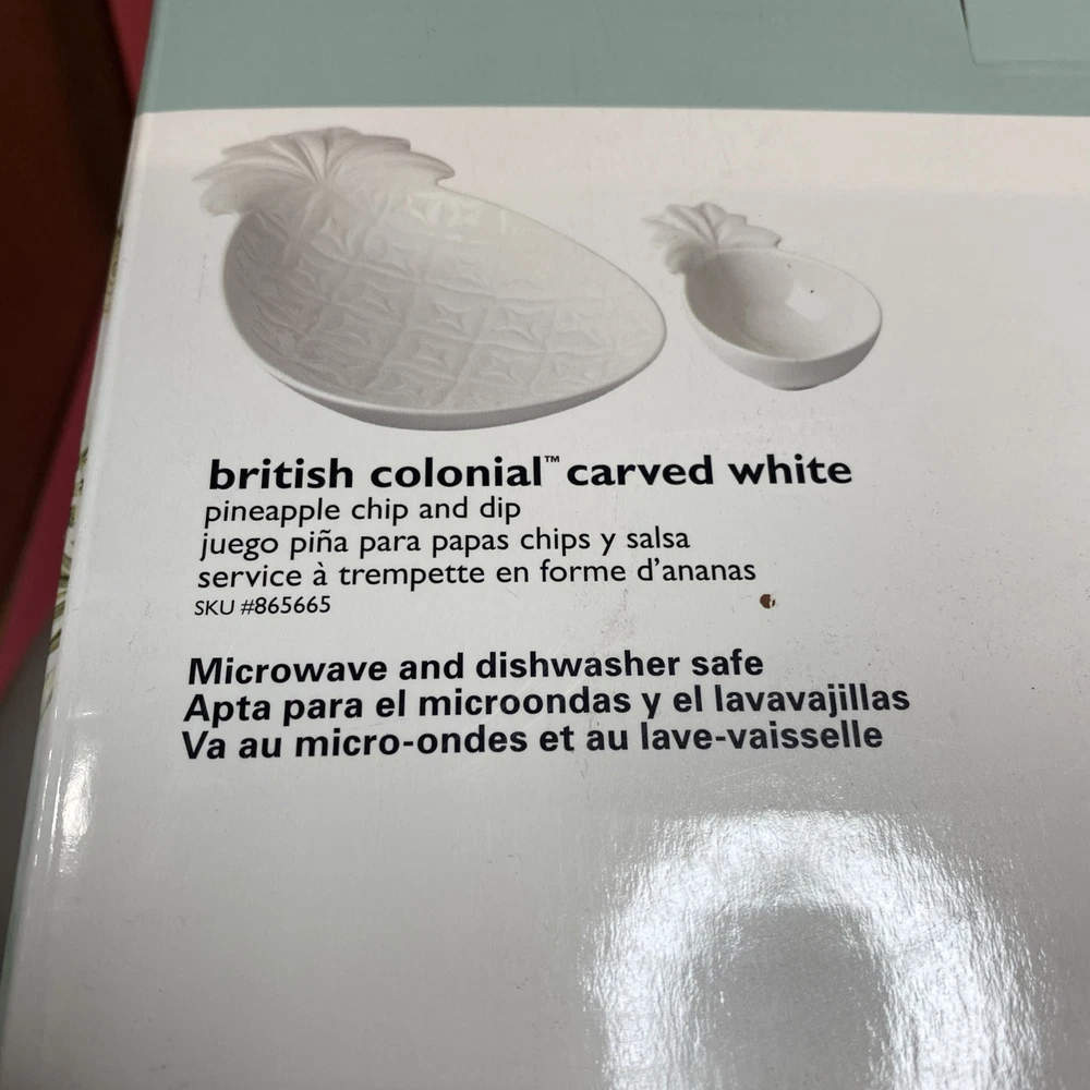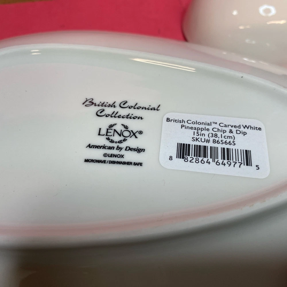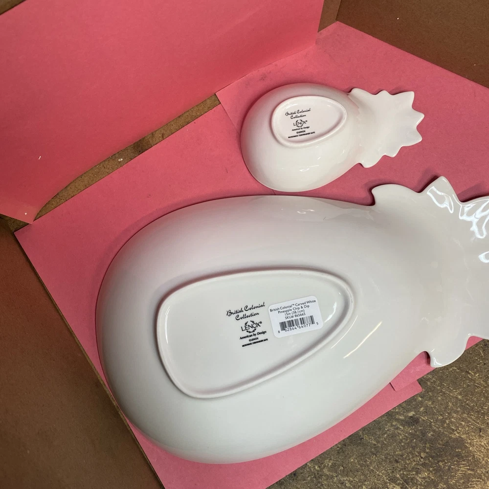 New old stock box has been opened to inspect . Will be packaged safely for shipping. Elevate your hosting game with this exquisite Lenox British Colonial Carved White Pineapple Chip and Dip Set. The set includes a large 15-inch tray and a matching bowl, both adorned with a detailed pineapple pattern. The glossy white ceramic pieces are microwave and dishwasher safe, making them as functional as they are stylish. This original, vintage set from the United States features one compartment and is shaped like a pineapple, adding a touch of colonial style to your entertaining. The set is in its original packaging, making it a great addition to any collection. Care instructions are included, and the set is machine washable for easy upkeep.