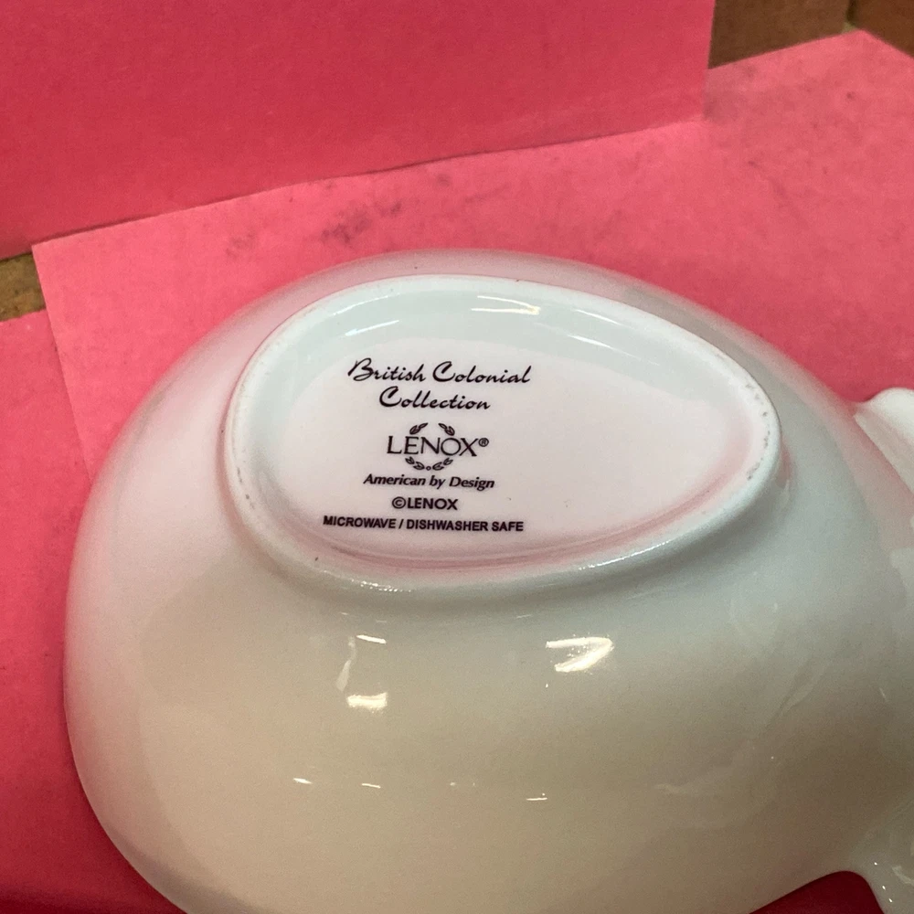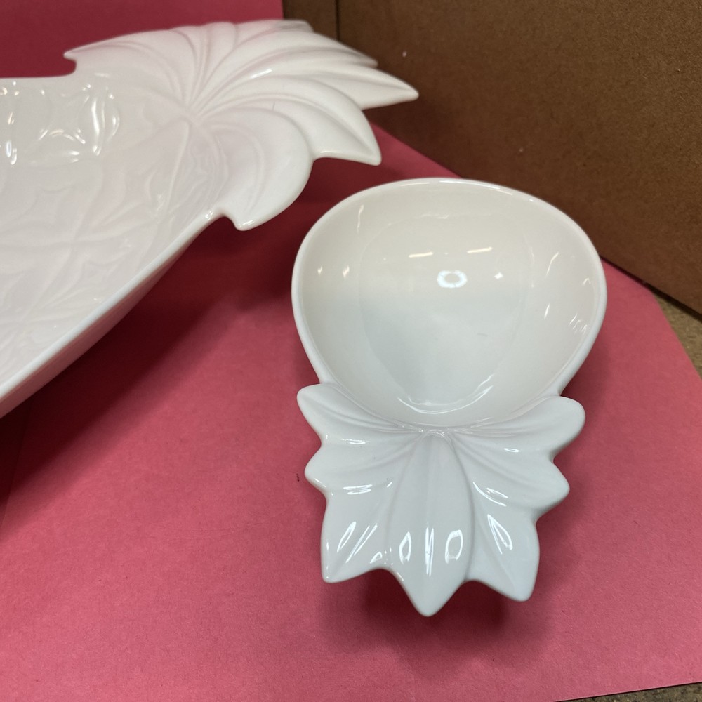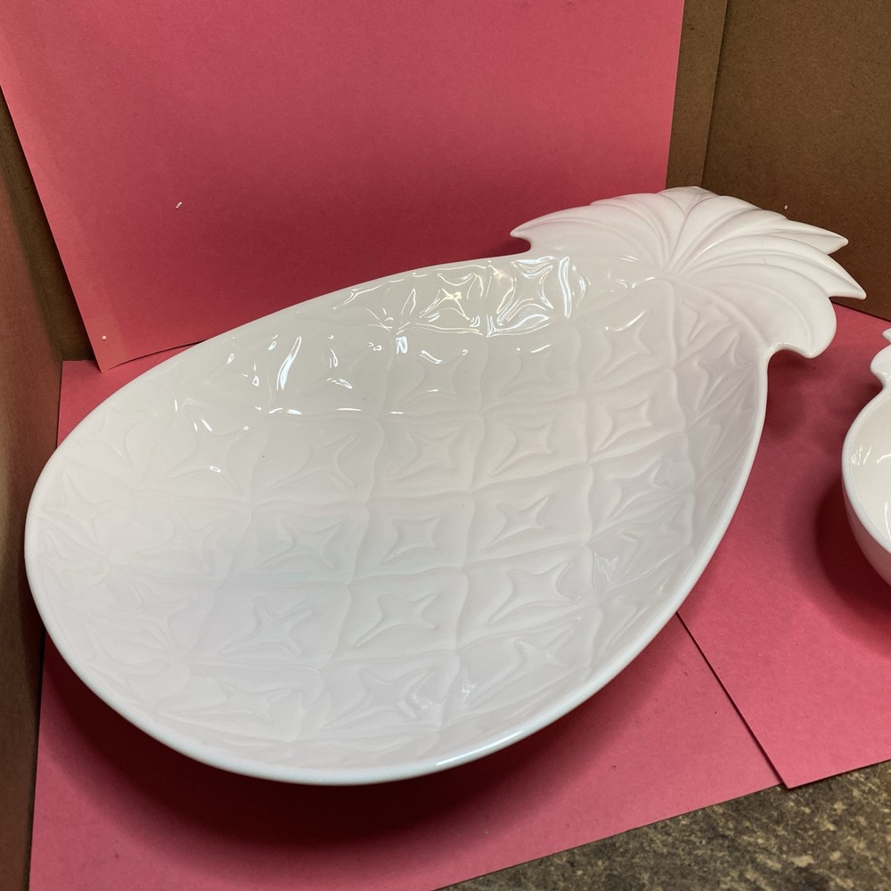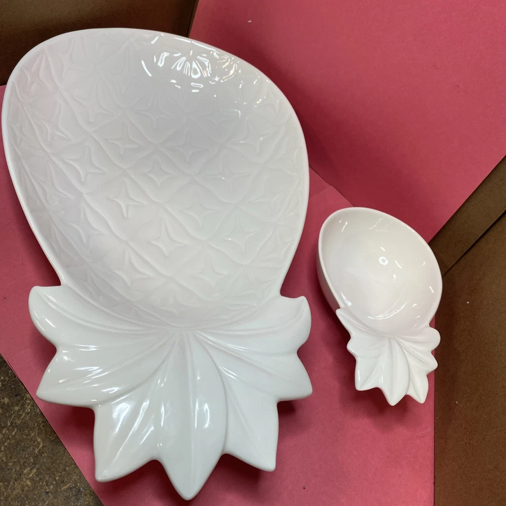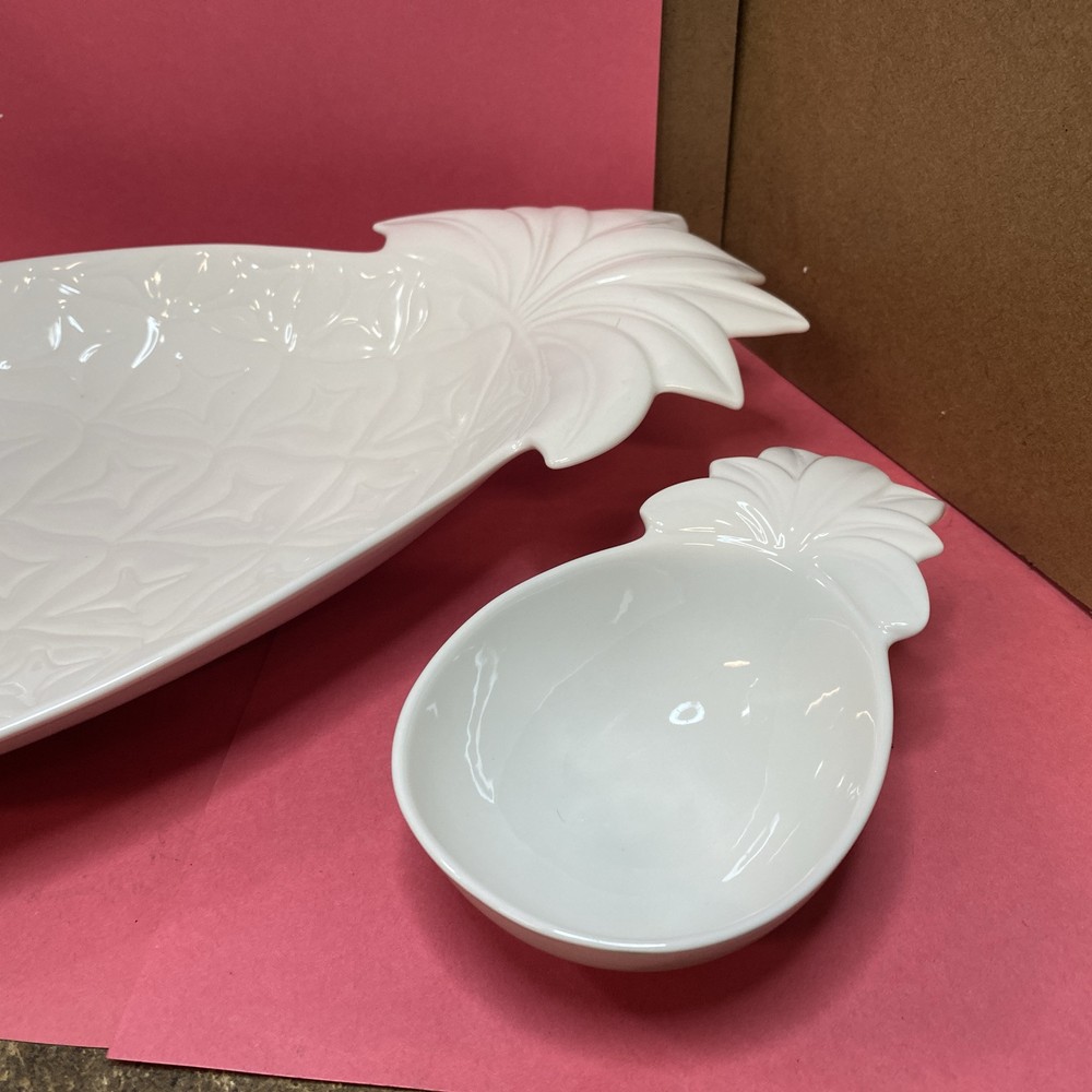 New old stock box has been opened to inspect . Will be packaged safely for shipping. Elevate your hosting game with this exquisite Lenox British Colonial Carved White Pineapple Chip and Dip Set. The set includes a large 15-inch tray and a matching bowl, both adorned with a detailed pineapple pattern. The glossy white ceramic pieces are microwave and dishwasher safe, making them as functional as they are stylish. This original, vintage set from the United States features one compartment and is shaped like a pineapple, adding a touch of colonial style to your entertaining. The set is in its original packaging, making it a great addition to any collection. Care instructions are included, and the set is machine washable for easy upkeep.