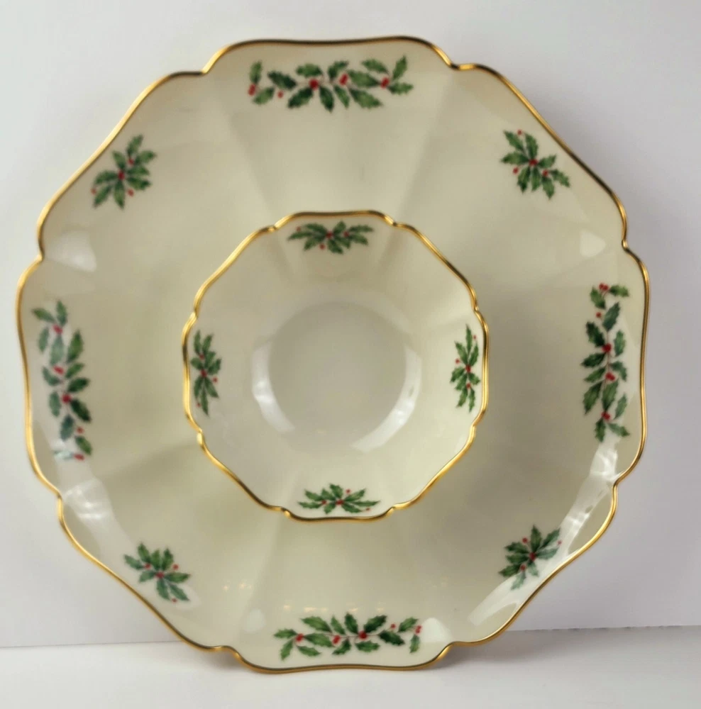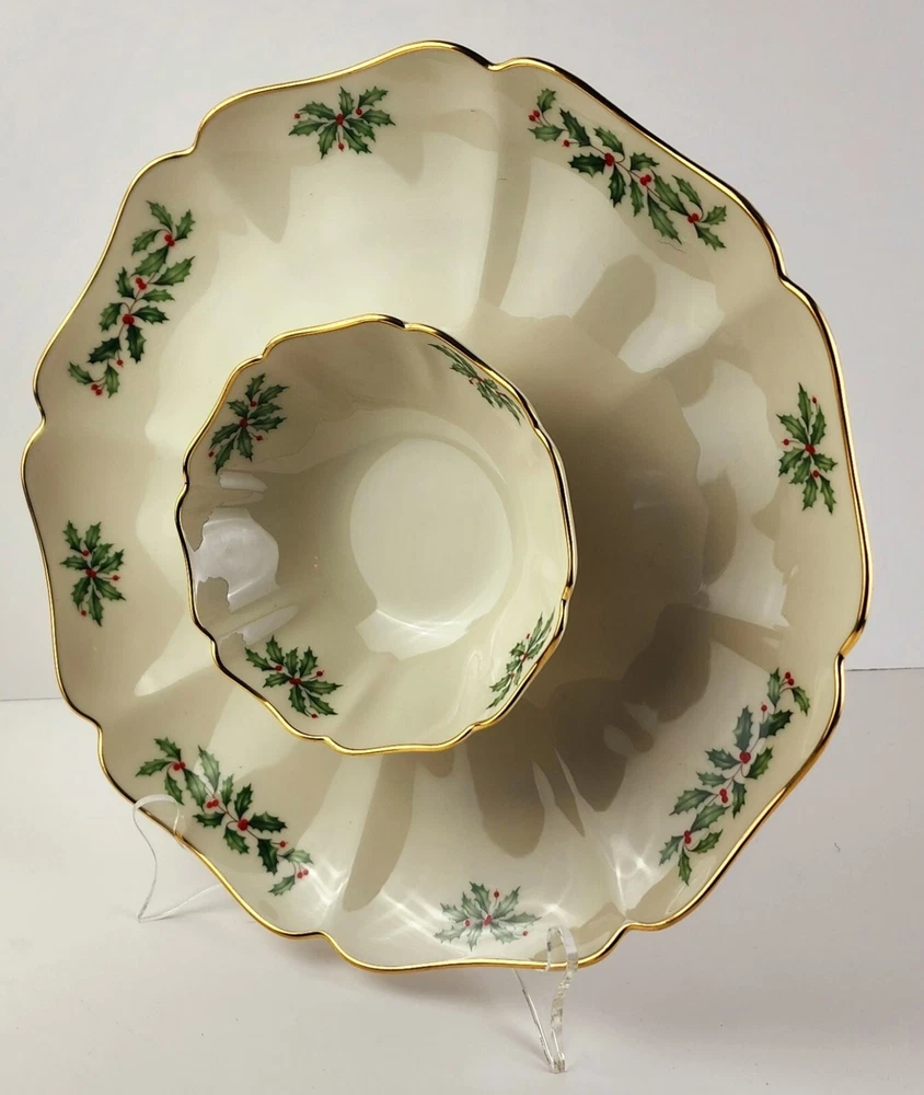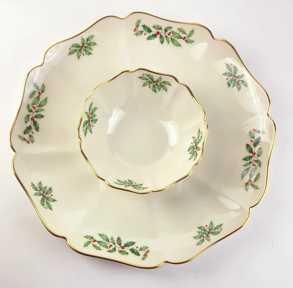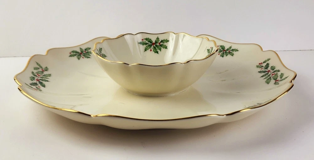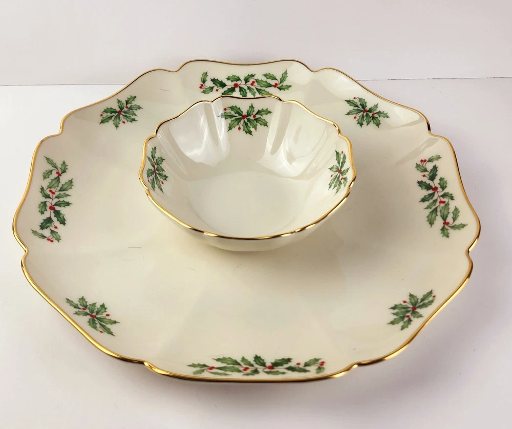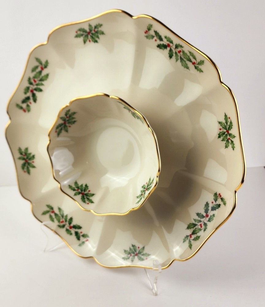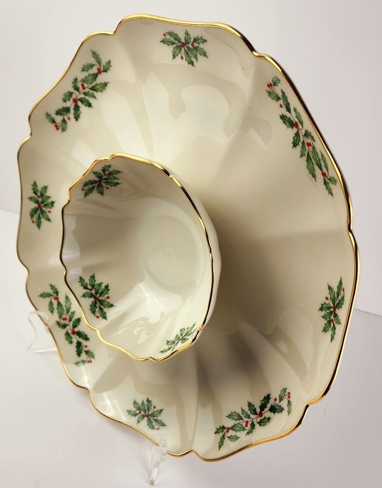 Add a touch of elegance to your holiday table with this beautiful Lenox chip and dip set. The scalloped edge porcelain piece is large in size, measuring 12.25 inches in length and 2.5 inches in height, making it perfect for serving dips and chips. The set comes with one piece chip and dip, and is easy to fill, making it a perfect addition to your dinnerware collection. The ivory color and rounded shape of the chip and dip set make it a versatile piece that can be used during the holidays, Christmas, or any other special occasion. The set is an original Lenox piece, manufactured in the United States between 1990 and 1999, and features a vintage design that is sure to impress your guests. Get ready to entertain your guests with this exquisite chip and dip set that is both functional and stylish.