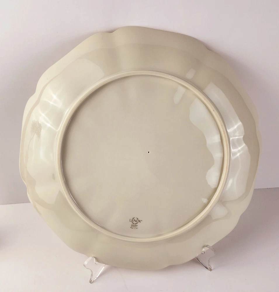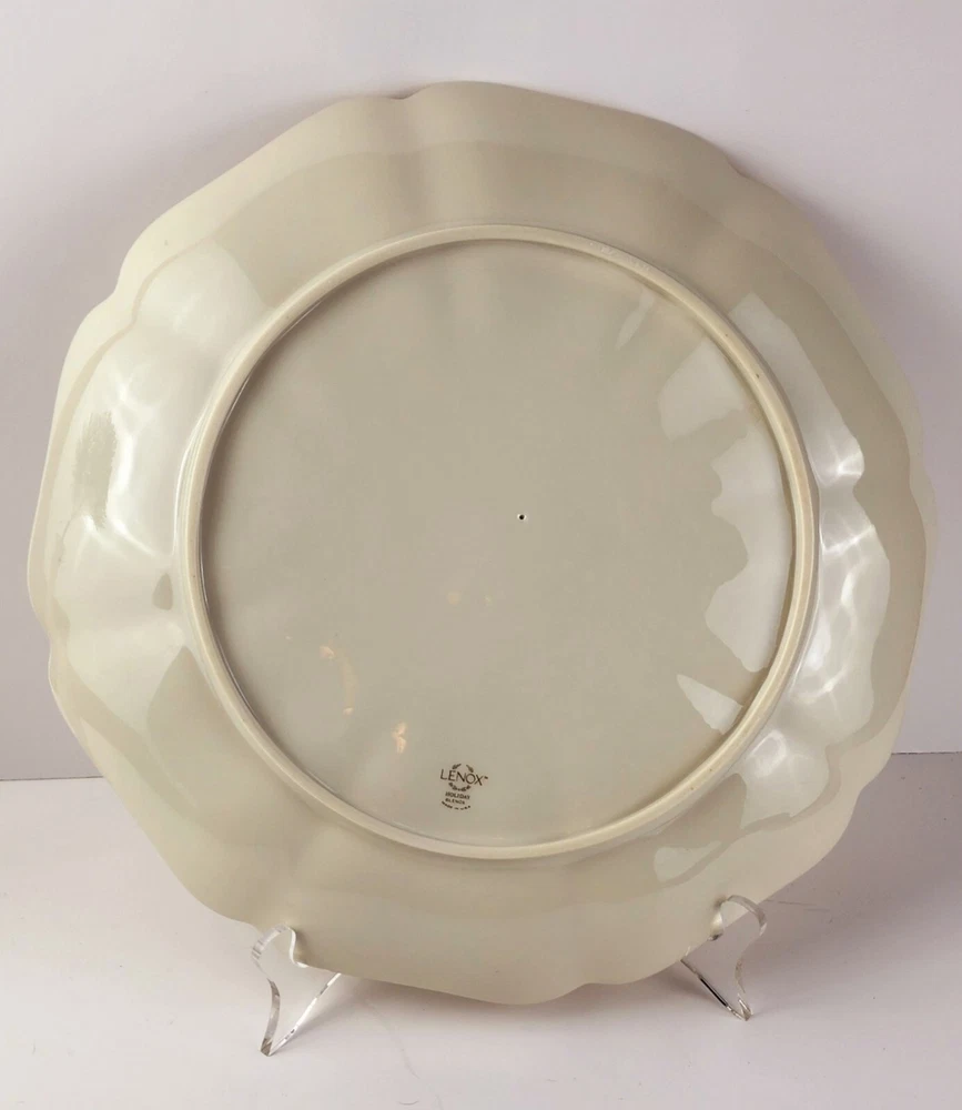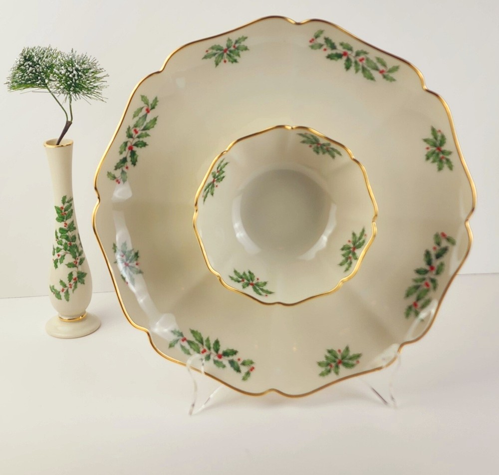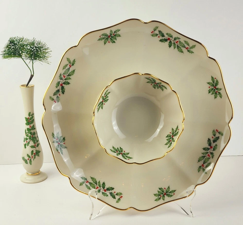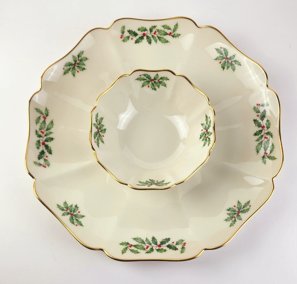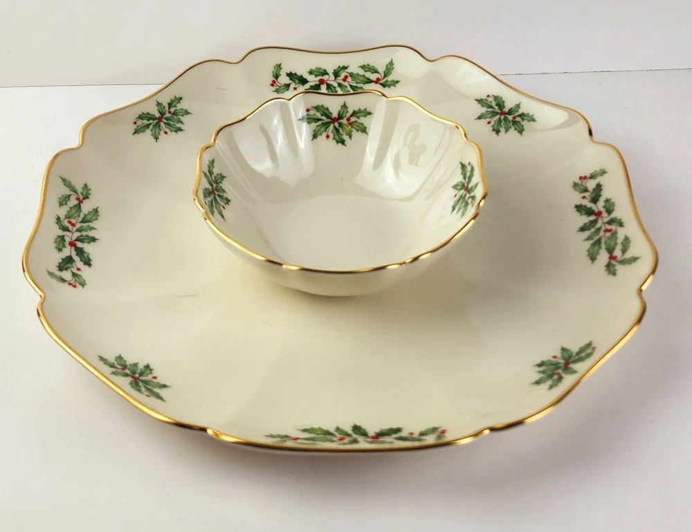Add a touch of elegance to your holiday table with this beautiful Lenox chip and dip set. The scalloped edge porcelain piece is large in size, measuring 12.25 inches in length and 2.5 inches in height, making it perfect for serving dips and chips. The set comes with one piece chip and dip, and is easy to fill, making it a perfect addition to your dinnerware collection. The ivory color and rounded shape of the chip and dip set make it a versatile piece that can be used during the holidays, Christmas, or any other special occasion. The set is an original Lenox piece, manufactured in the United States between 1990 and 1999, and features a vintage design that is sure to impress your guests. Get ready to entertain your guests with this exquisite chip and dip set that is both functional and stylish.