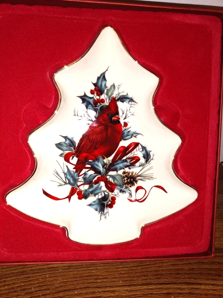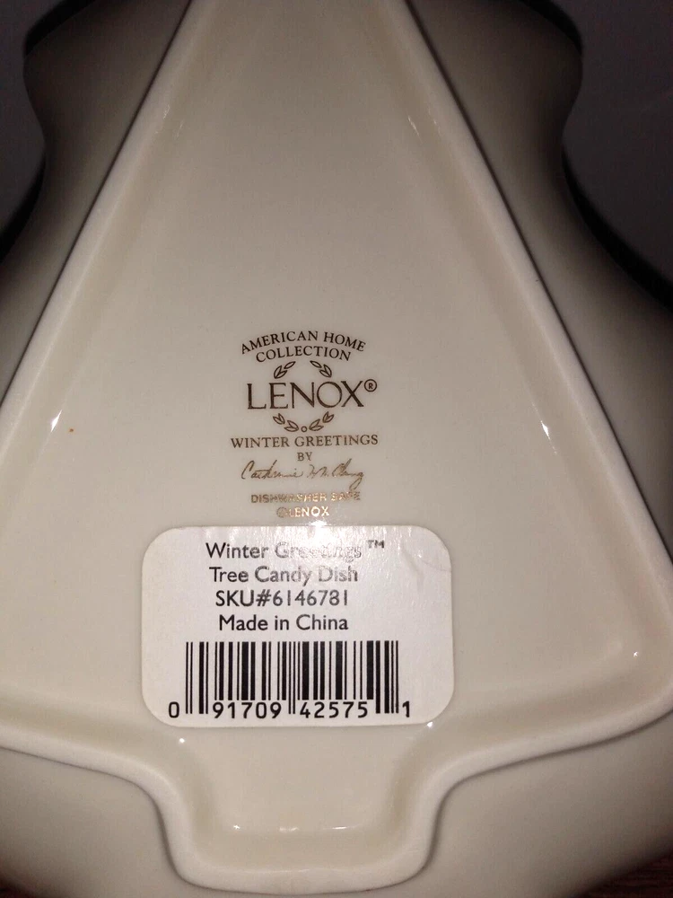 This Lenox candy or nut dish is the perfect addition to your holiday table. The dish is shaped like a Christmas tree and features a Winter Greetings pattern with a red cardinal and pine branches. It has a standard capacity and is made of glazed ceramic material. The dish is an original studio pottery production style and has a white color finish. It is 7.5" in length and 7.0" in width. The item is not antique or vintage, but it is an original Lenox product with a barcode sticker. It is ideal for serving candy or nuts and is a great gift option.
