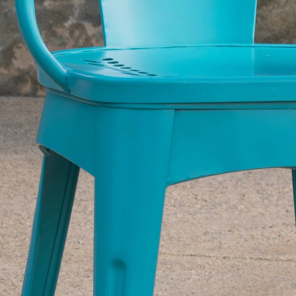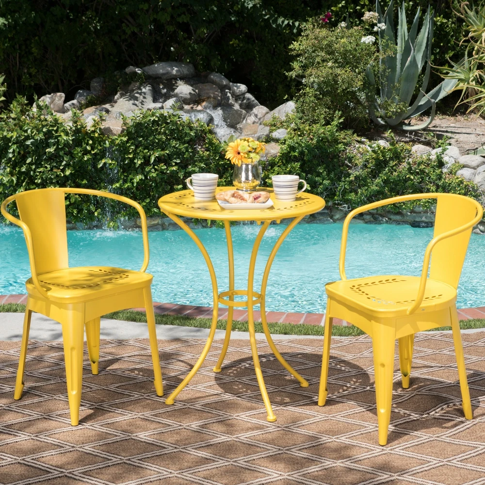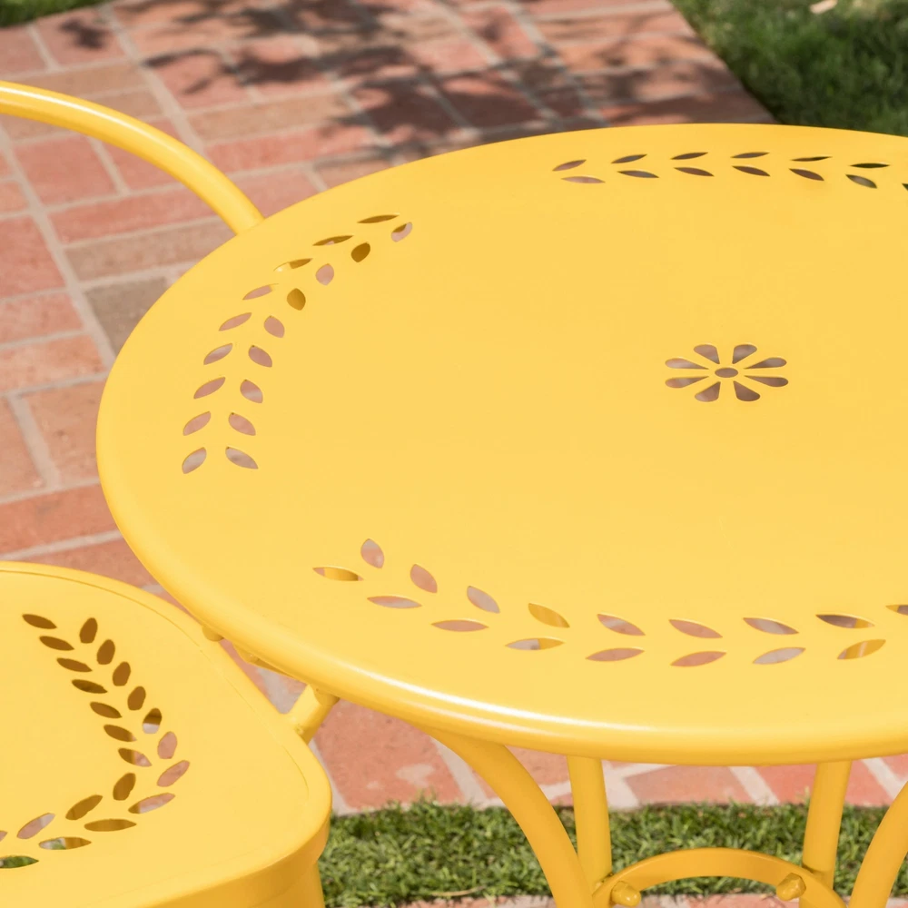 Cheerful and lighthearted in its whimsical styling this chat set will entice any passerby to pause for a while and just be. Product Details Includes: One (1) Bistro Table, and Two (2) Chairs Material: Iron Finish available in: Matte Teal or Matte Yellow Assembly Required Dimensions: Table Dimensions: 24.00"D x 24.00"W x 29.25"H Chair Dimensions: 21.25"D x 20.50"W x 29.50"H