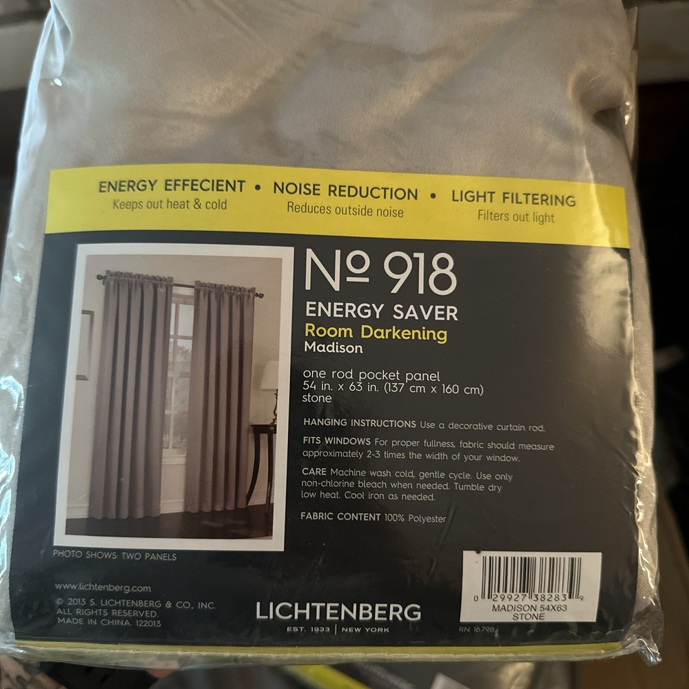 Sun Zero Lichtenberg Room Darkening Window Curtain. Includes 1 solid stone panel measuring 54" wide and 63" long. The modern curtains feature a rod pocket heading for easy installation. Made of polyester, these panels are machine washable and suitable for any room indoors.