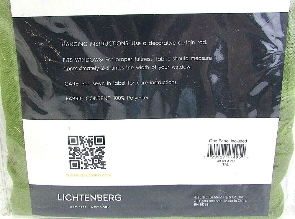 Lichtenberg Sun Zero Avocado Decorative Energy Efficient Curtain Panel (One Panel) NEW 40" x 63" See Shipping Below TO CONTINENTAL USA ONLY It is our intent to establish many satisfied customers WeSell4Less1 is a part of our second business, KitchenGuys-USA . You can see all of our positive feedback by checking both of our accounts. It is our intent to establish many satisfied customers. Descriptions are made as accurately as possible. Our intention is not deceive anyone, we try to give you as much information as possible. While we do not accept returns, we do guarantee that the pictured product is the product you will receive. In the event of a damaged shipment or defective product we will gladly work with you to resolve any problems. Winning bidder to pay for shipping charges if applicable. All shipments are sent by USPS or UPS depending on size and value. All shipping/handling charges are for Continental USA only. Please inquire for international shipping charges. Please resolve questions via messages before purchase. Returns are not accepted unless product is damaged or defective. Wesell4less1 is an independent reseller and not an authorized dealer of any manufacturer or for any product. All products are sold outside of manufacturers? authorized retail channels and manufacturers? warranties may or may not apply. Any representation of product trademarks, brands, model names, components and descriptions is provided solely for consumers? informational purposes and not meant to suggest wesell4less1 has a relationship with any manufacturers or trademark owners. All products sales are made without express or implied warranties of any kind or nature. Thank You For Looking, Please Check Out Our Other Listings Payment Options: PayPal Shipping Options: Shipping Carrier Economy: Ship I will ship to: Continental USA <