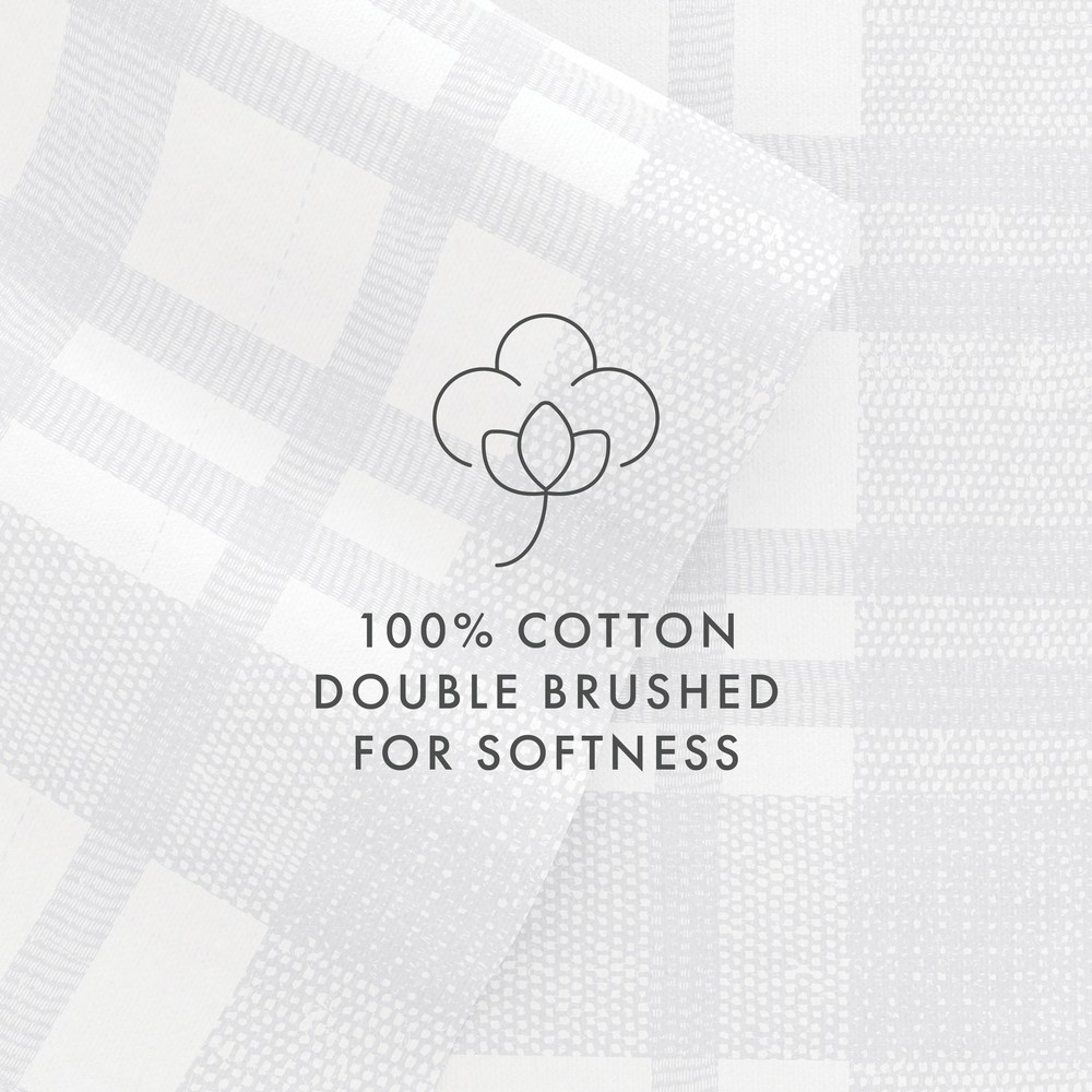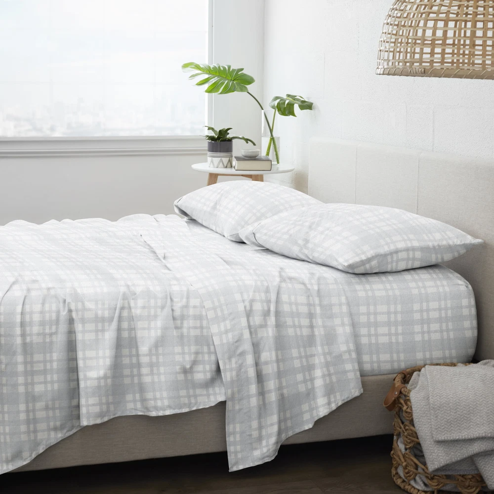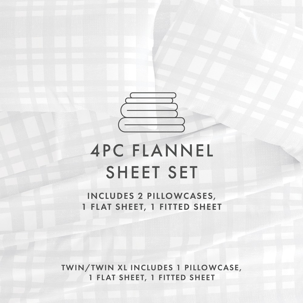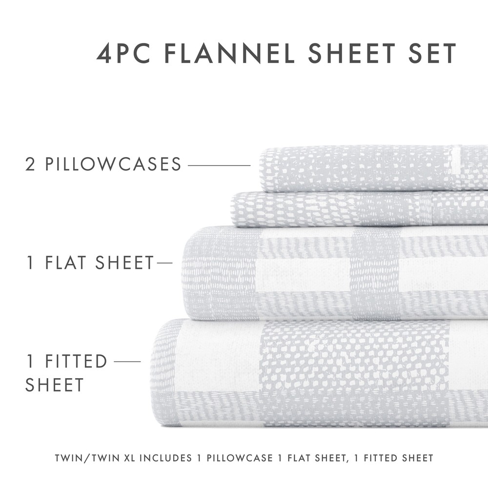 Treat yourself to a comfy new set of sheets with this flannel sheet set. Made from 100% cotton, each piece is double brushed for an ultra soft and cozy feel, making it the perfect new addition to your room! FEATURES Deep pockets fit mattresses up to 16 inches Wrinkle-resistant to keep your bed looking crisp Superior weave for durability and a cozy, soft touch Fabric Contents: 100% Cotton Easy Care: Machine wash cold on delicate cycle. Do not bleach. Tumble dry low. Remove promptly. 8 beautiful patterns and 6 solid colors available to choose from: Blush, Ivory, Gray, Light Gray, Light Navy and White SIZE GUIDE CALIFORNIA KING: 1 flat sheet (102" x 105"), 1 fitted sheet (72" x 84" x 16") and 2 King pillowcases (20" x 40") KING: 1 flat sheet (108" x 102"), 1 fitted sheet (78" x 80" x 16") and 2 King pillowcases (20" x 40") QUEEN: 1 flat sheet (90" x 102"), 1 fitted sheet (60" x 80" x 14") and 2 pillowcases (20" x 30") FULL: 1 flat sheet (81" x 96"), 1 fitted sheet (54" x 75" x 14") and 2 pillowcases (20" x 30") TWIN: 1 flat sheet (66" x 96" Flat Sheet), 1 fitted sheet (39" x 75" x 14") and 1 pillowcase (20" x 30")