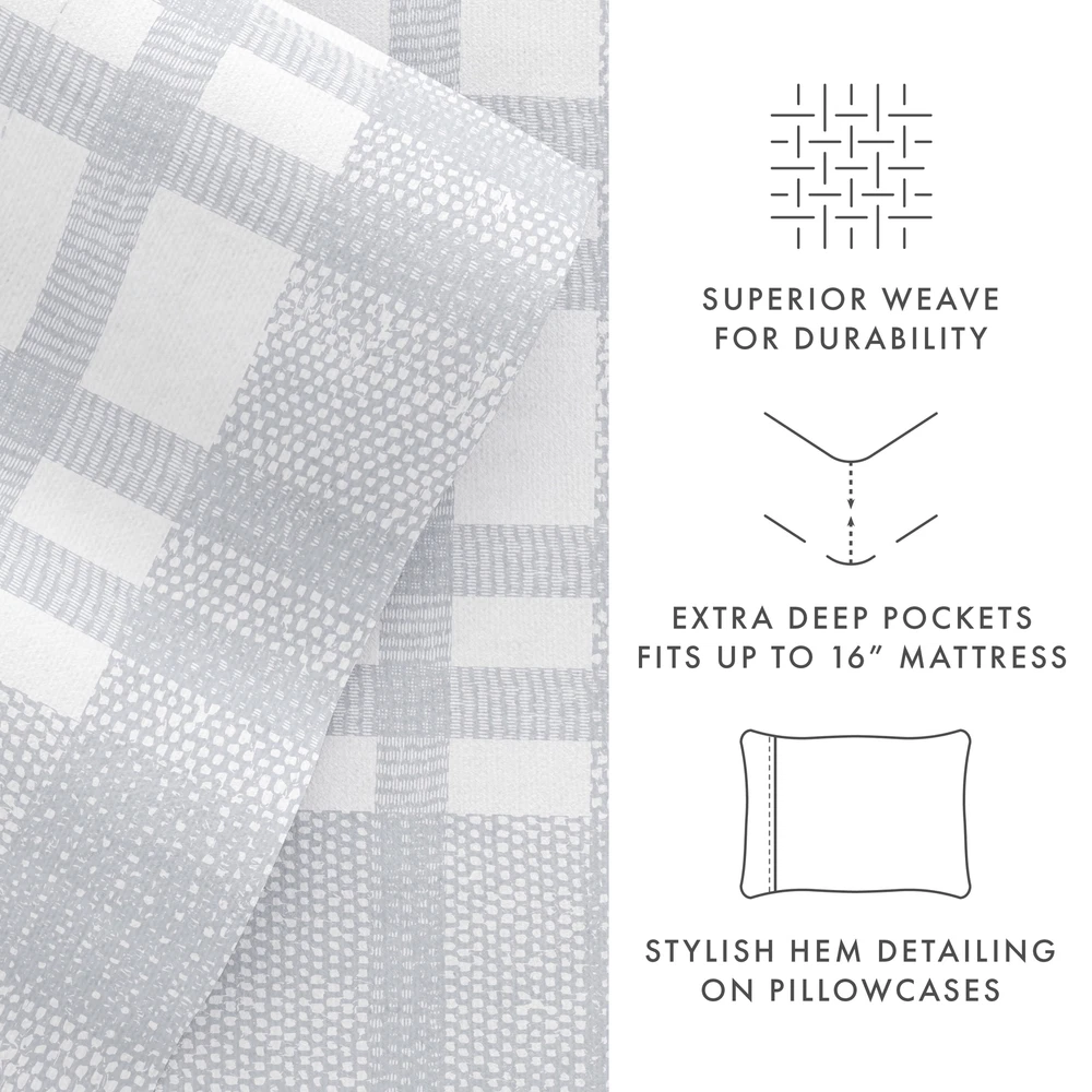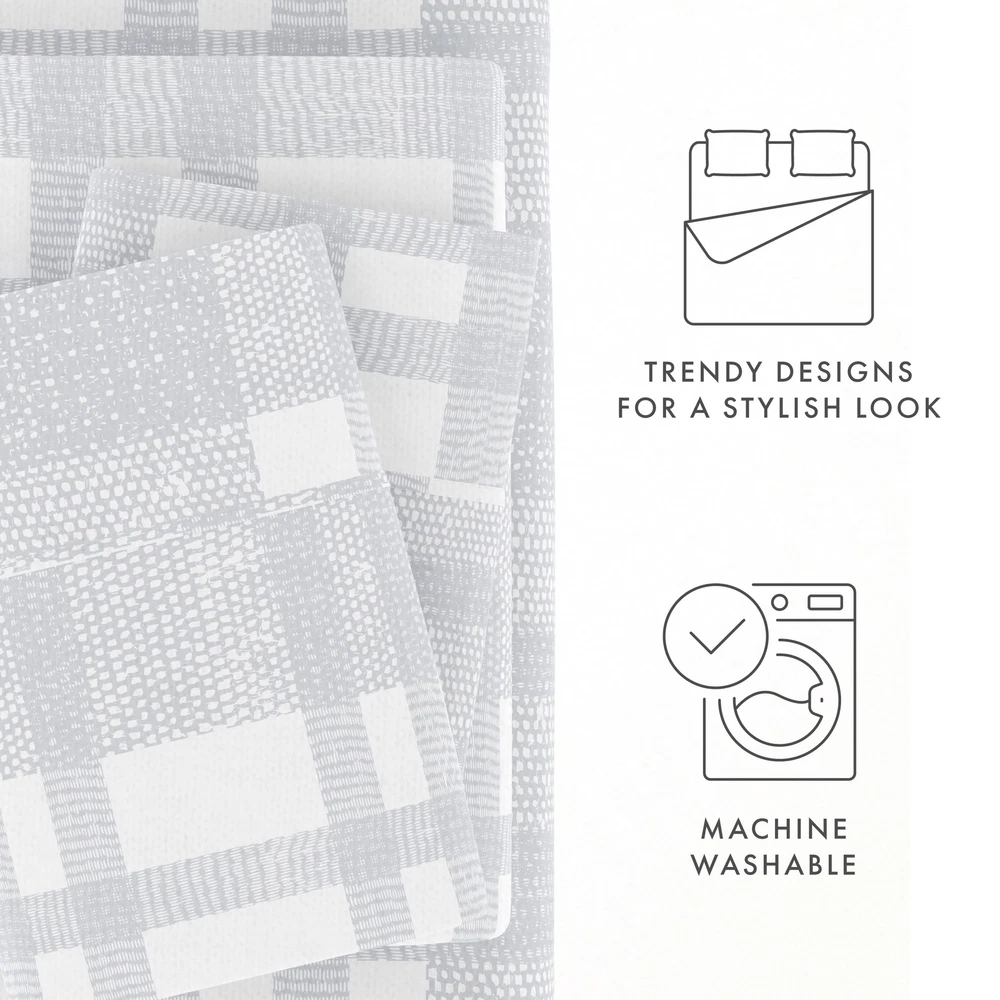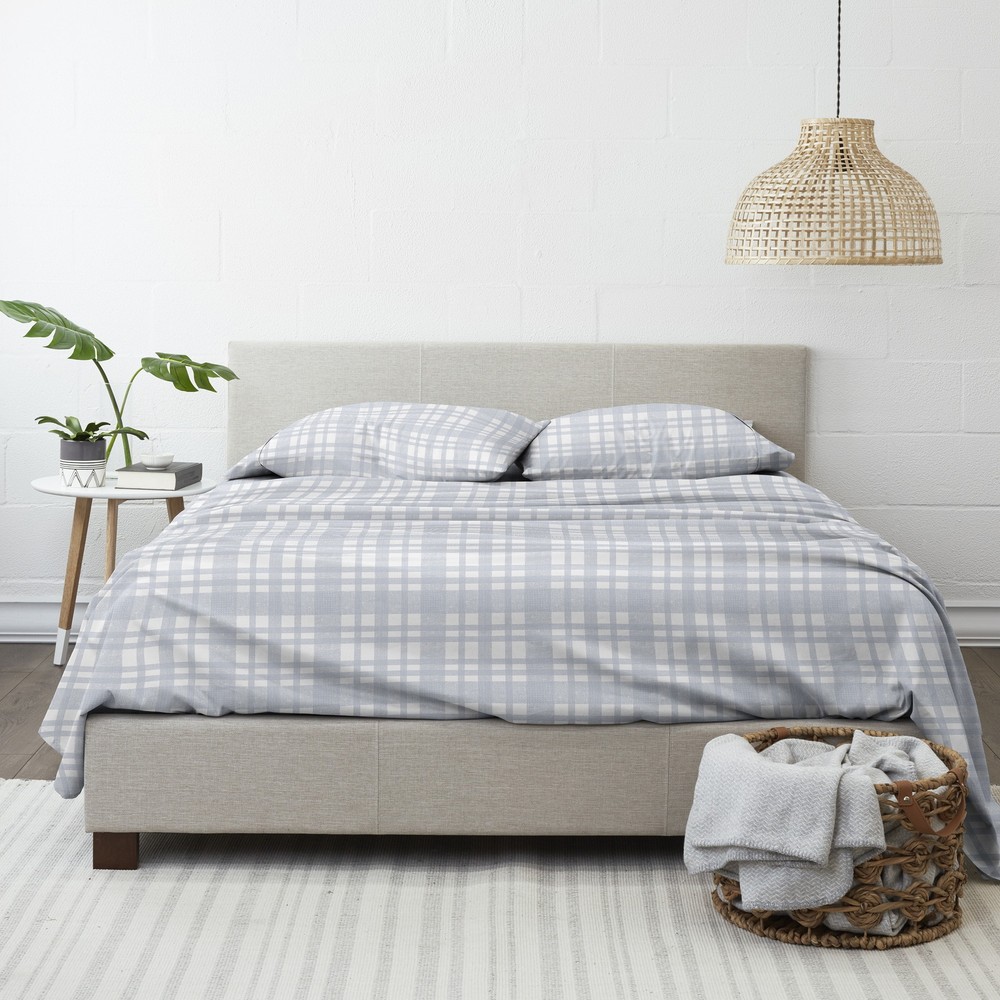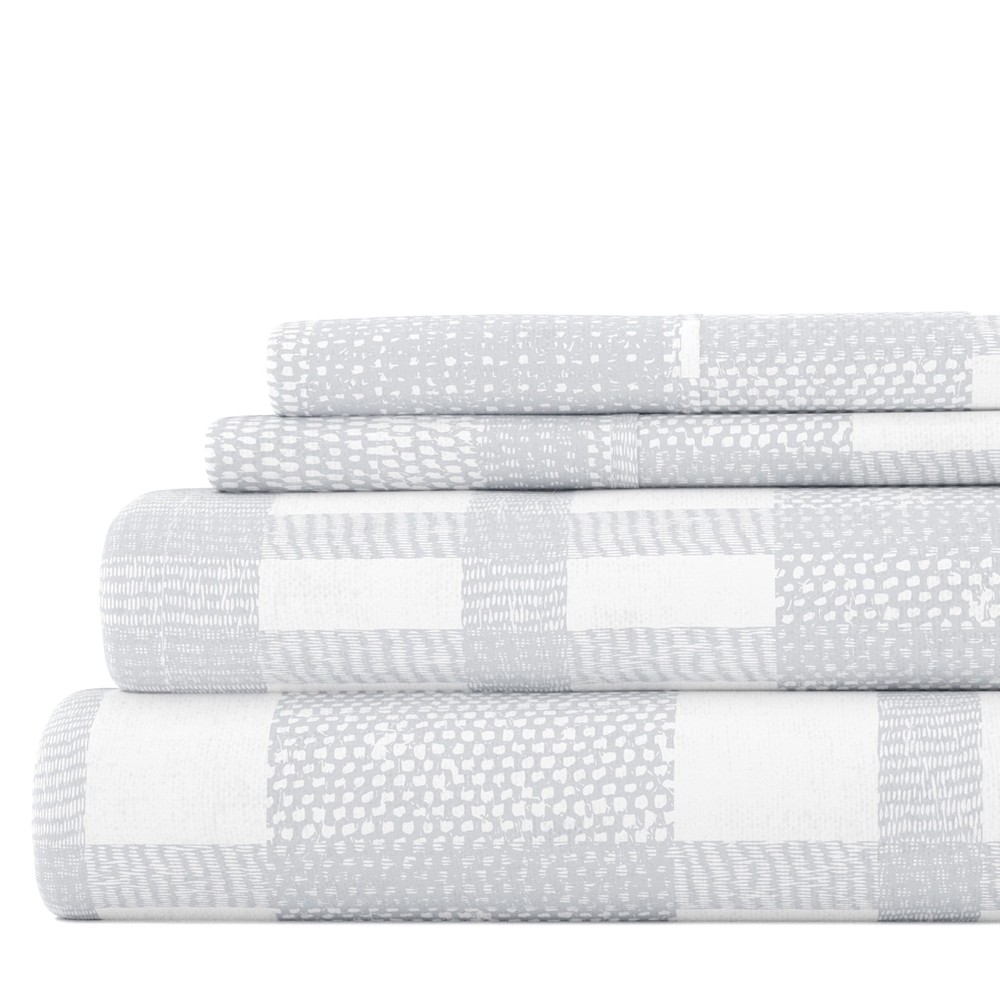 Treat yourself to a comfy new set of sheets with this flannel sheet set. Made from 100% cotton, each piece is double brushed for an ultra soft and cozy feel, making it the perfect new addition to your room! FEATURES Deep pockets fit mattresses up to 16 inches Wrinkle-resistant to keep your bed looking crisp Superior weave for durability and a cozy, soft touch Fabric Contents: 100% Cotton Easy Care: Machine wash cold on delicate cycle. Do not bleach. Tumble dry low. Remove promptly. 8 beautiful patterns and 6 solid colors available to choose from: Blush, Ivory, Gray, Light Gray, Light Navy and White SIZE GUIDE CALIFORNIA KING: 1 flat sheet (102" x 105"), 1 fitted sheet (72" x 84" x 16") and 2 King pillowcases (20" x 40") KING: 1 flat sheet (108" x 102"), 1 fitted sheet (78" x 80" x 16") and 2 King pillowcases (20" x 40") QUEEN: 1 flat sheet (90" x 102"), 1 fitted sheet (60" x 80" x 14") and 2 pillowcases (20" x 30") FULL: 1 flat sheet (81" x 96"), 1 fitted sheet (54" x 75" x 14") and 2 pillowcases (20" x 30") TWIN: 1 flat sheet (66" x 96" Flat Sheet), 1 fitted sheet (39" x 75" x 14") and 1 pillowcase (20" x 30")